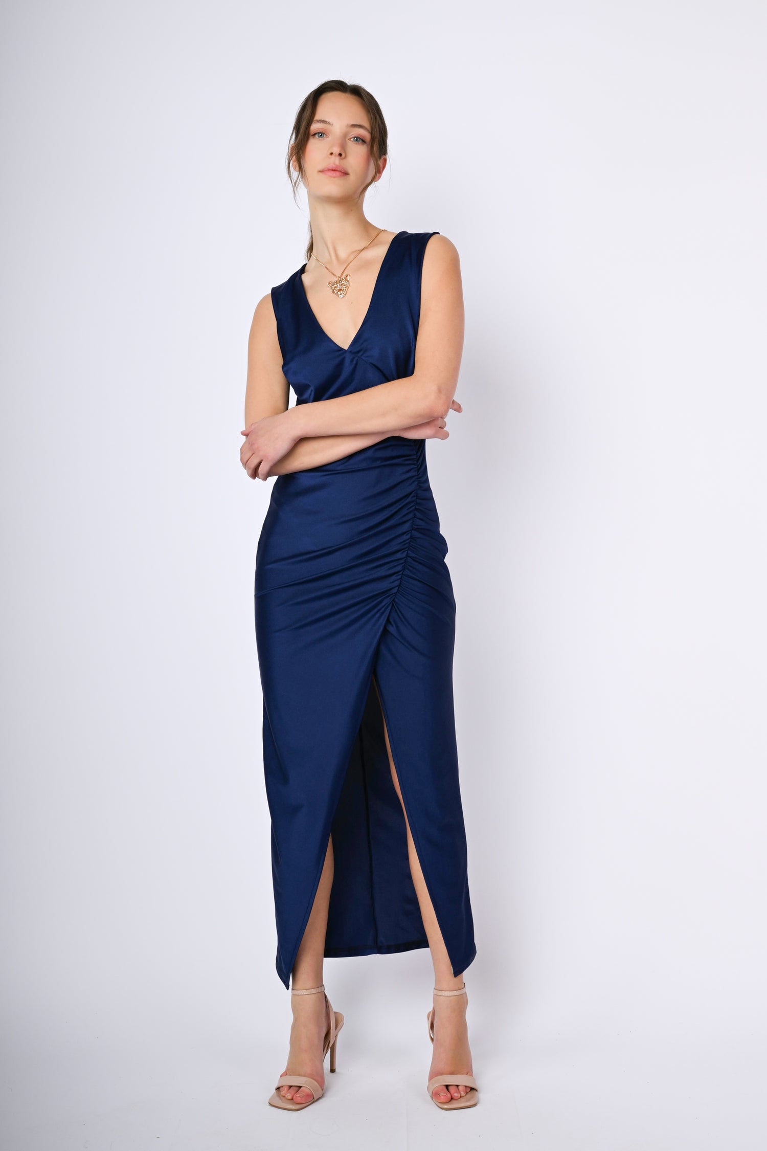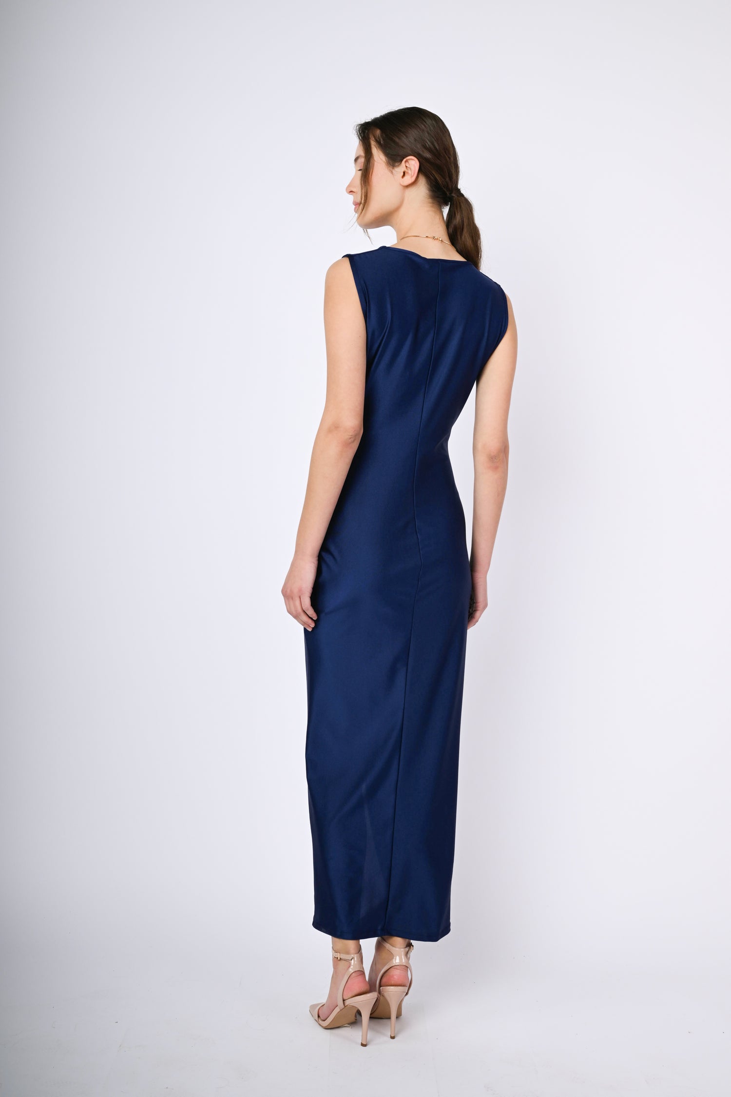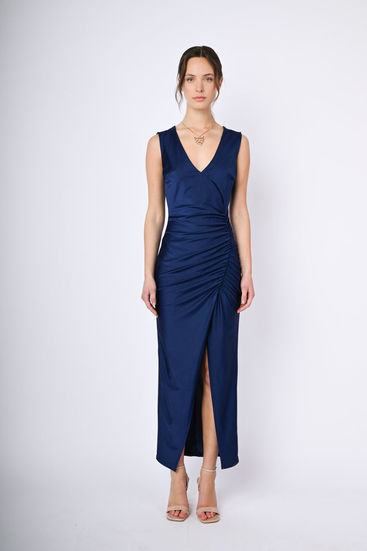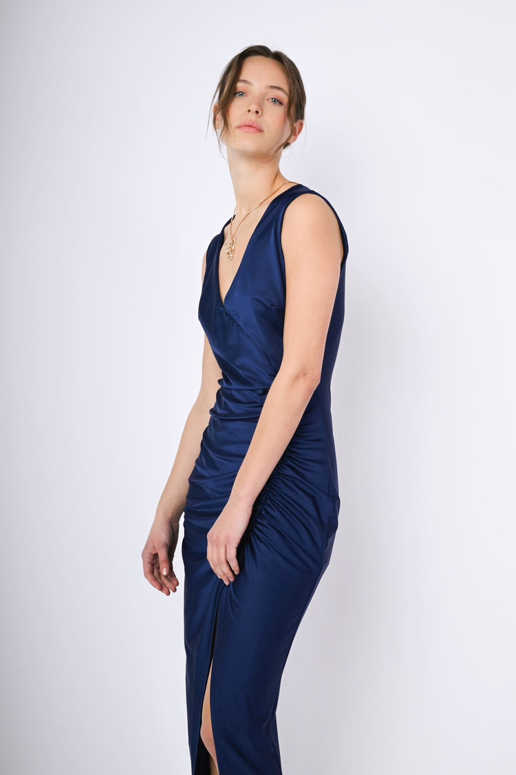Abito lungo in raso stretch blu con scollo a V, silhouette aderente con drappeggio e spacco frontali.