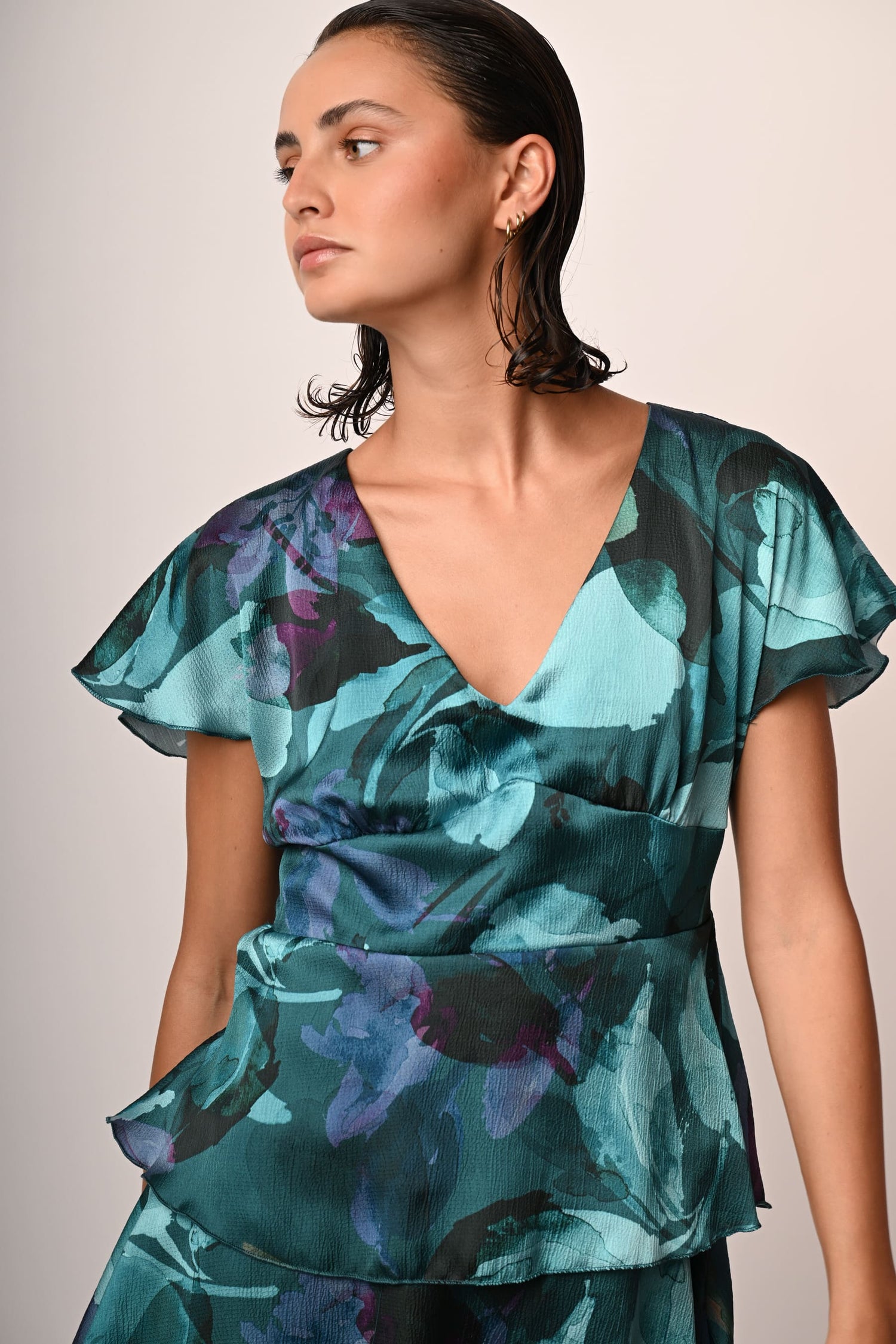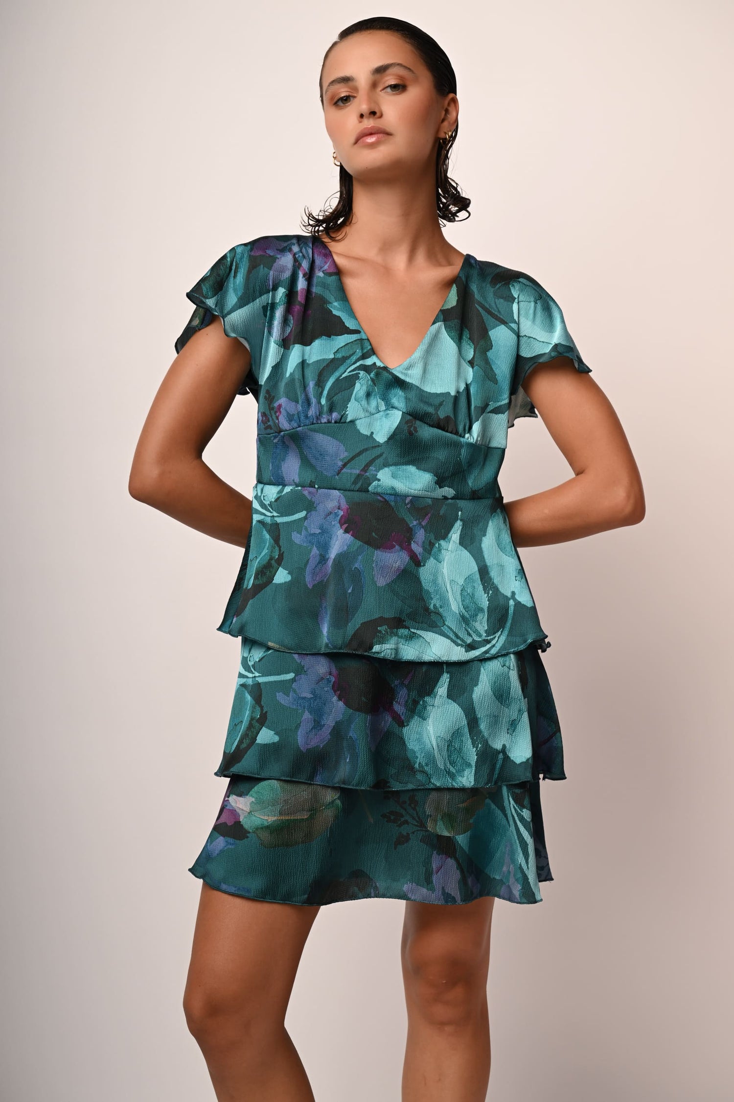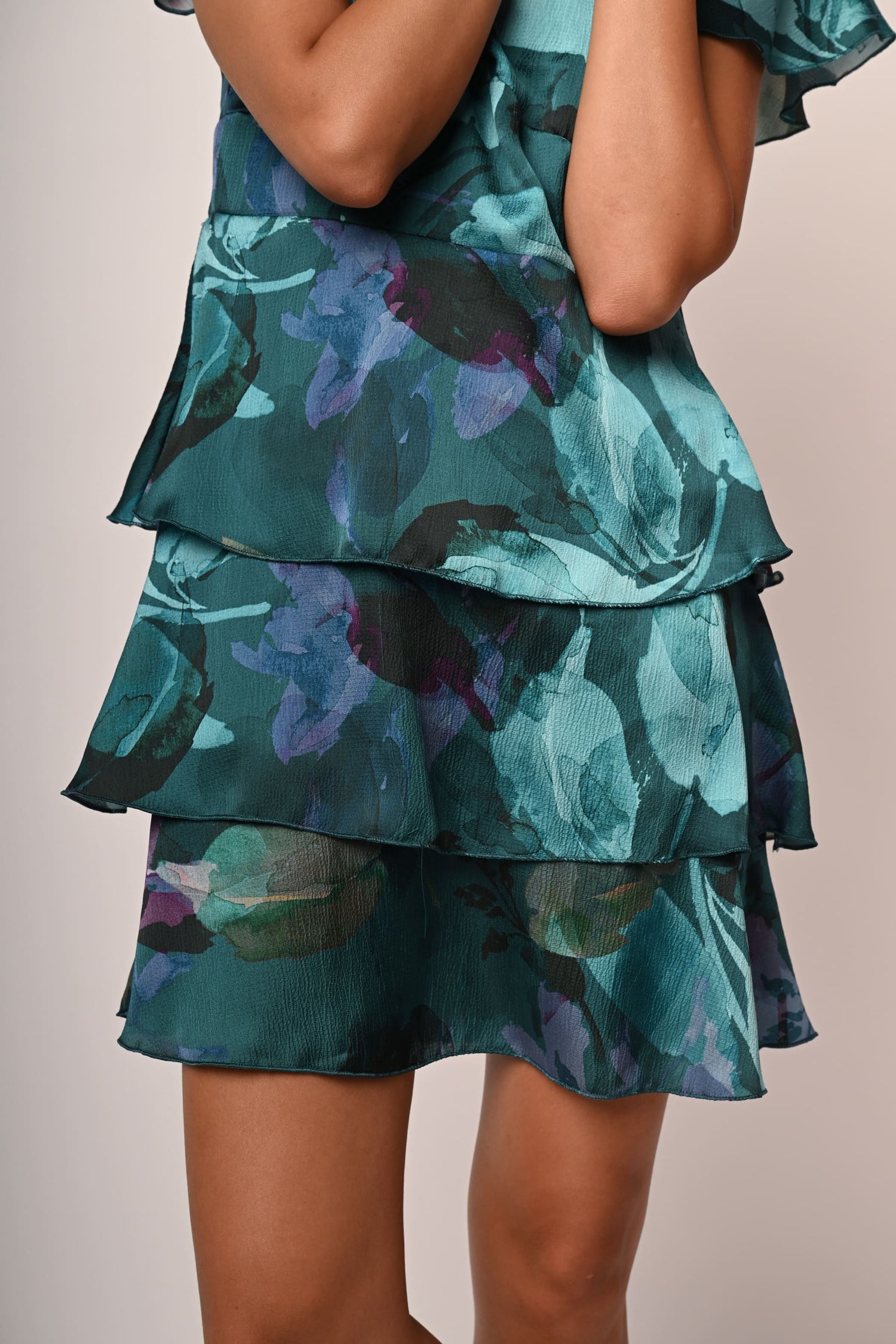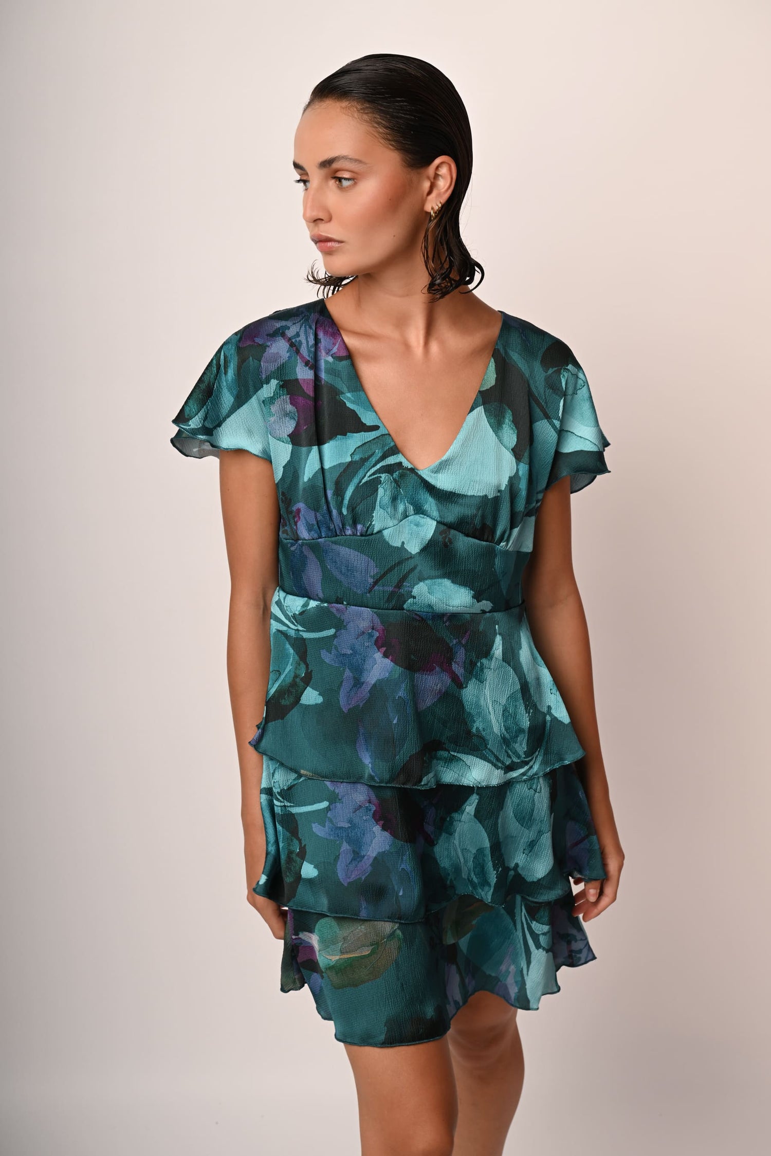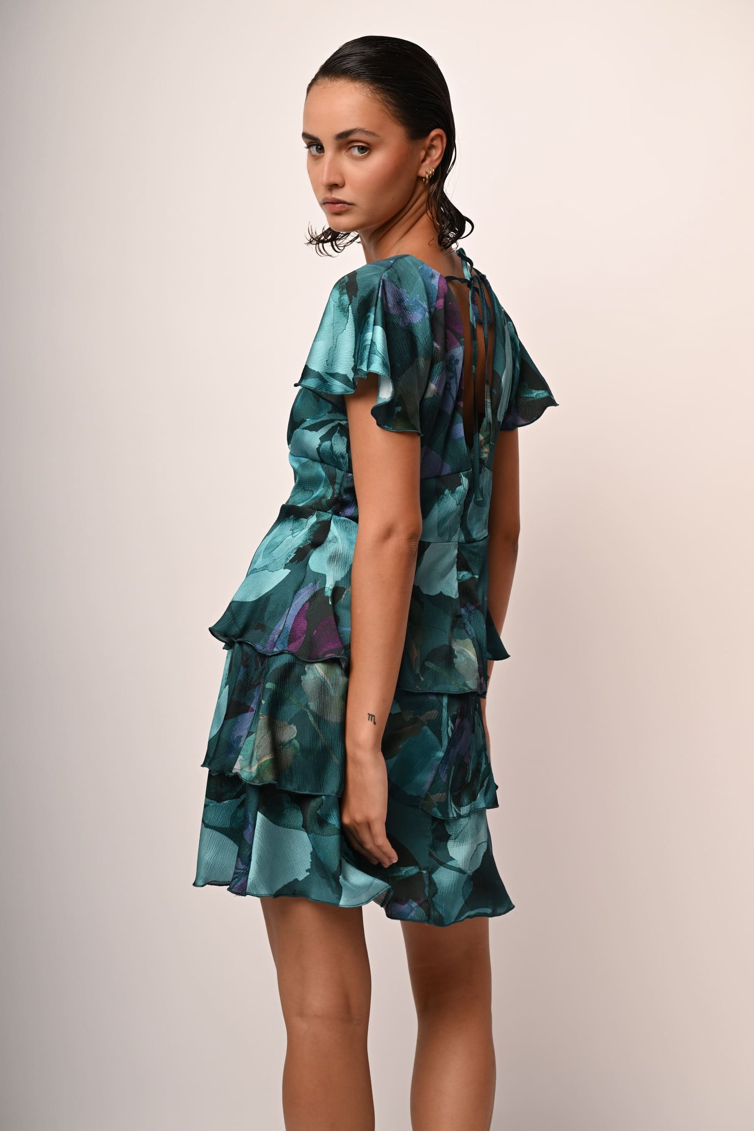 Mini abito a stampa floreale astratta nei toni del verde con scollo a V sul davanti e sul retro, maniche ad aletta, nastrini da annodare sul retro + chiusura con zip e gonna a balze.