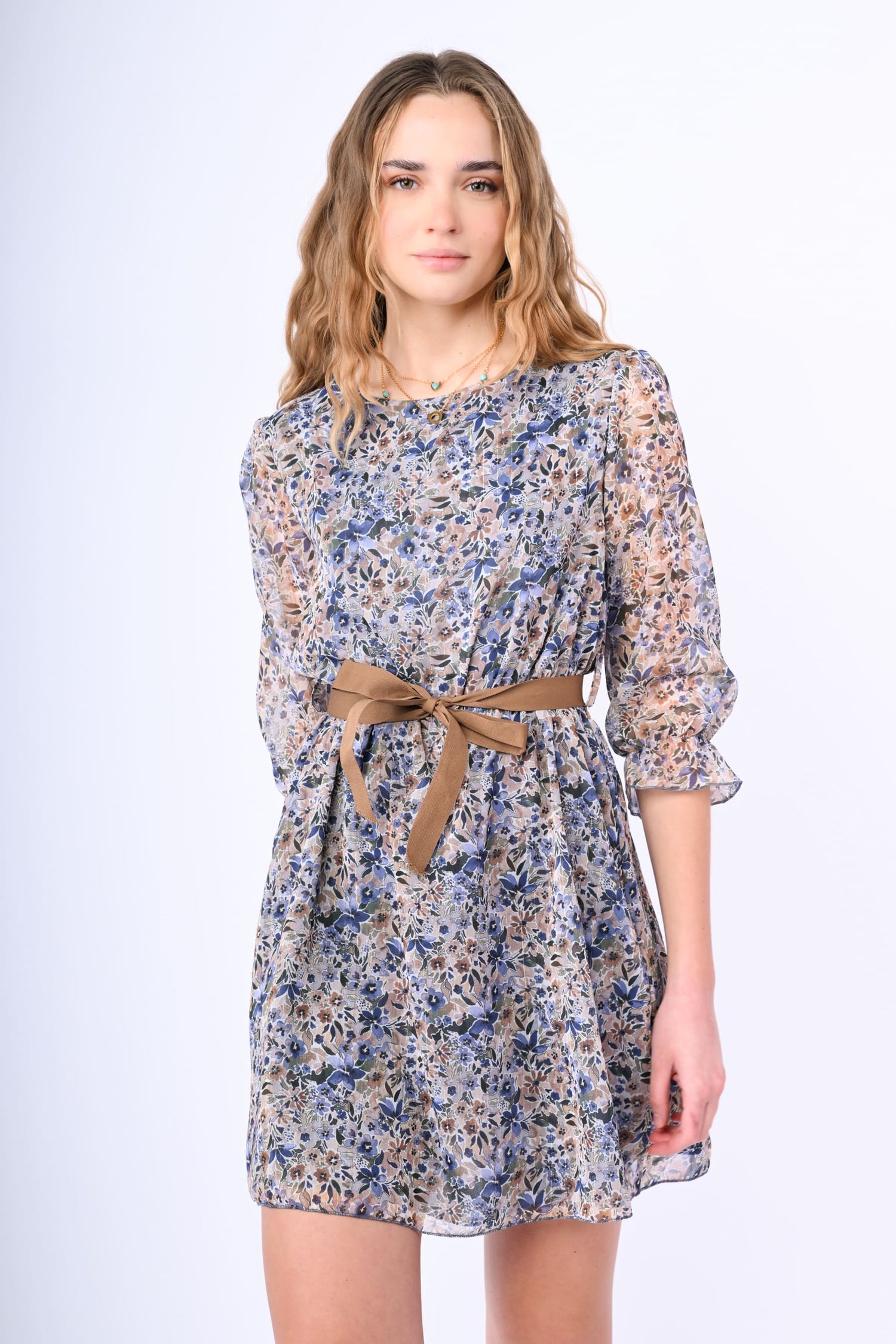 Mini abito a stampa floreale multicolor con fili lurex, scollo tondo, cintura marrone chiaro da annodare alla vita, maniche tre quarti con polsini elasticizzati, scollo a goccia con bottone sul retro e gonna svasata.