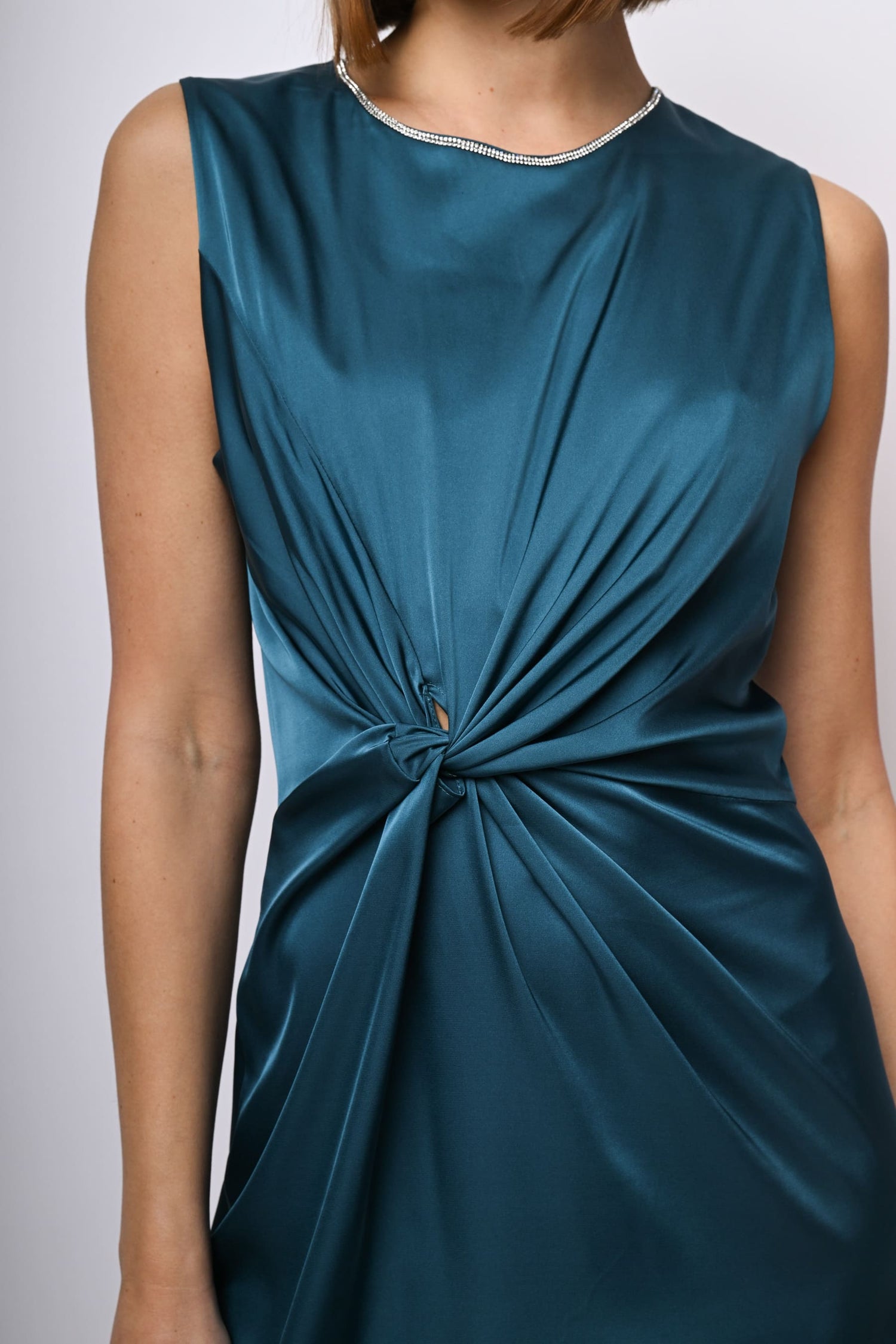 Abito in raso stretch blu pavone con scollo tondo impreziosito da strass, scollo a goccia sul retro chiuso da bottone e nodo con cut-out e drappeggio alla vita.