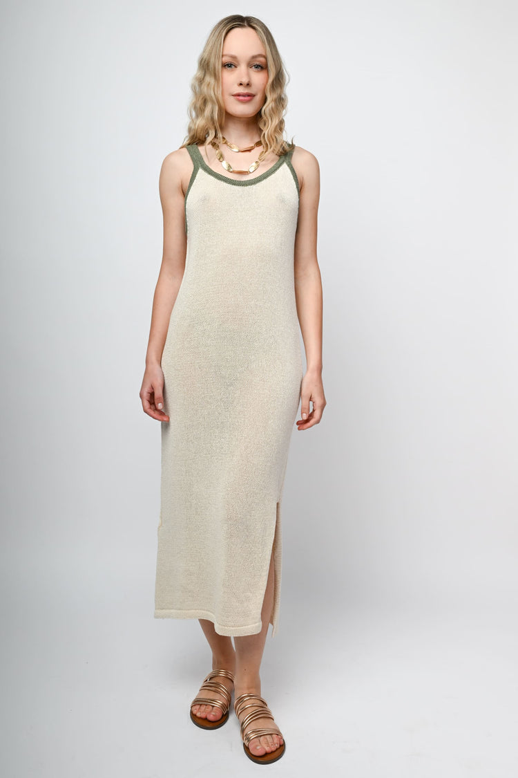 Abito midi in maglia misto cotone avorio con spalline sottili e scollo rifiniti in maglia verde militare, taglio dritto e spacco laterale.