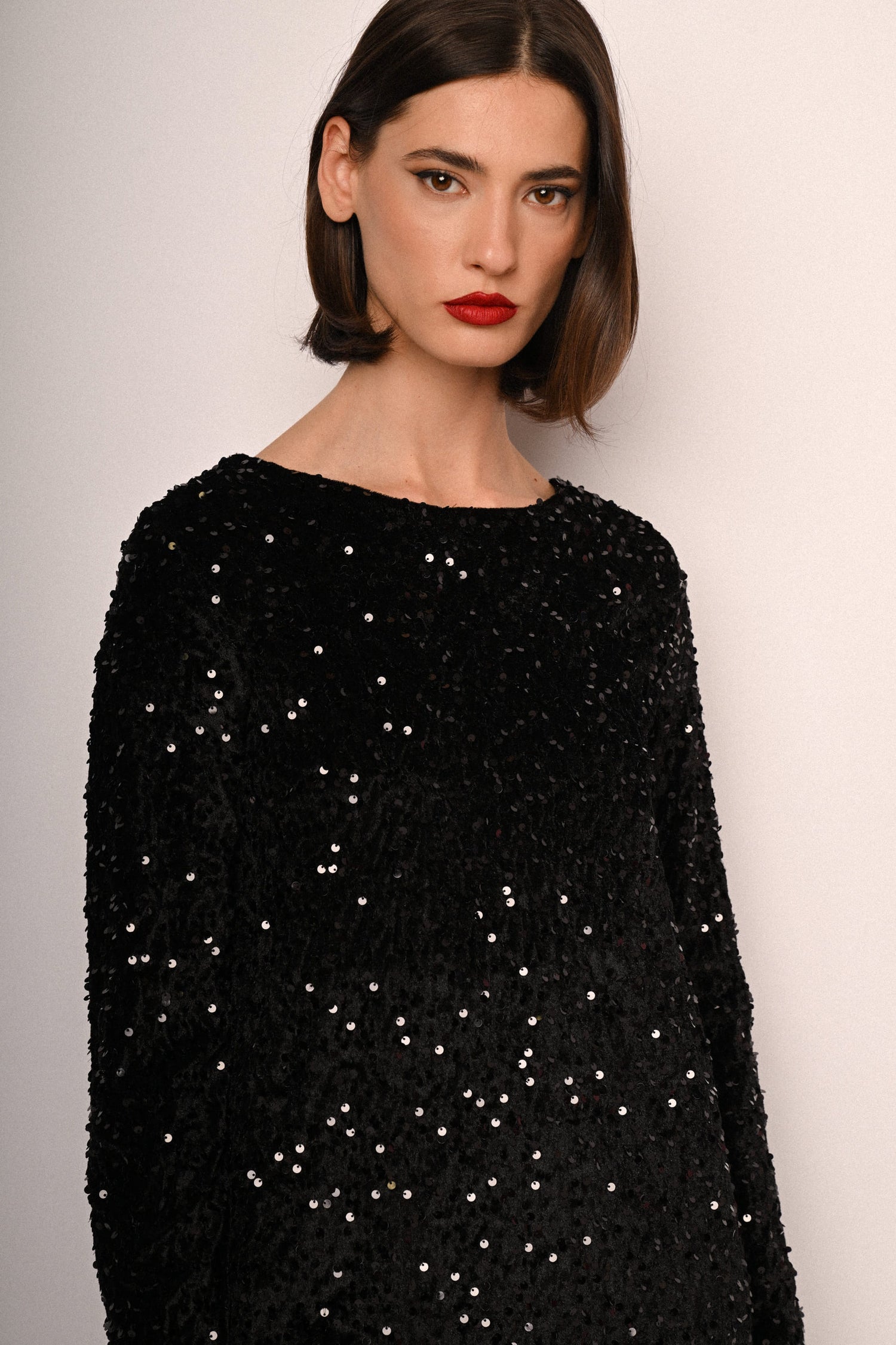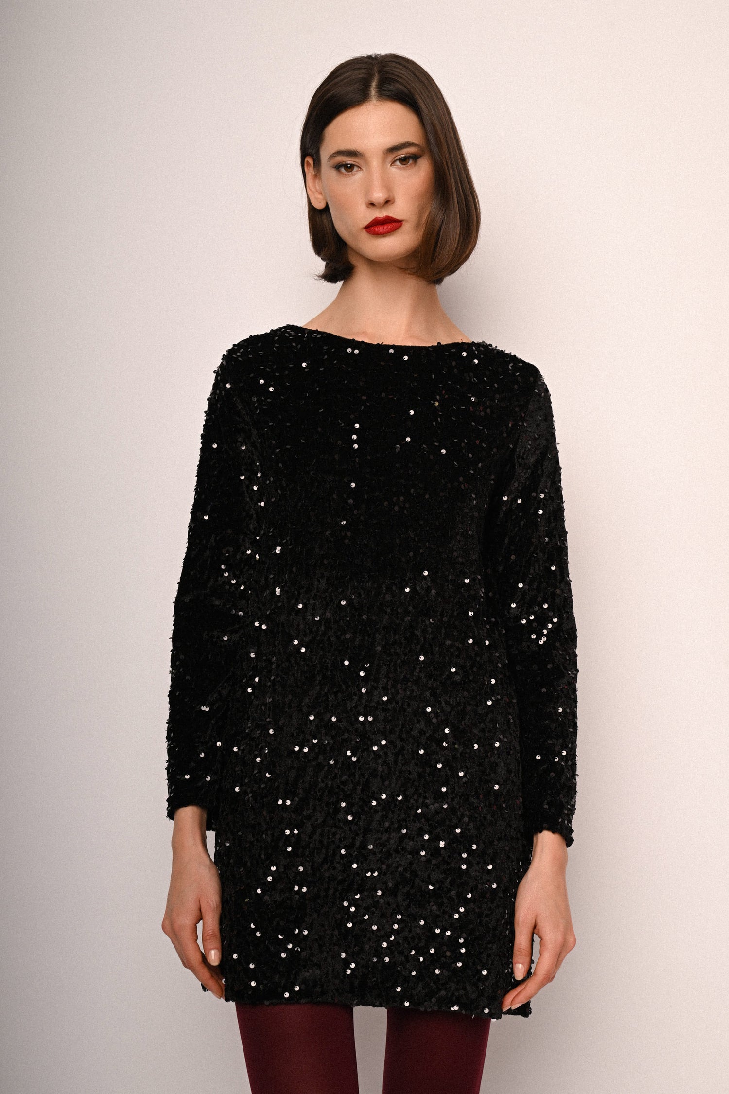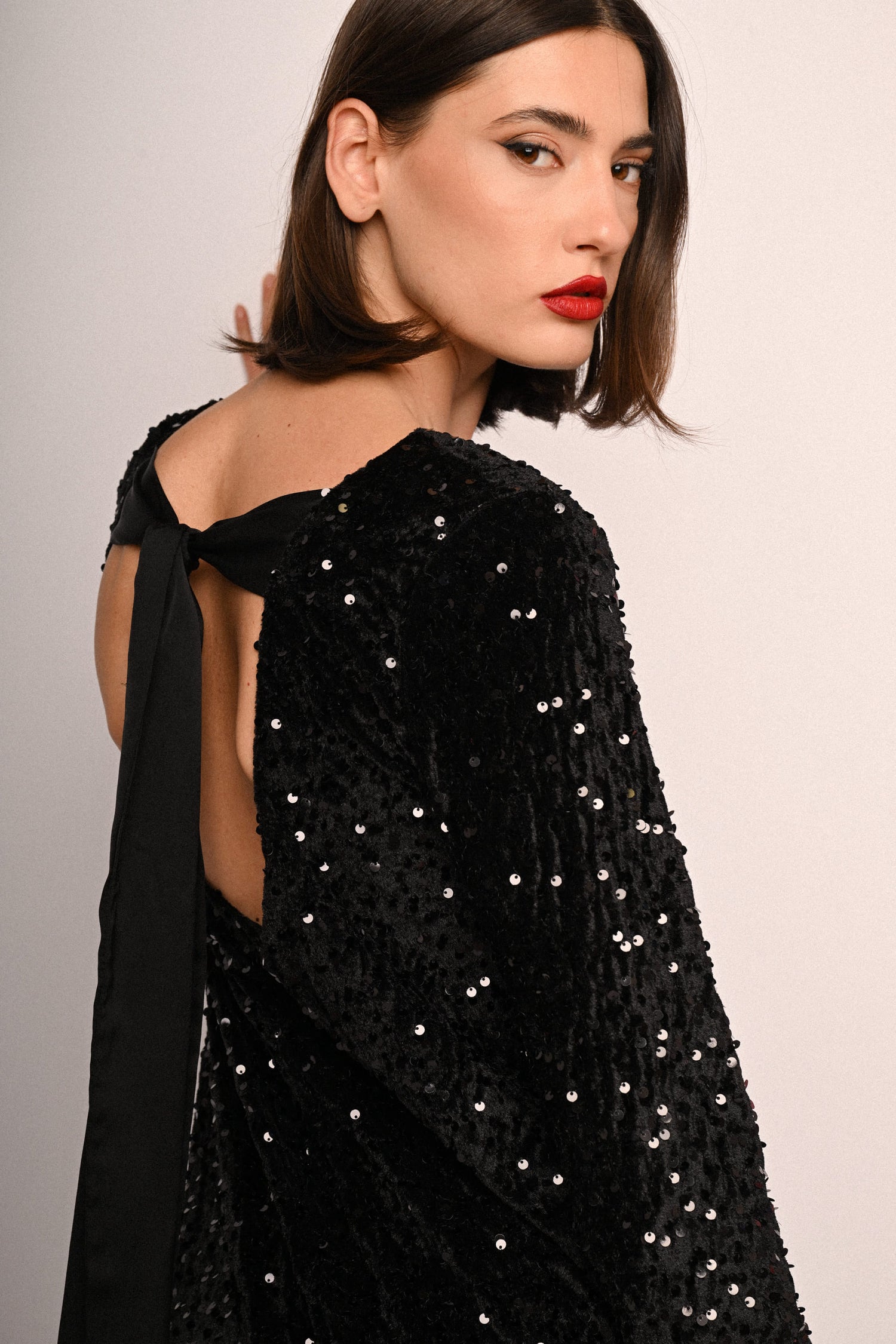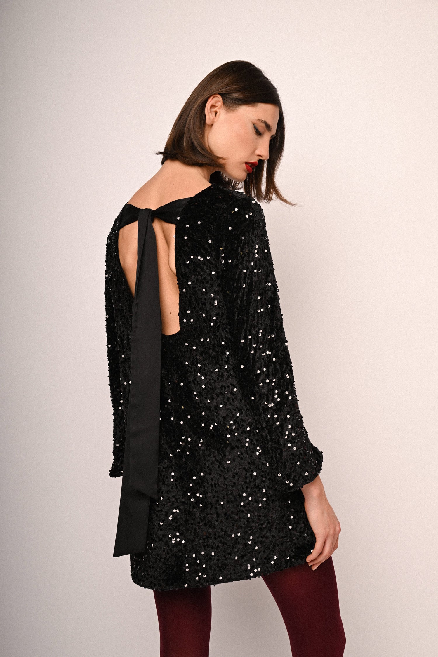 Mini abito in tessuto nero con decorazione paillettes all-over, scollo tondo, cut-out sul retro con fiocco da annodare in raso e maniche lunghe.