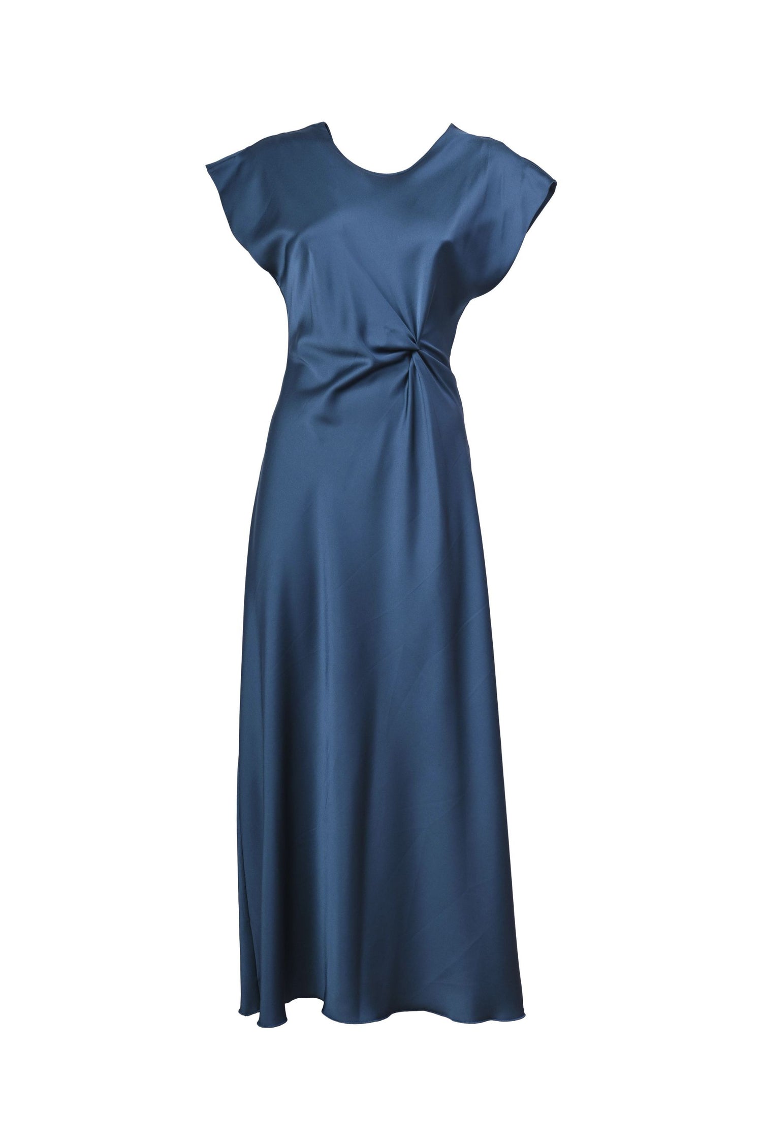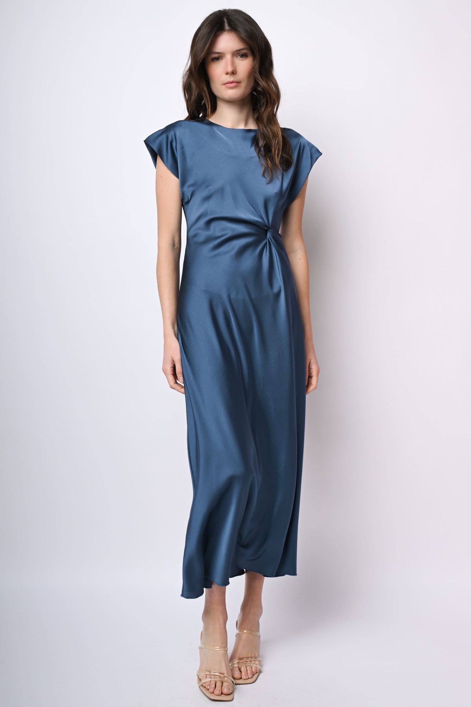 Abito midi in raso azzurro polvere con scollo tondo, maniche ad aletta, nodo laterale drappeggiato e silhouette morbida leggermente svasata.