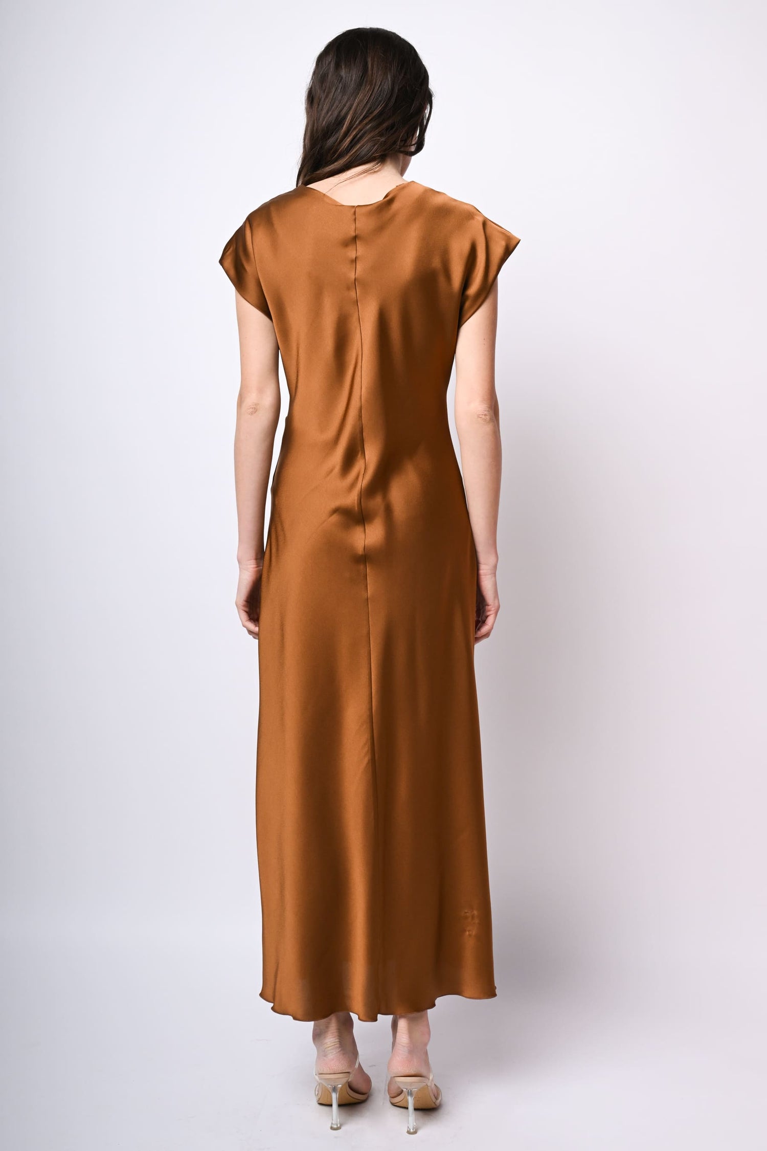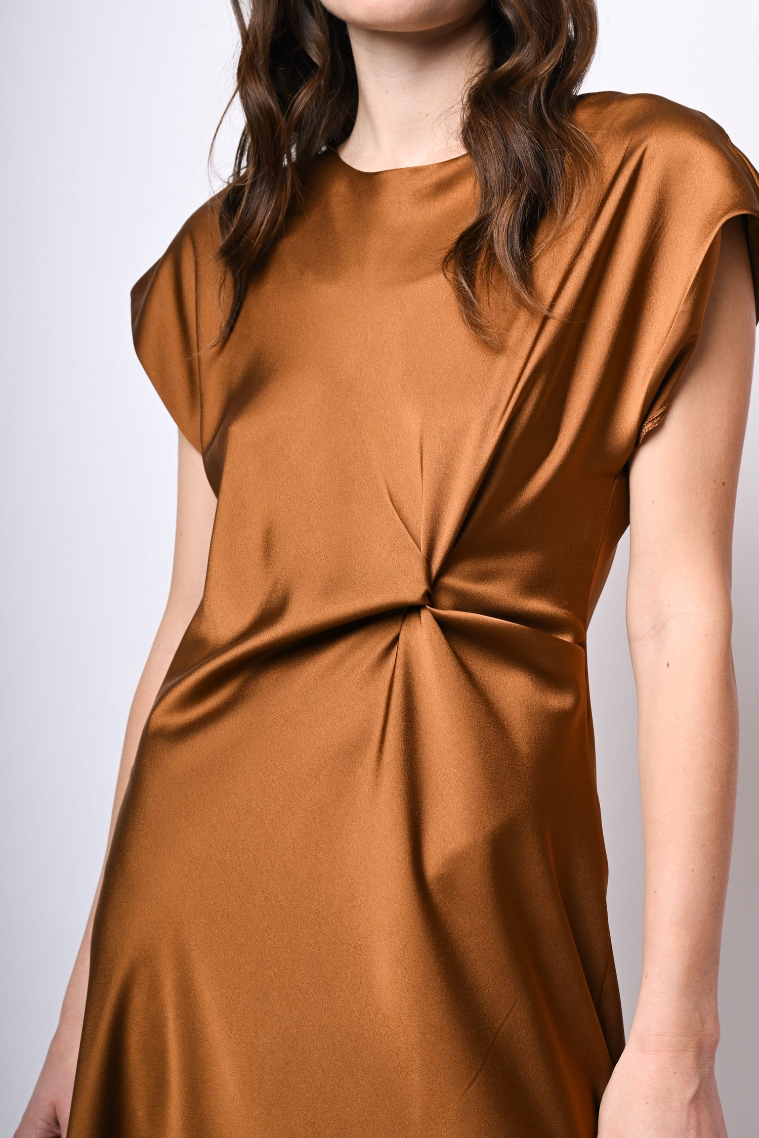 Abito midi in raso color bronzo con scollo tondo, maniche ad aletta, nodo laterale drappeggiato e silhouette morbida leggermente svasata.