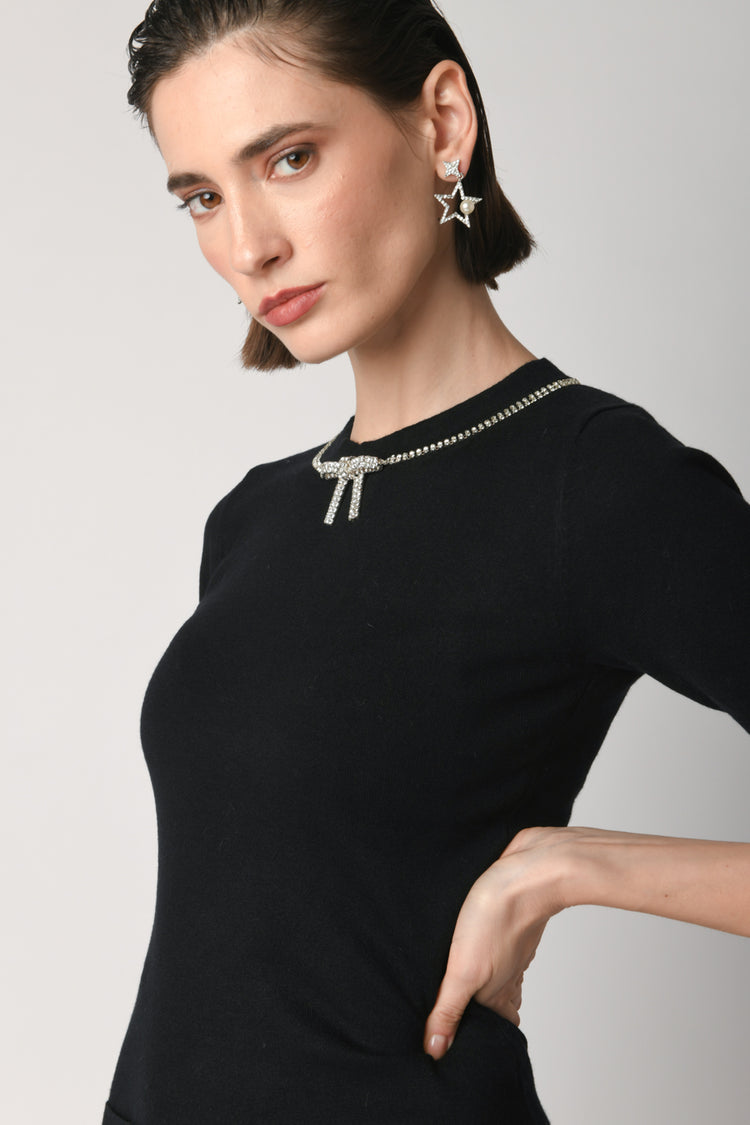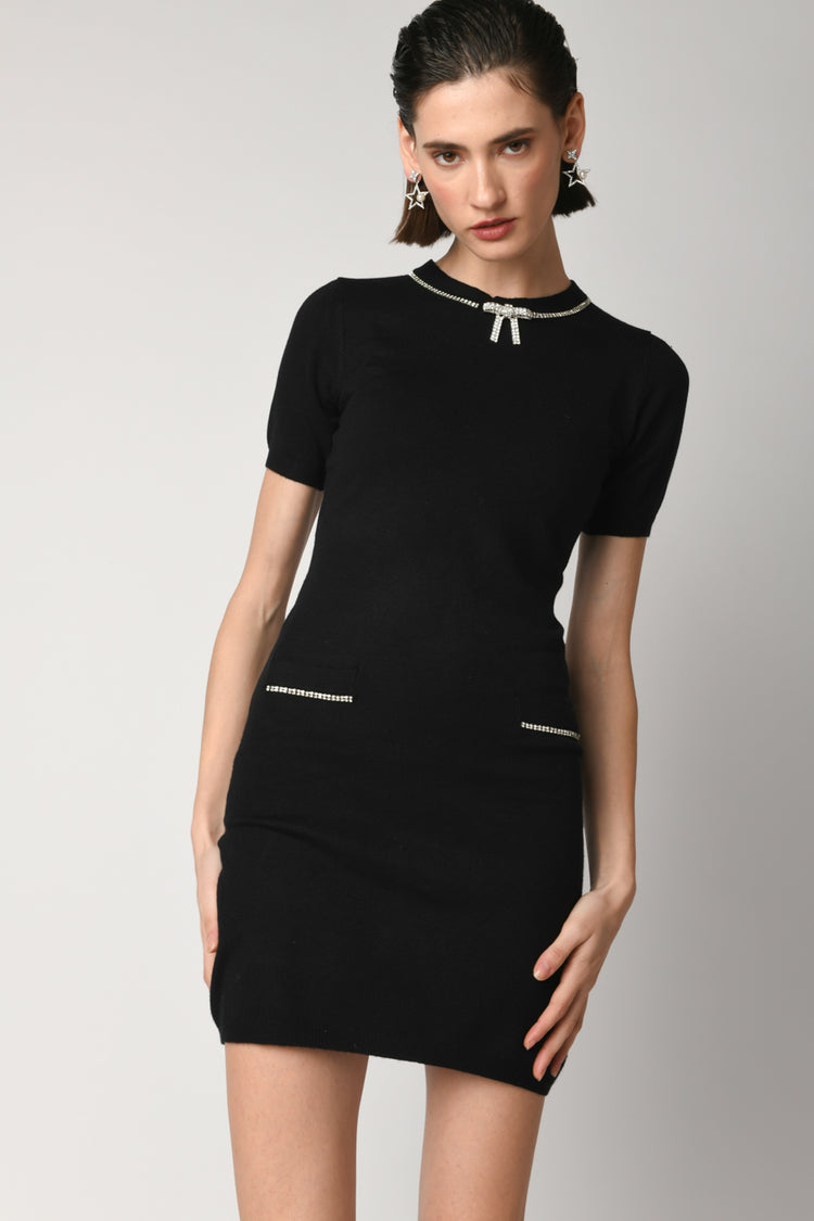 Mini abito in maglia misto viscosa nera con silhouette aderente, scollo tondo e taschini frontali sottolineati da strass e fiocchetto centrale, mezze maniche e finiture a costine.