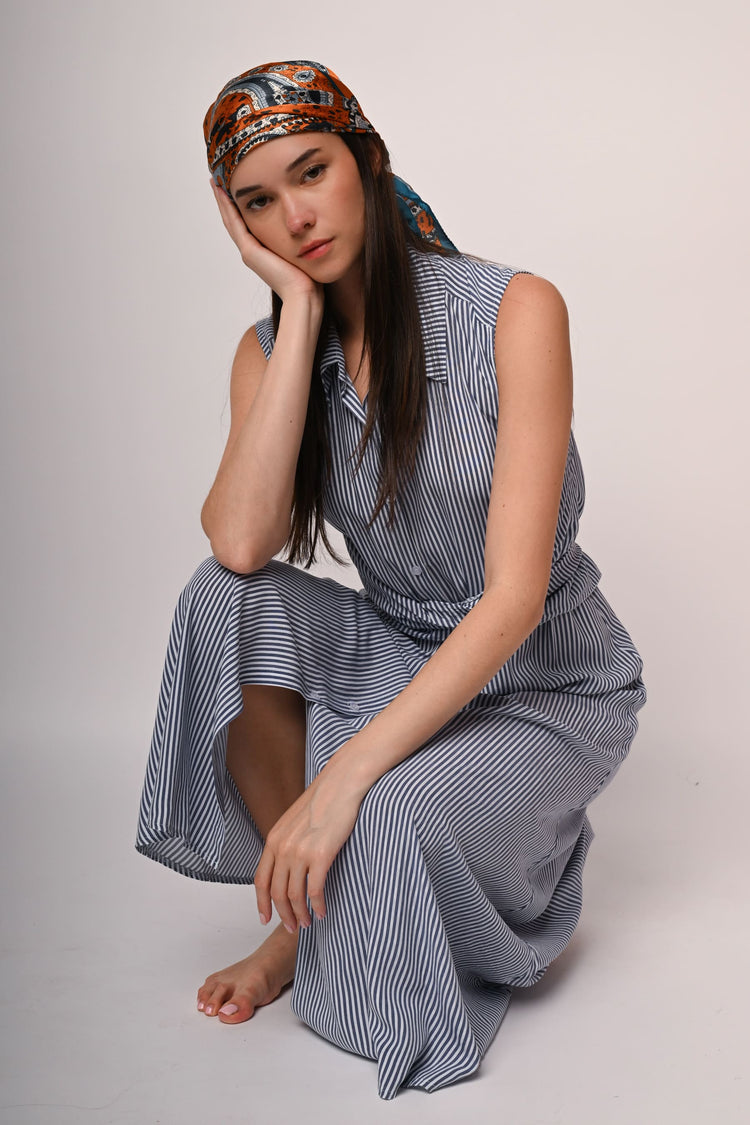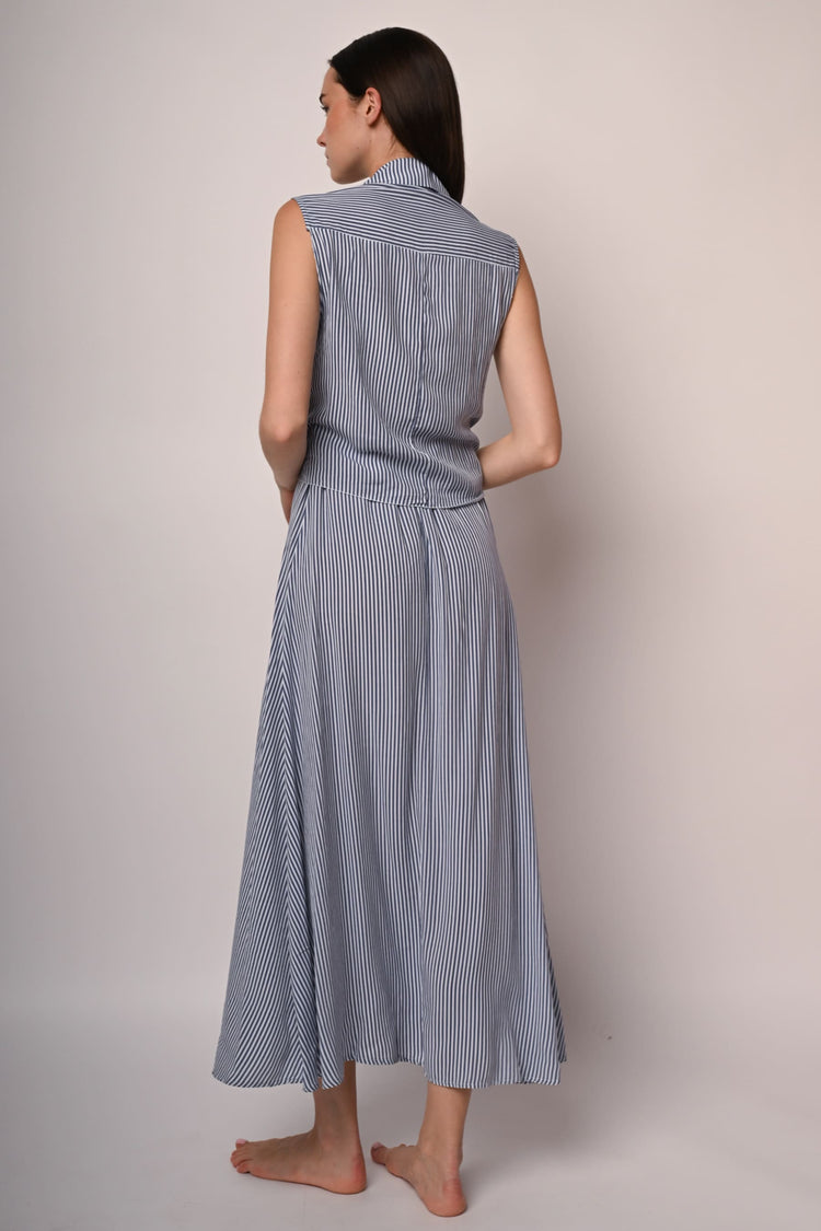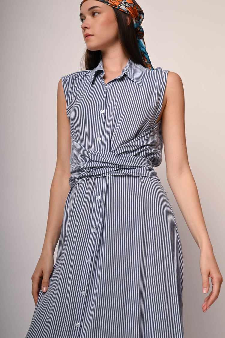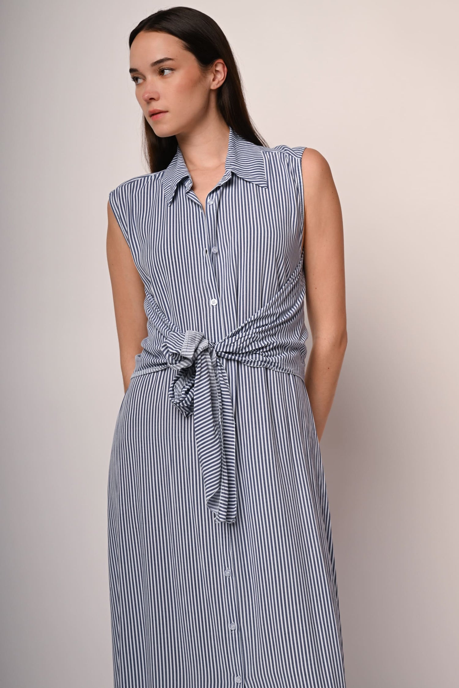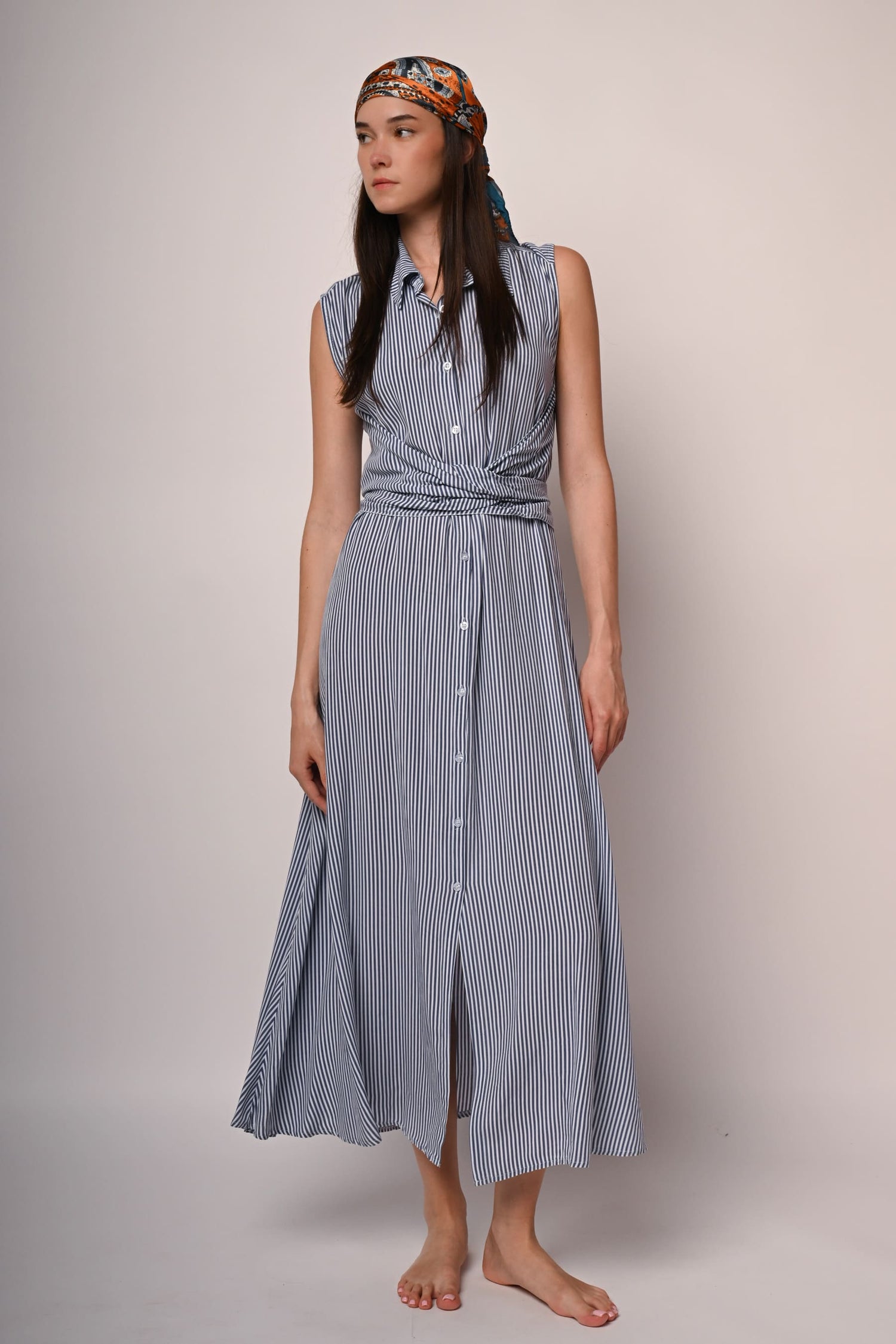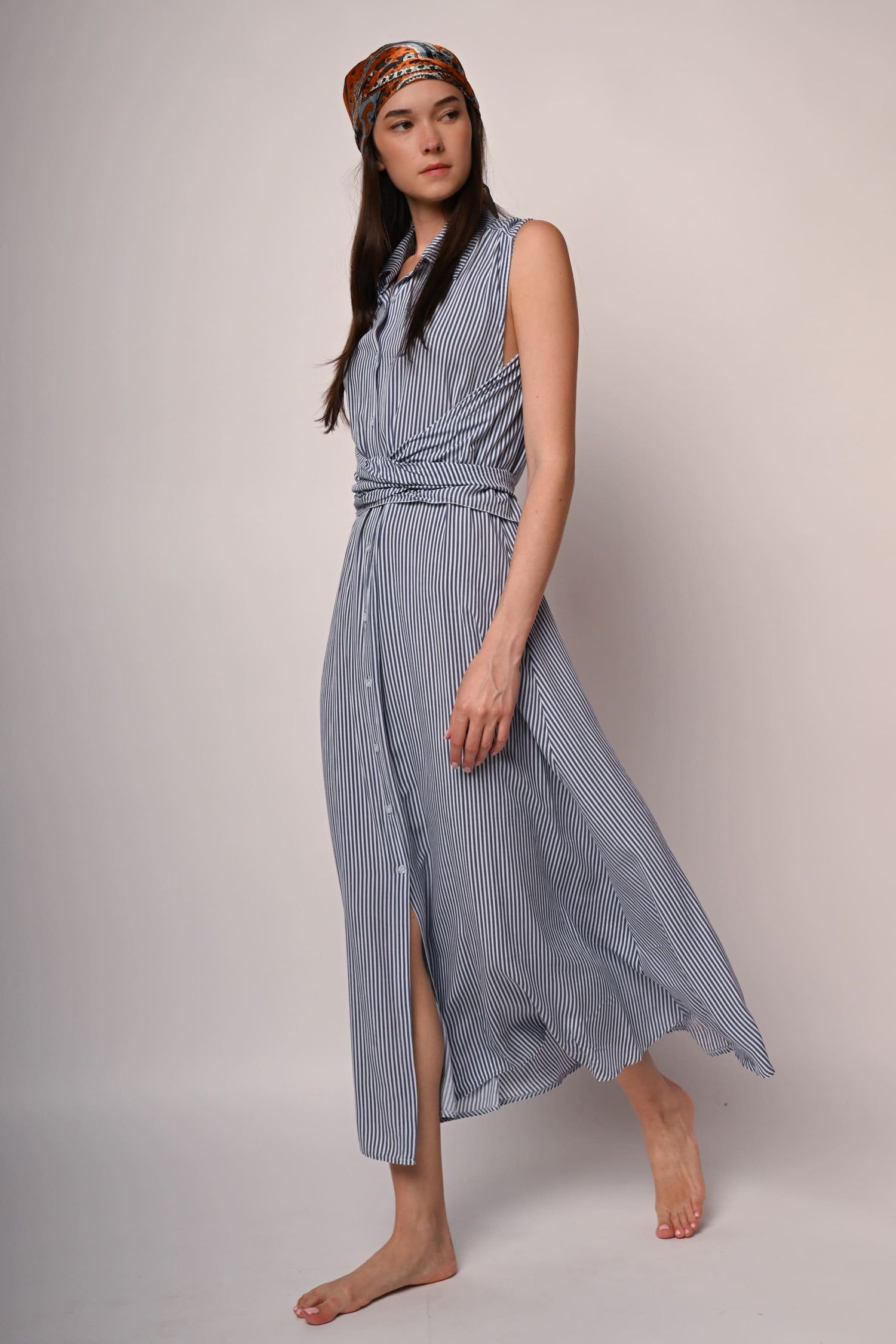 Abito chemisier lungo e smanicato in viscosa a righe blu e bianche con colletto a punta, abbottonatura frontale, fasce da annodare alla vita e gonna svasata.