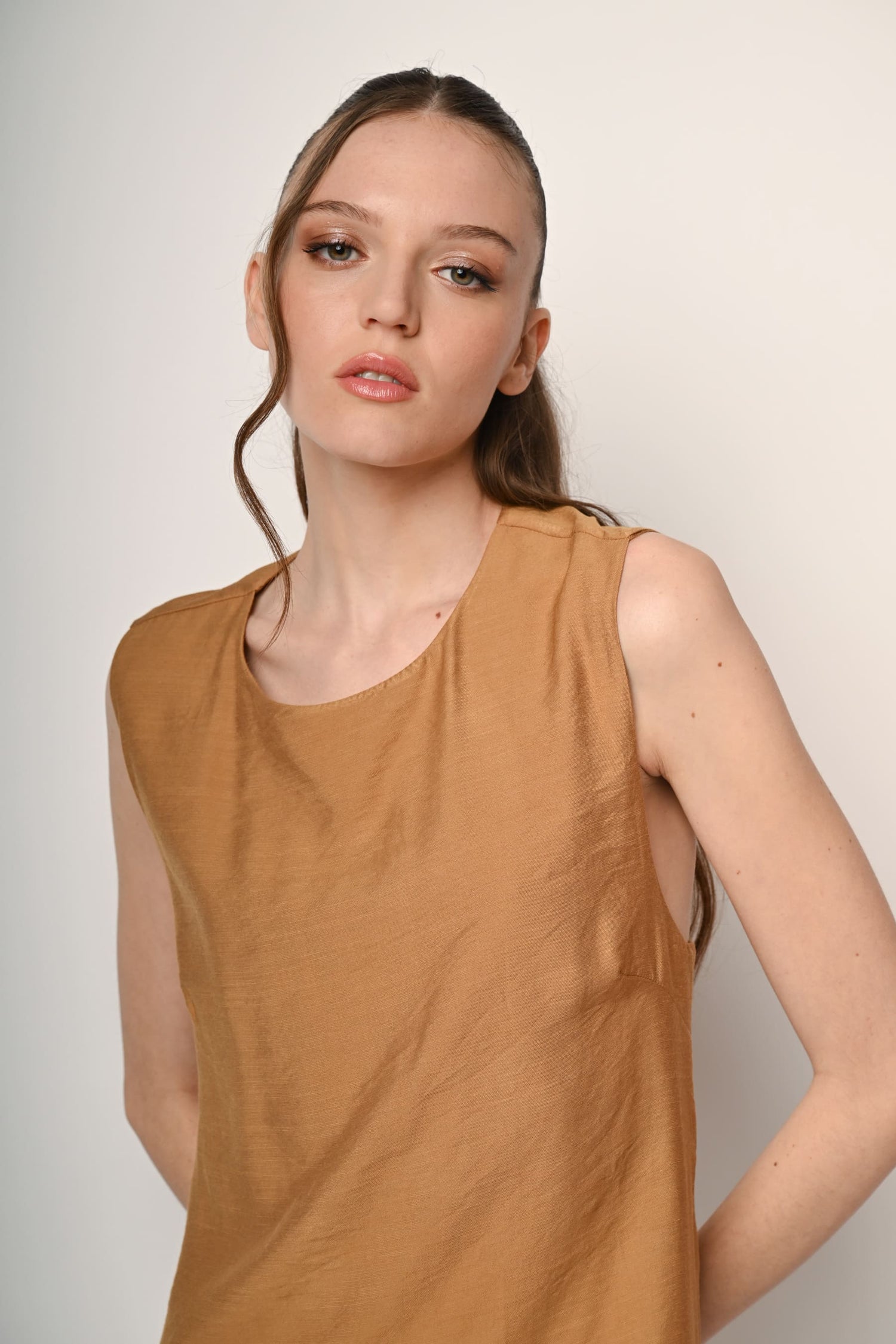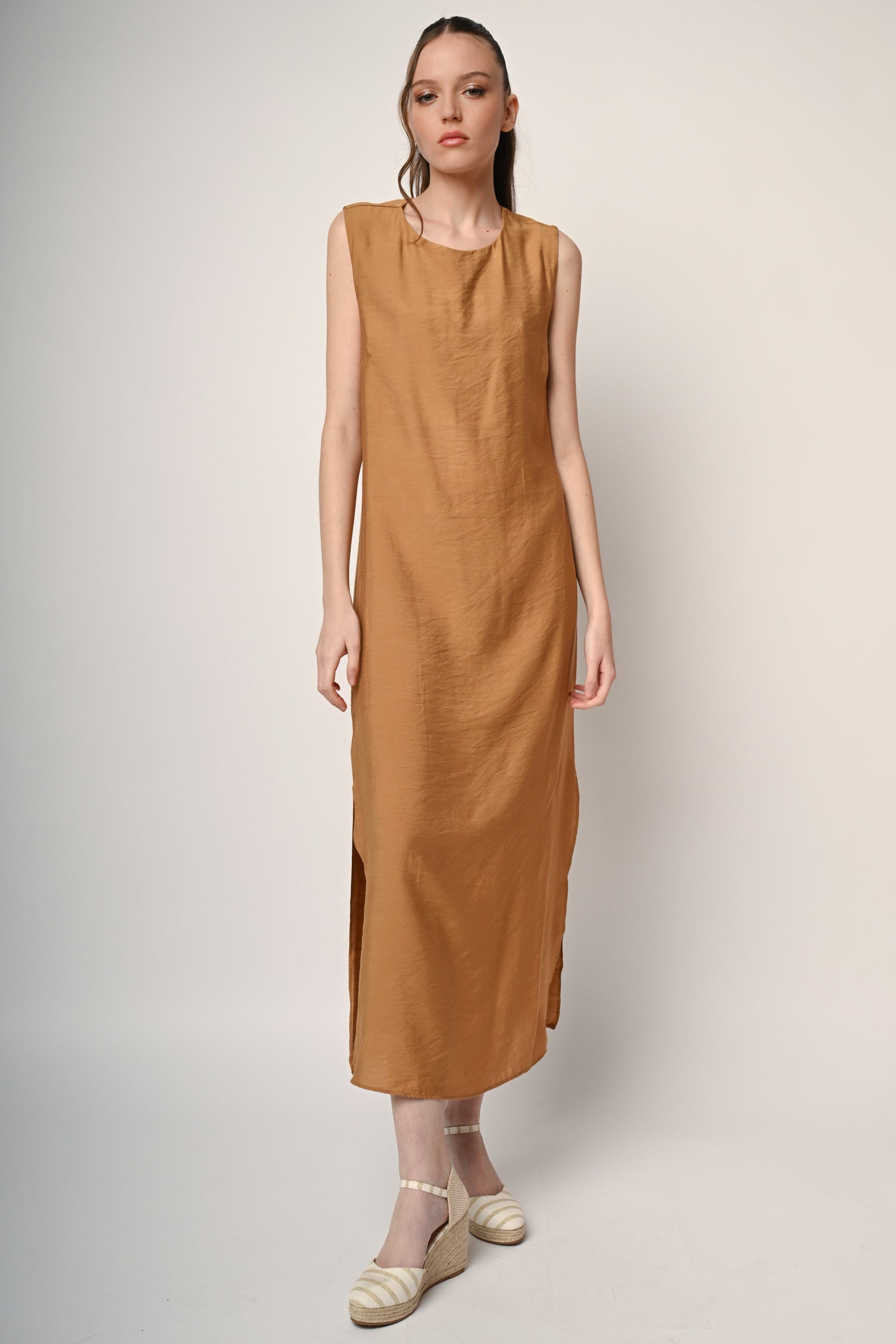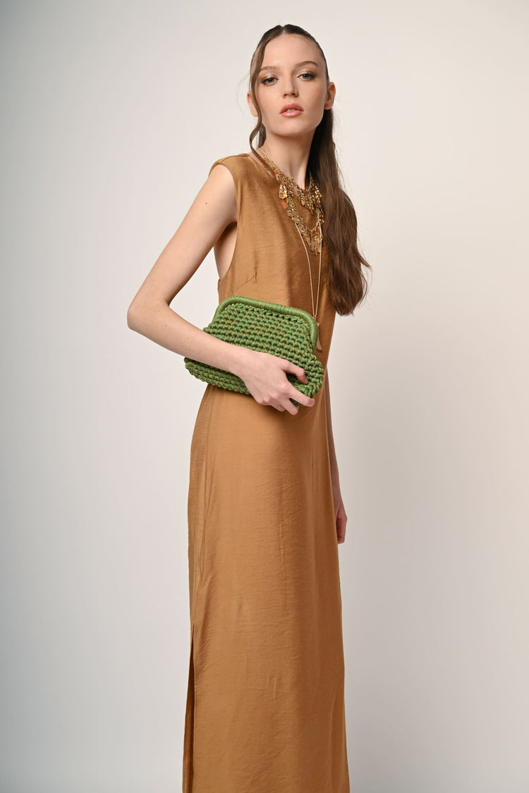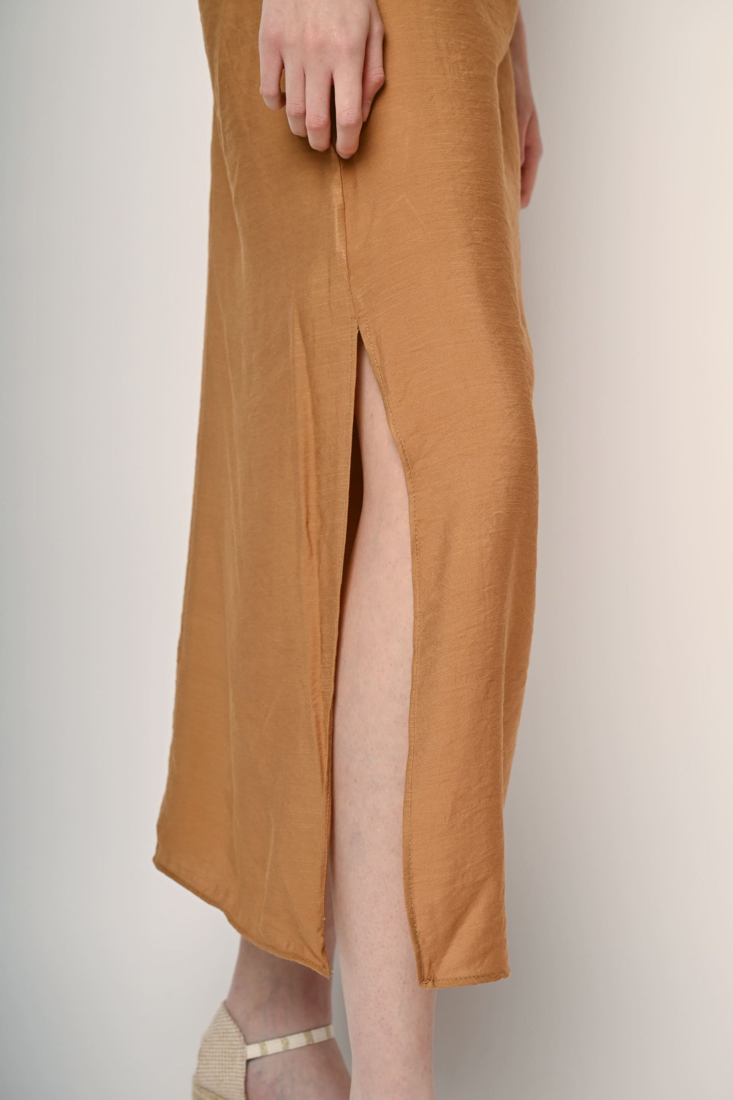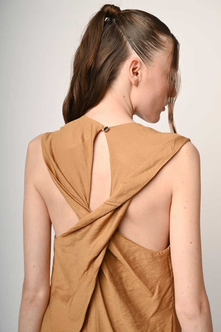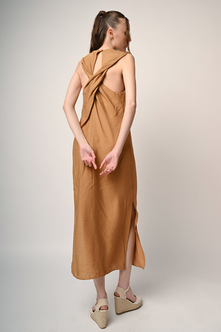 Abito lungo misto viscosa nuance cammello con scollo tondo, taglio dritto, spacchi laterali, taglio incrociato e drappeggiato sulla schiena e chiusura con bottone.
