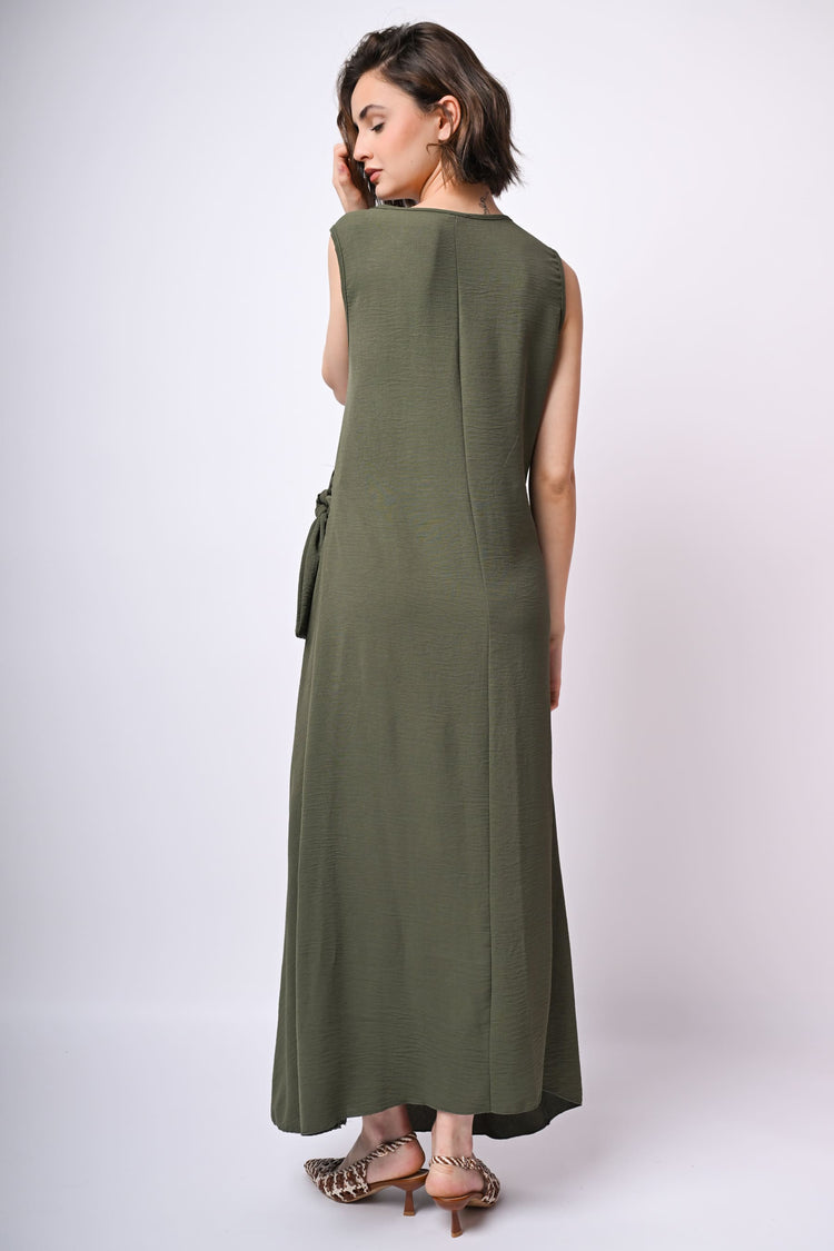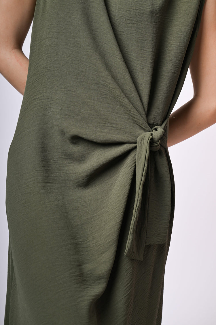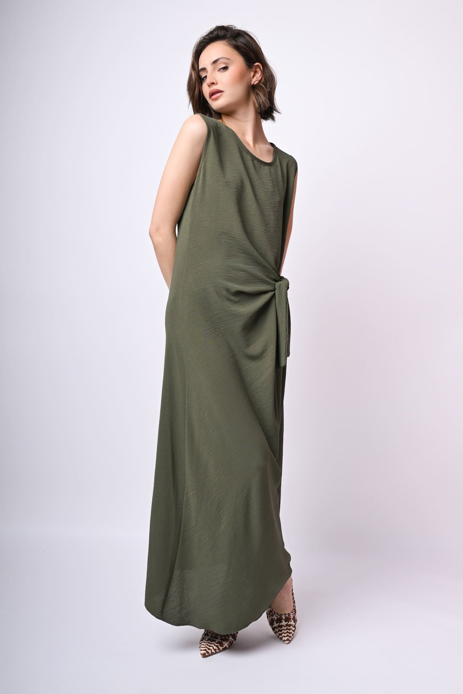 Abito lungo verde oliva con scollo tondo, fiocco drappeggiato da annodare a lato, spacco laterale e silhouette morbida.