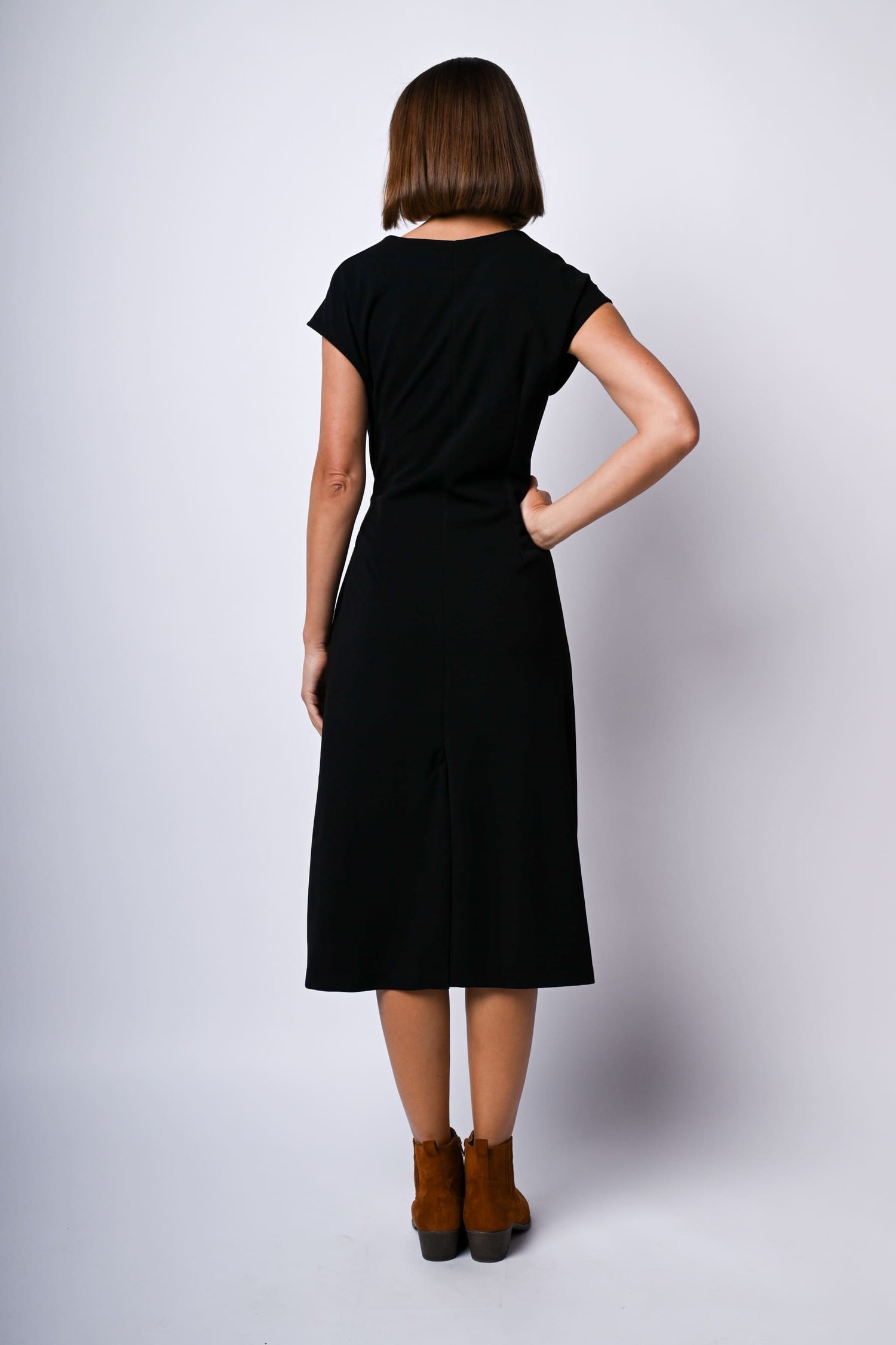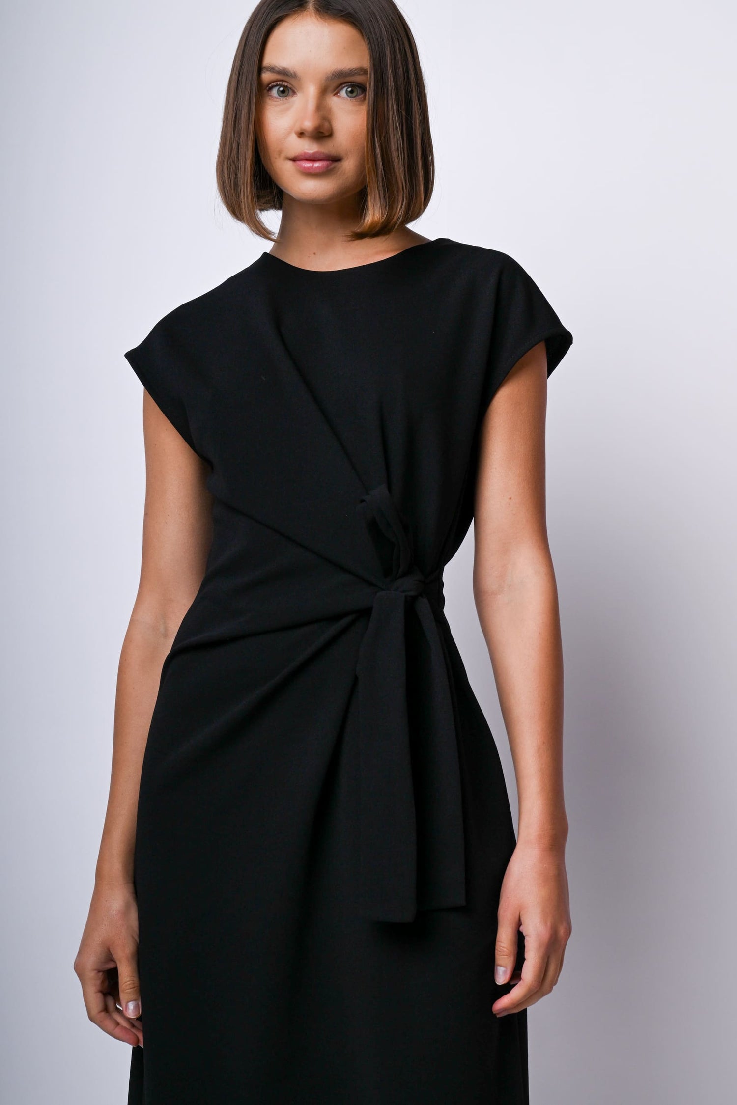 Abito midi in tessuto stretch nero con scollo tondo, maniche ad aletta, cinturini da annodare alla vita, design drappeggiato e gonna svasata.