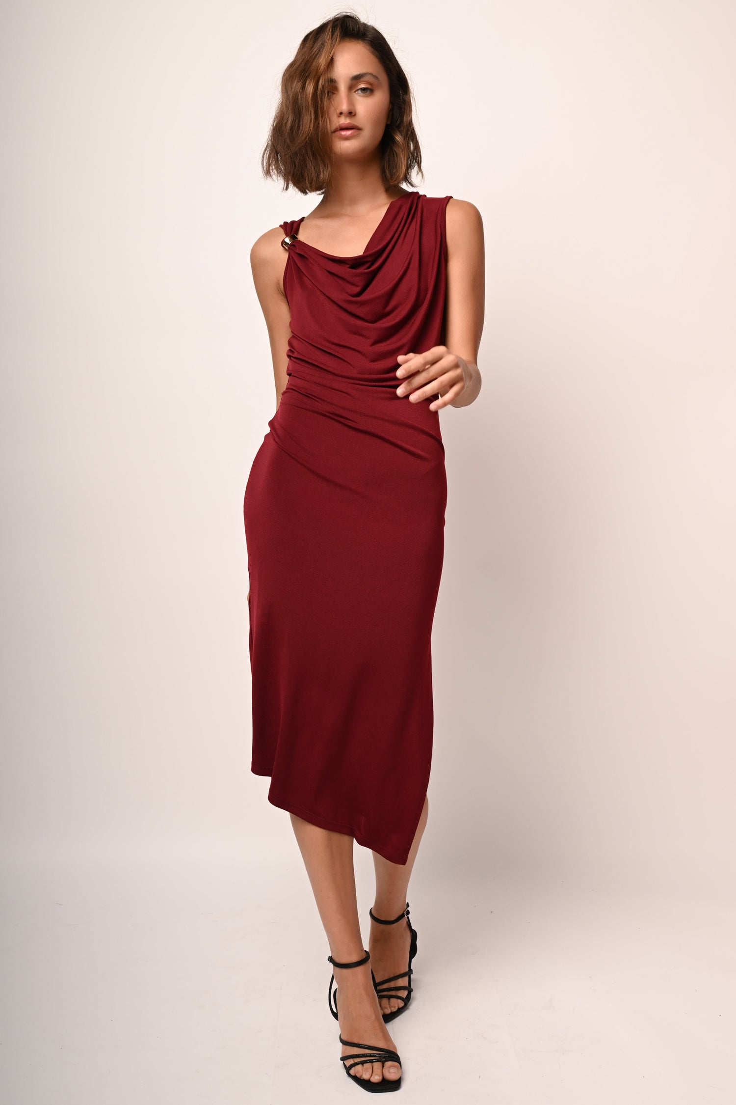 Abito midi a tubino in tessuto stretch bordeaux contraddistinto da scollo tondo drappeggiato con anello dorato, silhouette aderente, spacco laterale e orlo asimmetrico.