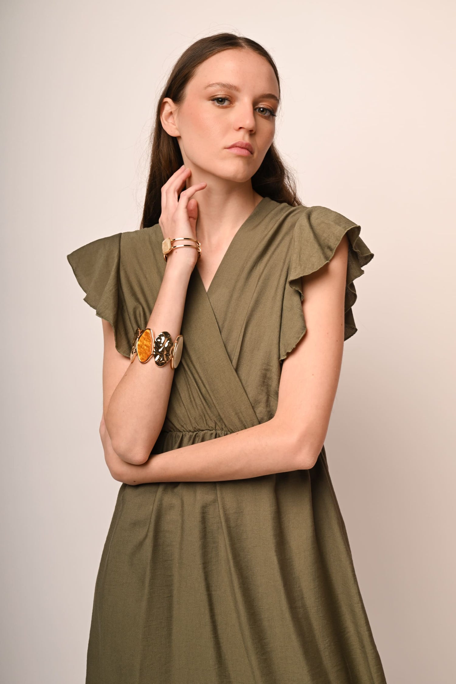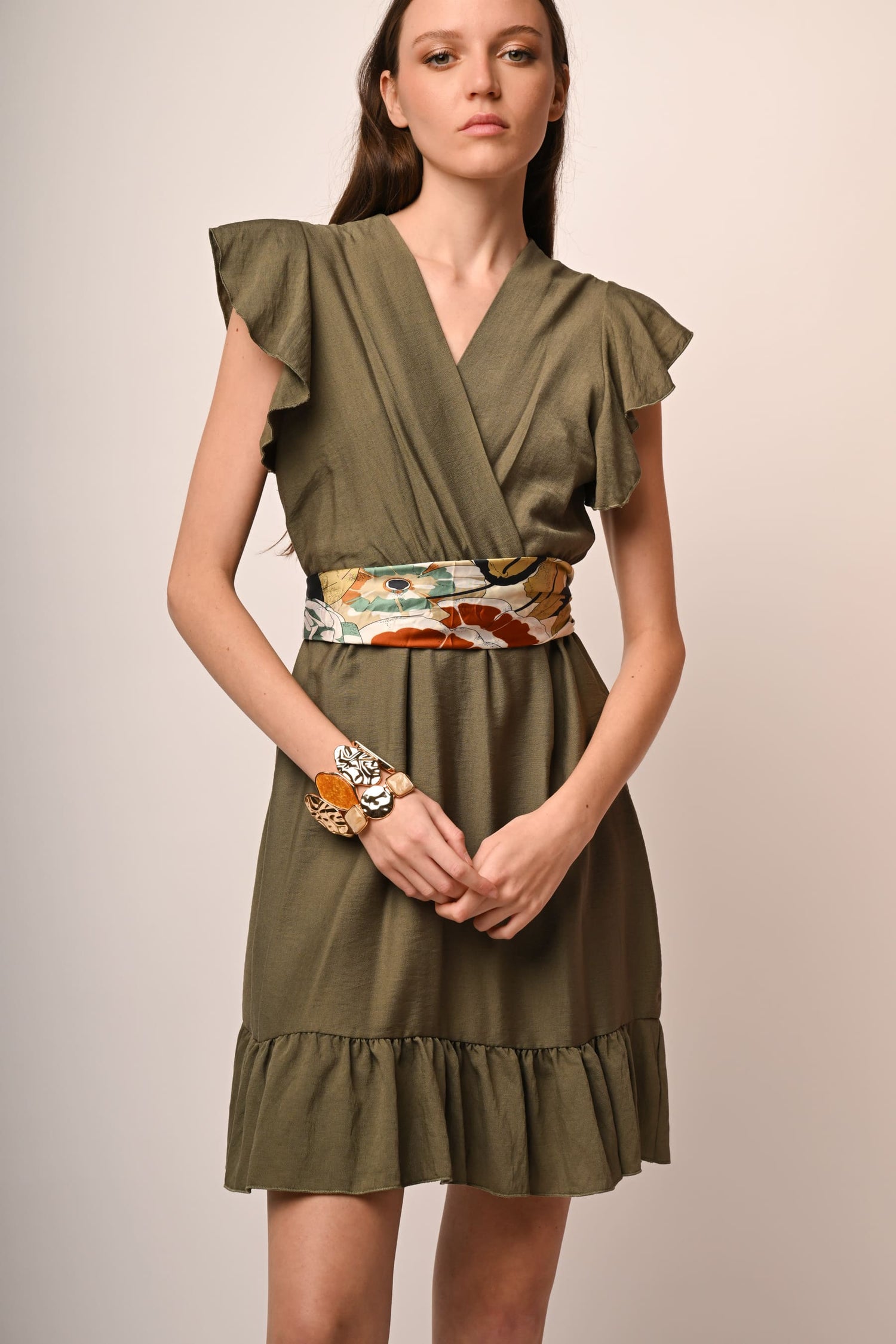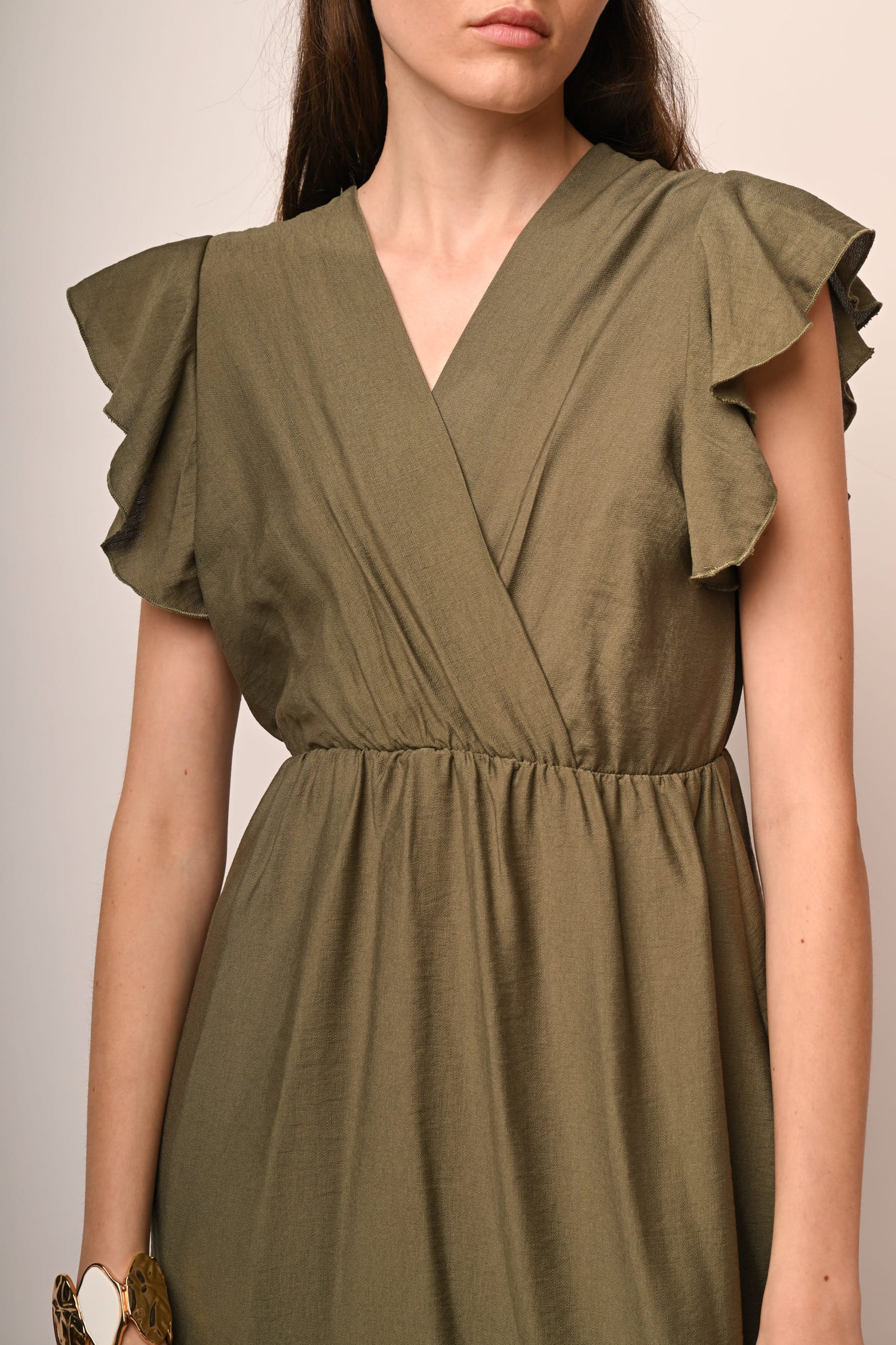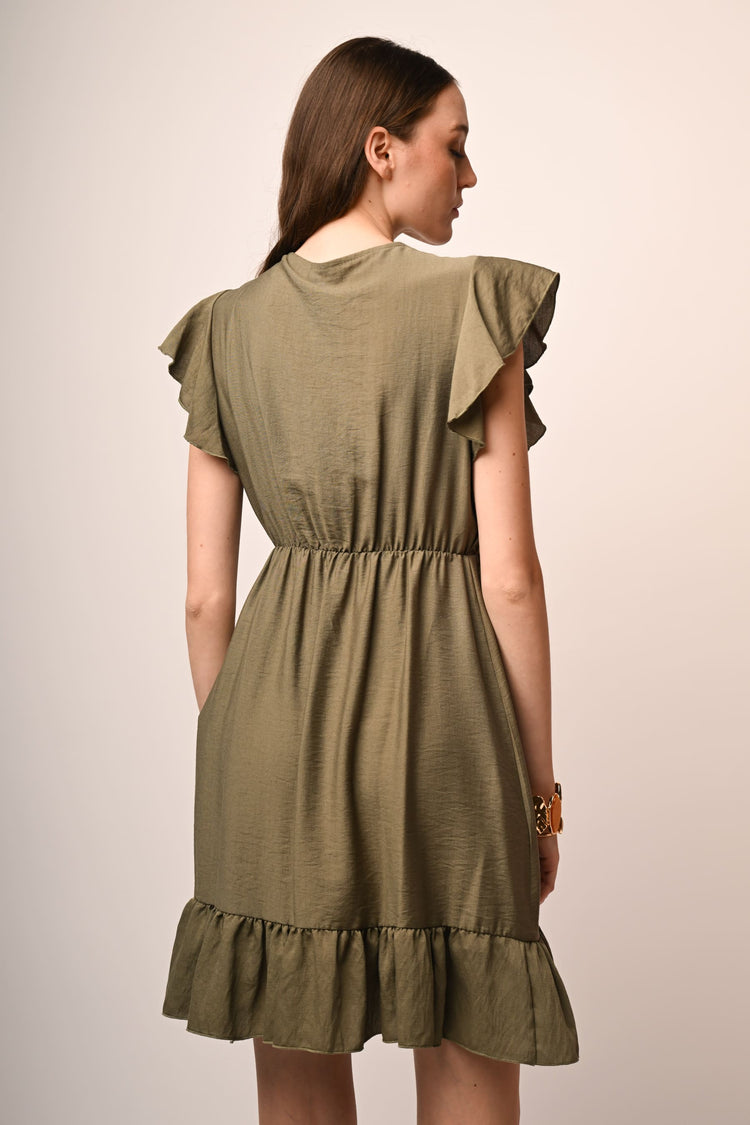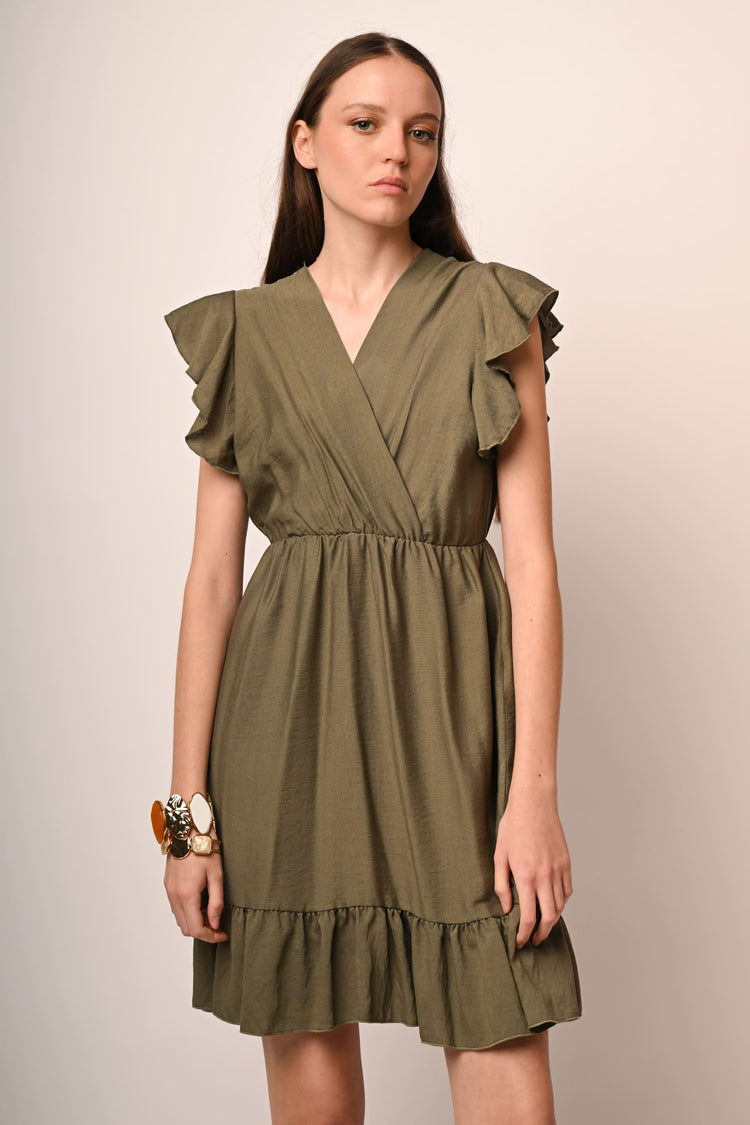 Mini abito misto viscosa e nylon verde oliva con scollo a V sovrapposto, volants alle maniche e allorlo, vita elasticizzata e gonna svasata.