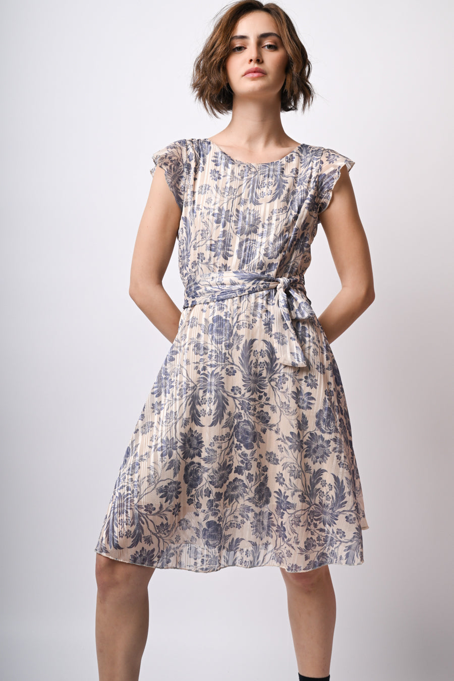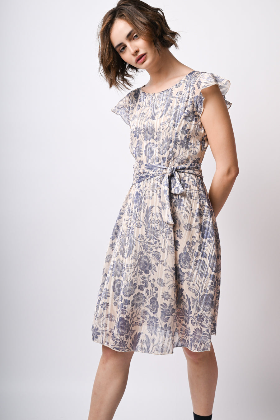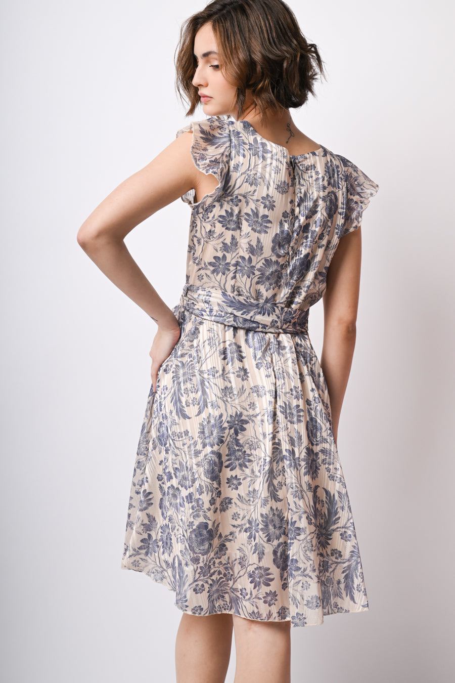 Mini abito in georgette con stampa floreale in stile Art Nouveau nei toni del blu e grigio su fondo nude, fili lurex, scollo tondo, maniche ad aletta a volants, cintura coordinata da annodare alla vita, chiusura con zip al centro dietro e gonna svasata. Modello foderato.