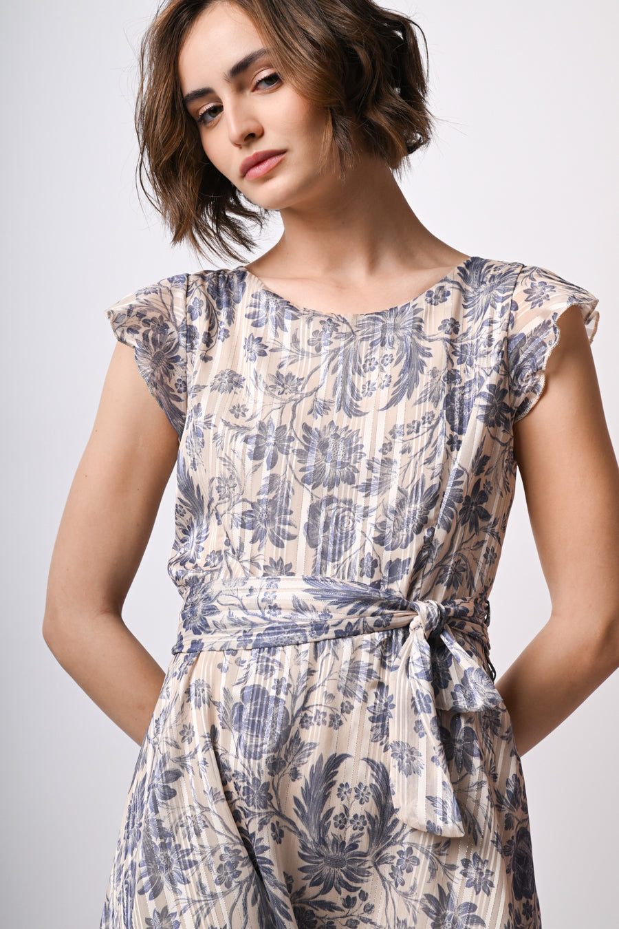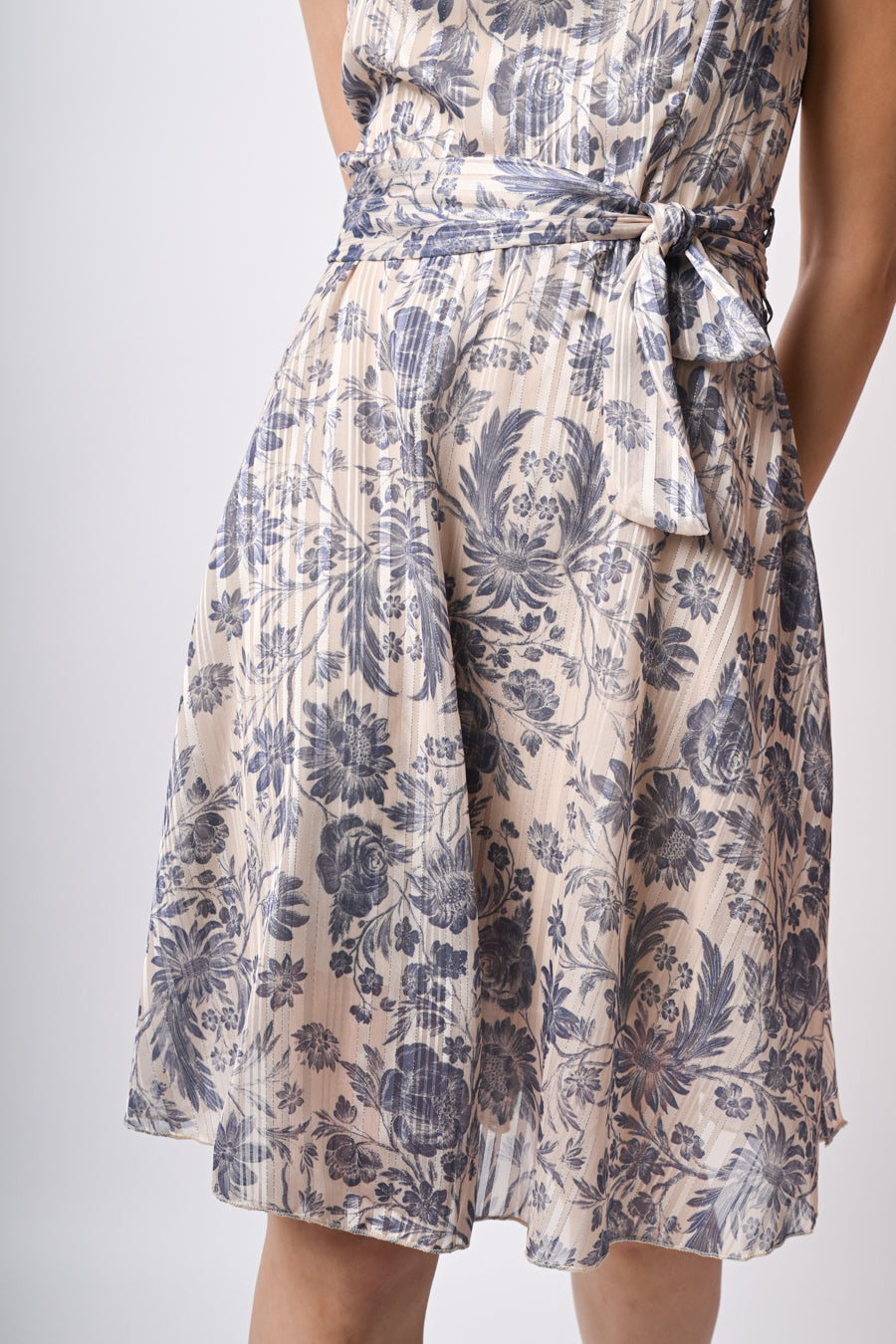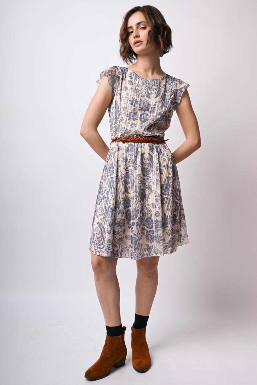 Mini abito in georgette con stampa floreale in stile Art Nouveau nei toni del blu e grigio su fondo nude, fili lurex, scollo tondo, maniche ad aletta a volants, cintura coordinata da annodare alla vita, chiusura con zip al centro dietro e gonna svasata. Modello foderato.