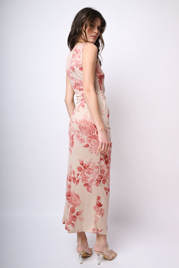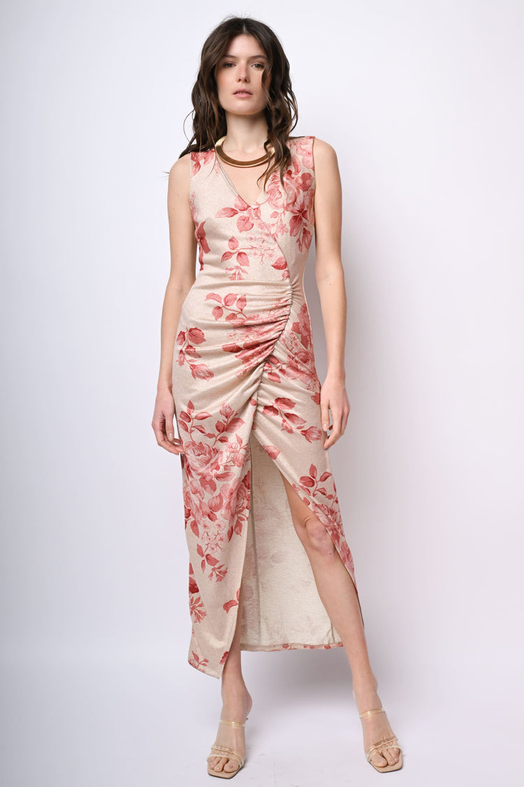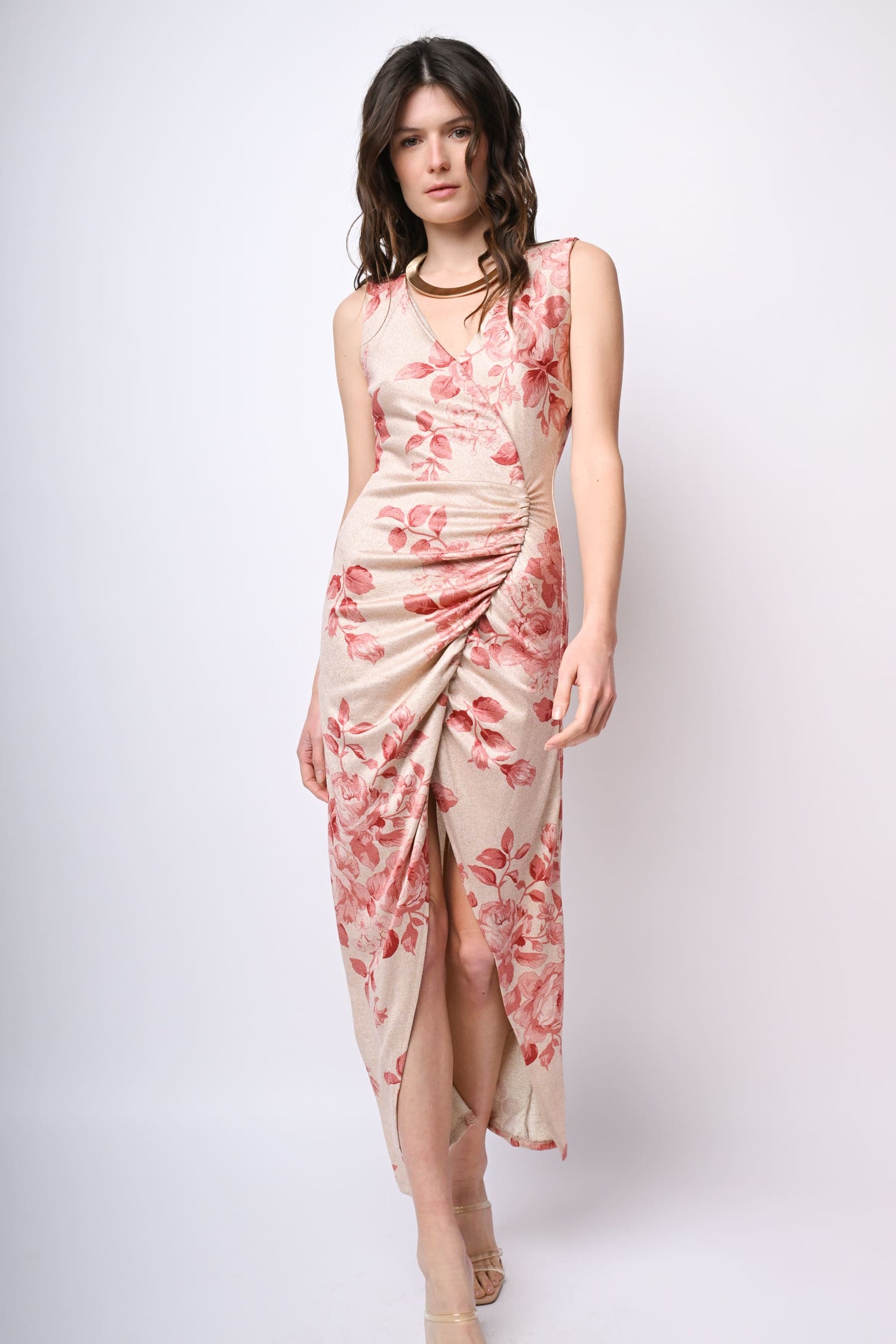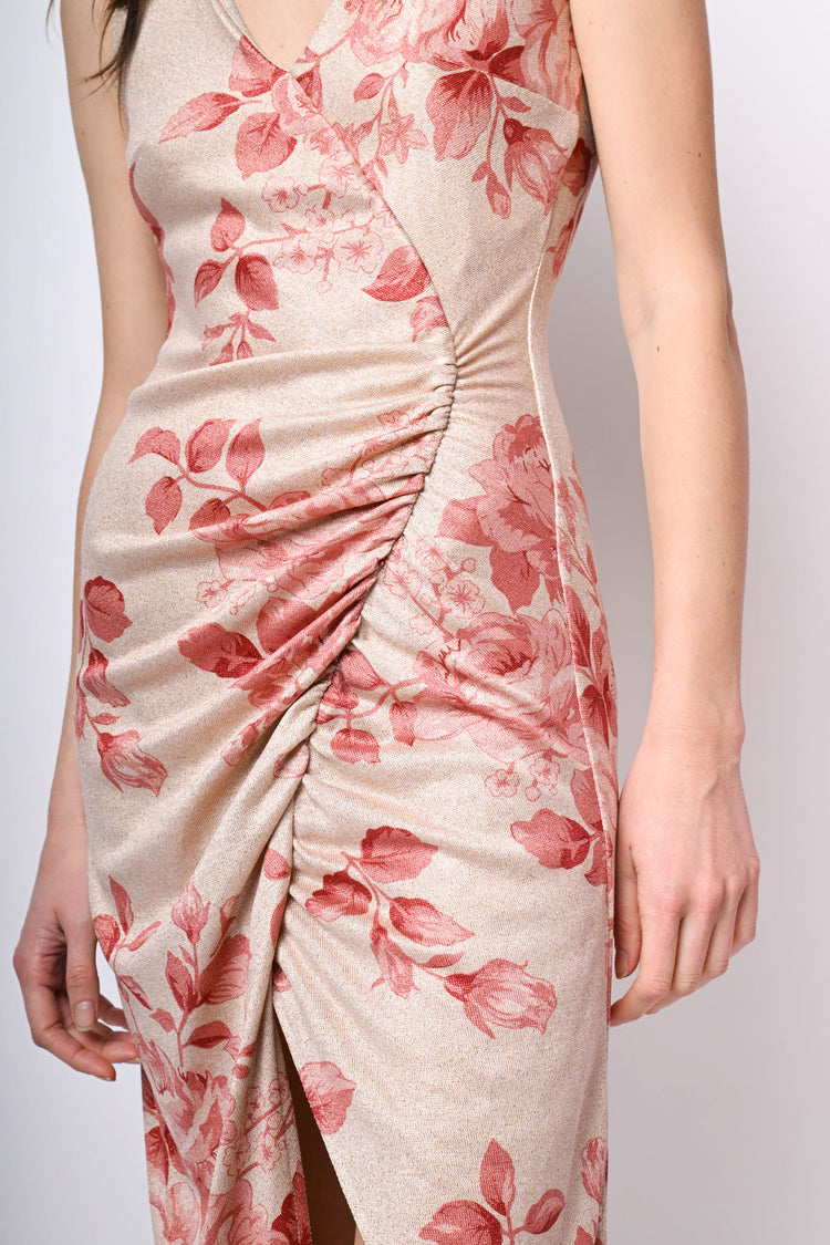 Abito midi in tessuto stretch lurex con stampa floreale nei toni del rosa su fondo beige, scollo a V, silhouette aderente, drappeggiata e sovrapposta e spacco frontale.