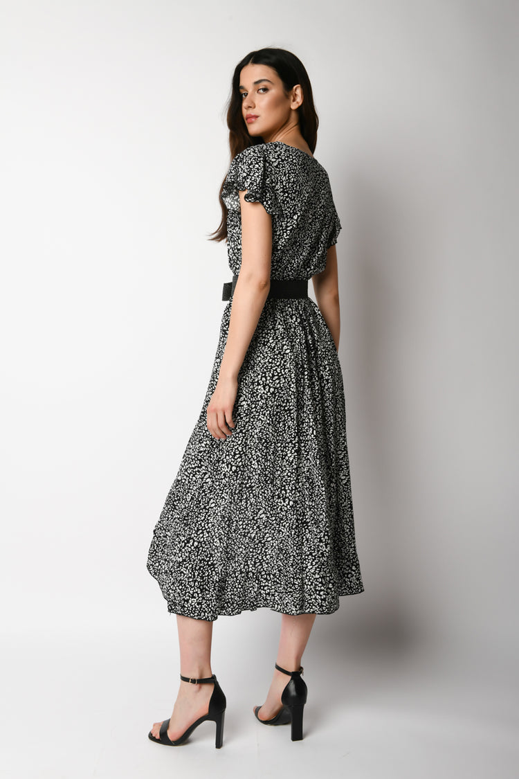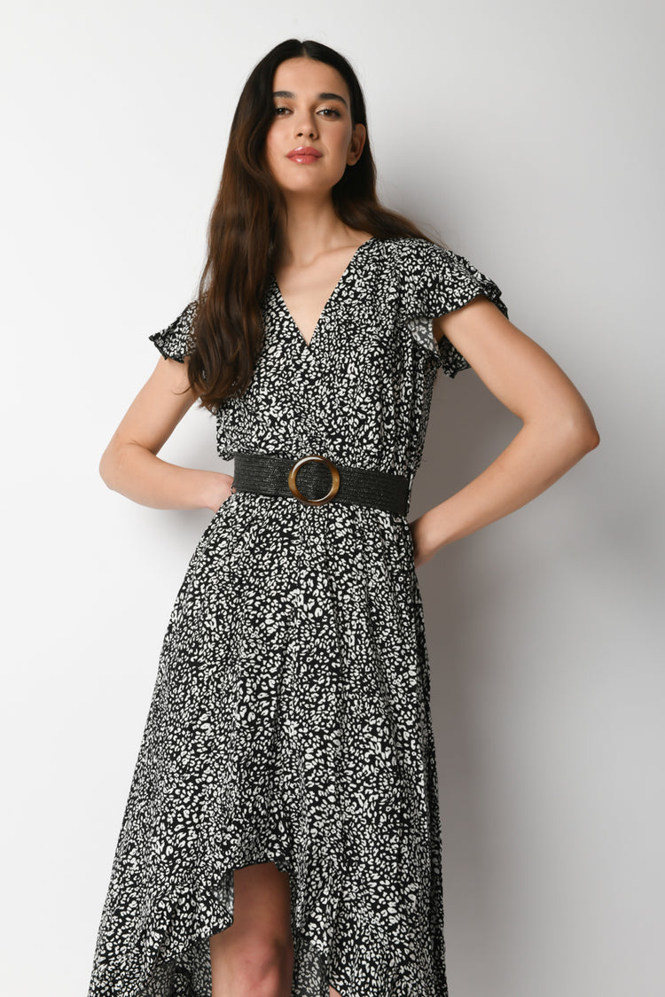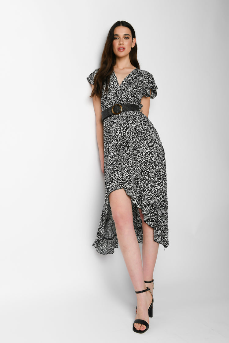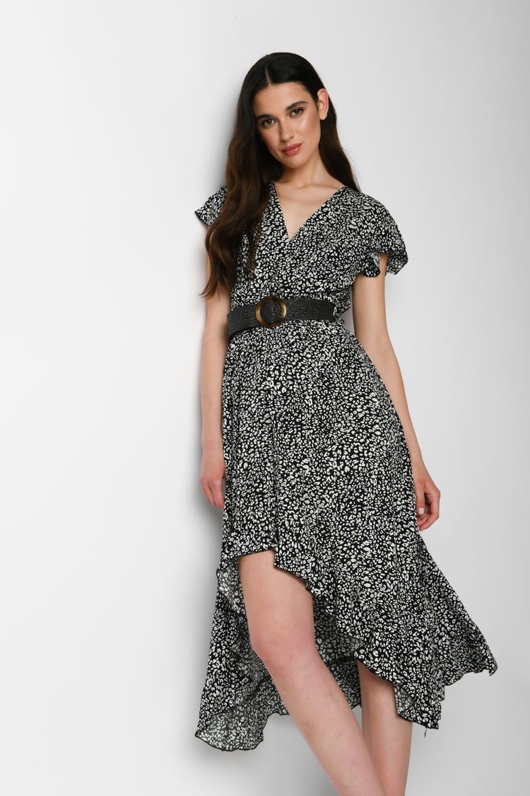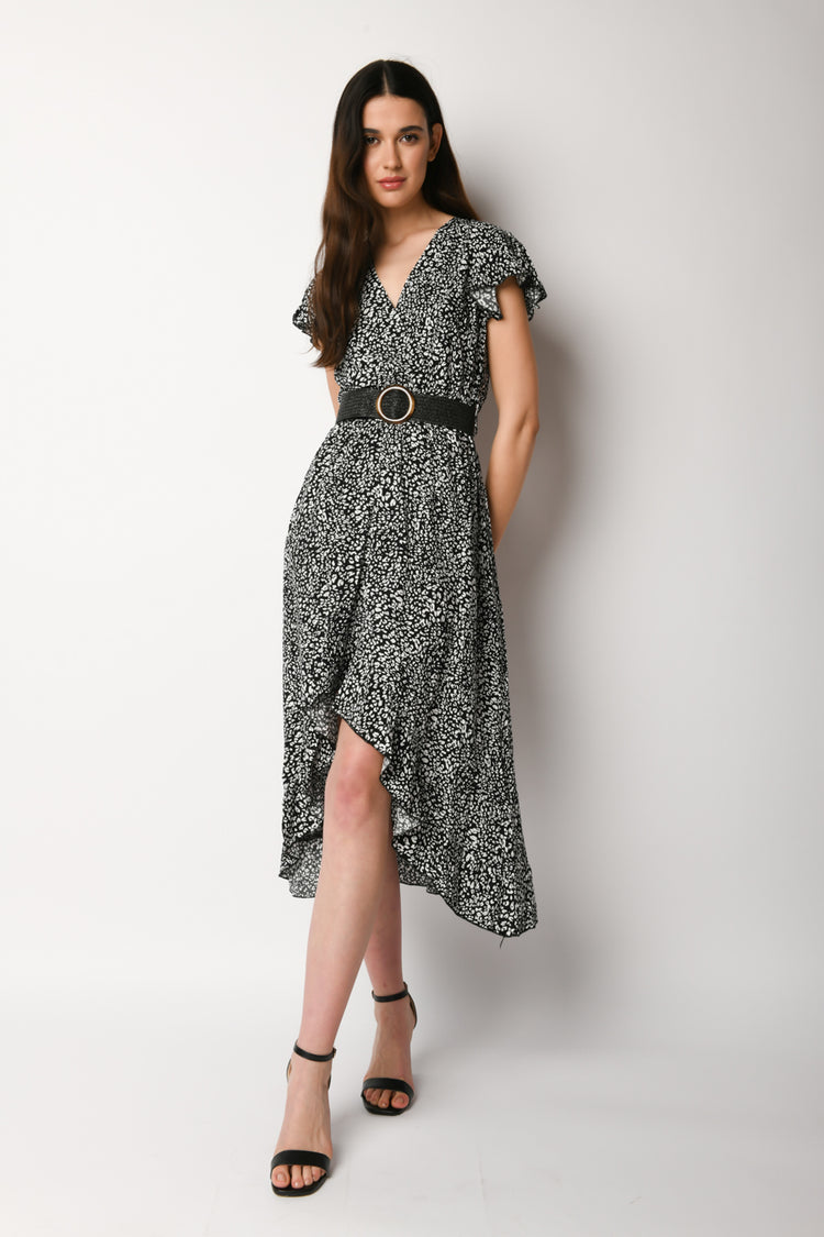 Abito in viscosa a stampa micro floreale bianca e nera con scollo a V incrociato, maniche ad aletta a volants, cintura alla vita in rafia nera con fibbia rotondava dorata e gonna asimmetrica più lunga sul retro con volant allorlo.
