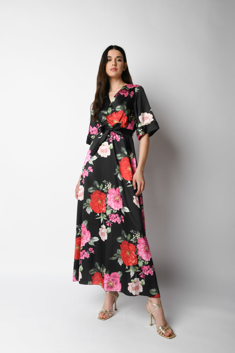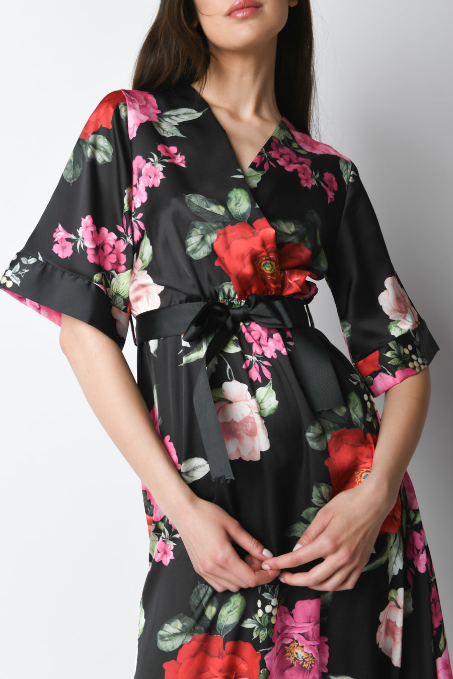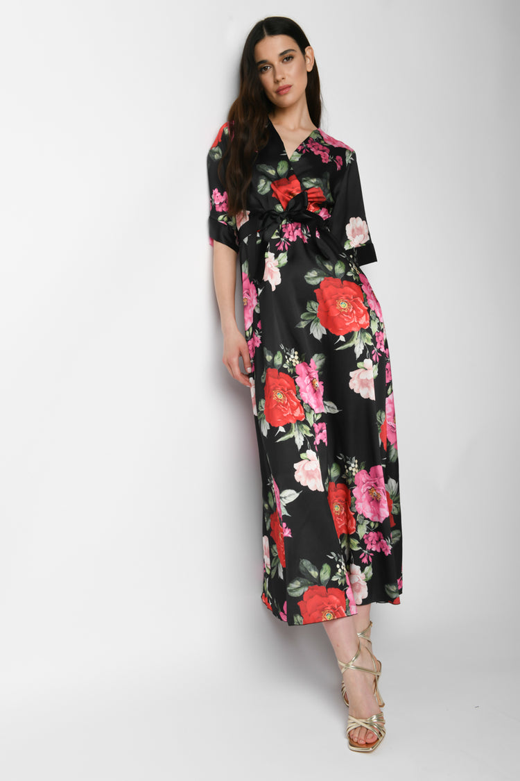 Abito lungo in raso a stampa floreale multicolor su fondo nero con scollo a V incrociato, maniche a kimono, cintura da annodare alla vita e gonna svasata.