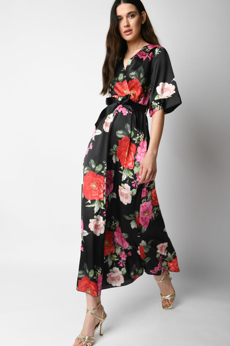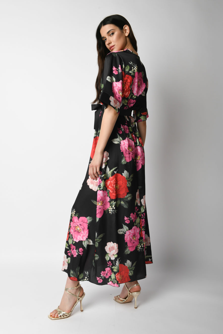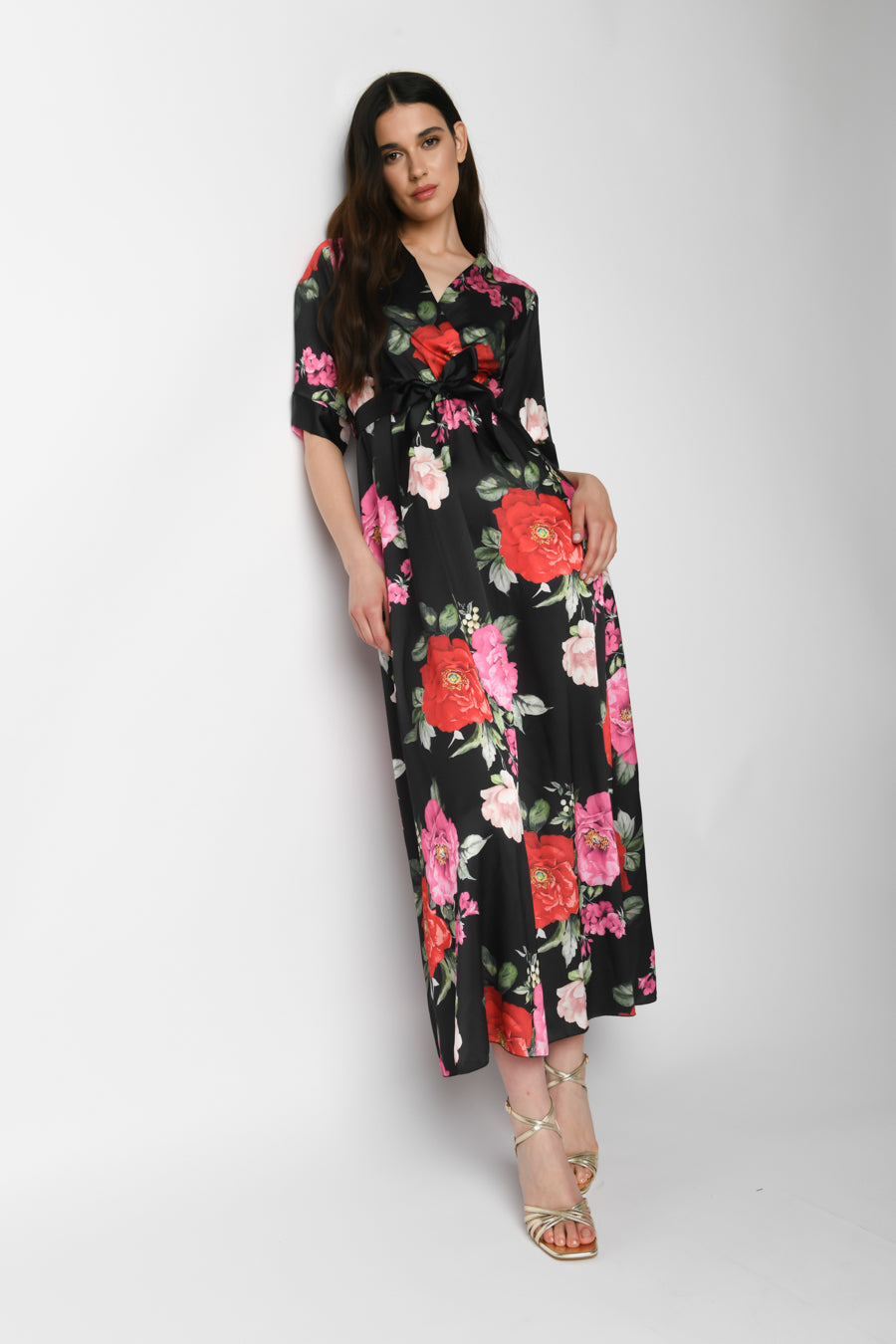 Abito lungo in raso a stampa floreale multicolor su fondo nero con scollo a V incrociato, maniche a kimono, cintura da annodare alla vita e gonna svasata.