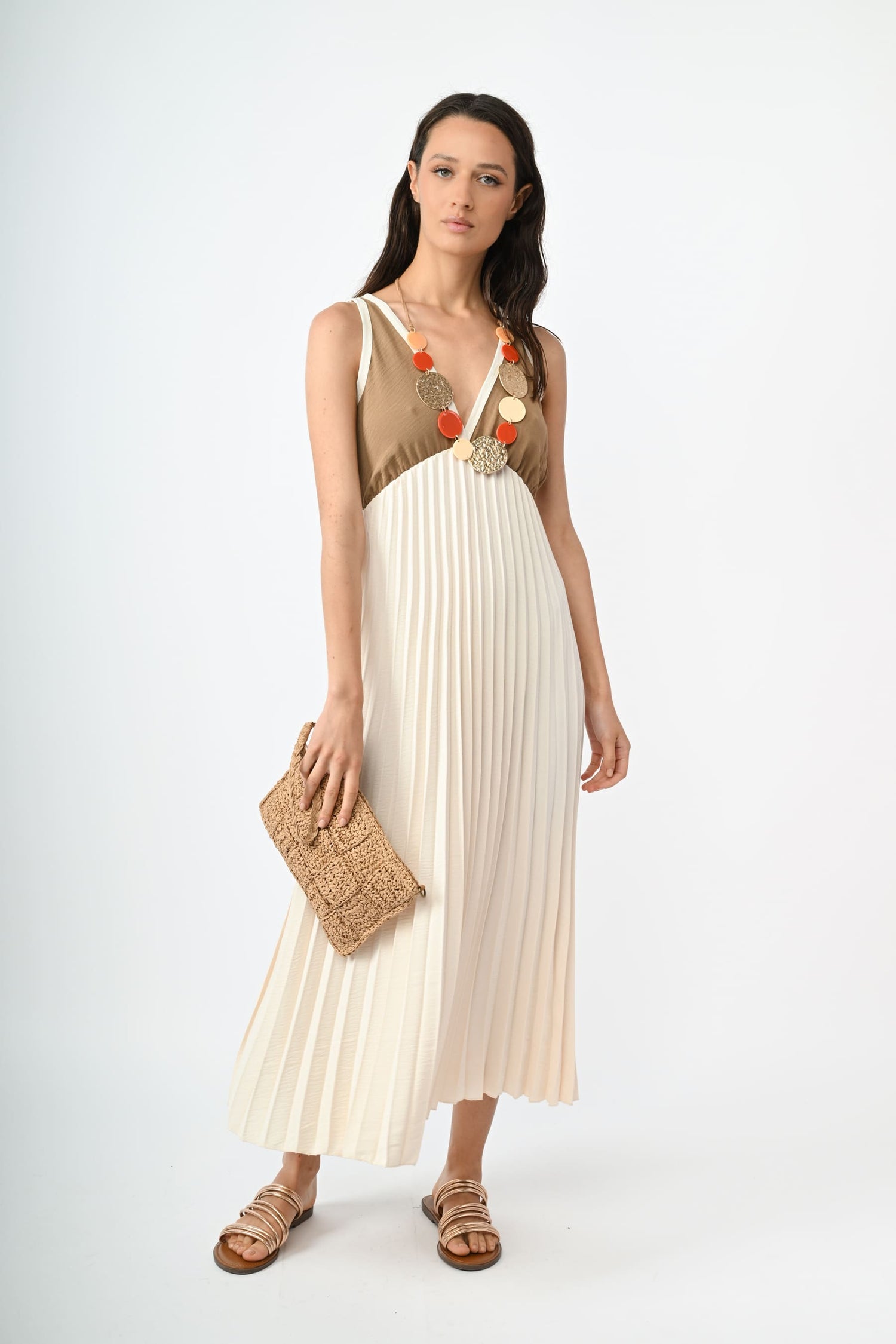 Abito lungo bi-materiale e bicolore nei toni del sabbia e bianco con scollo a V, vita elasticizzata sotto-seno e gonna plissettata.