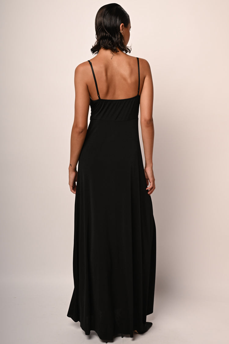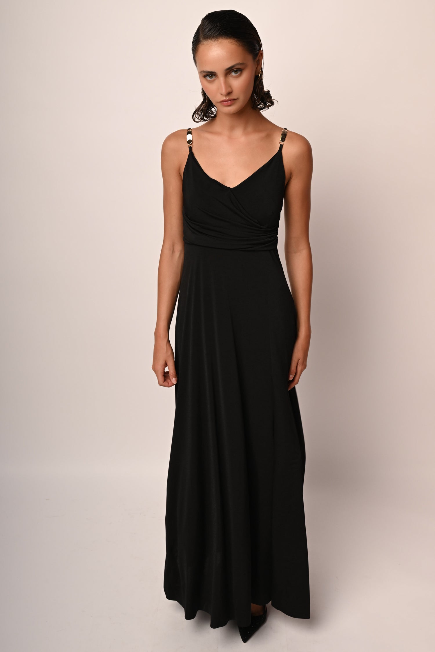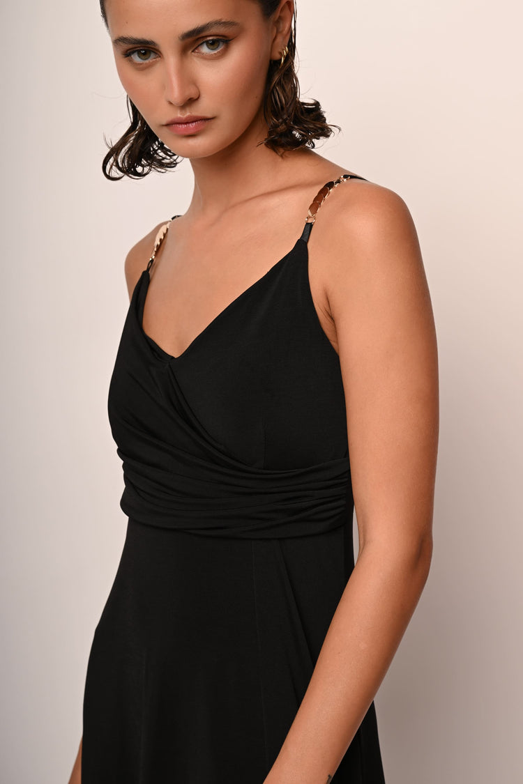 Abito lungo in tessuto stretch nero con spalline sottili regolabili impreziosite da cerchietti in metallo dorato, scollo a V incrociato e drappeggiato e spacco frontale.