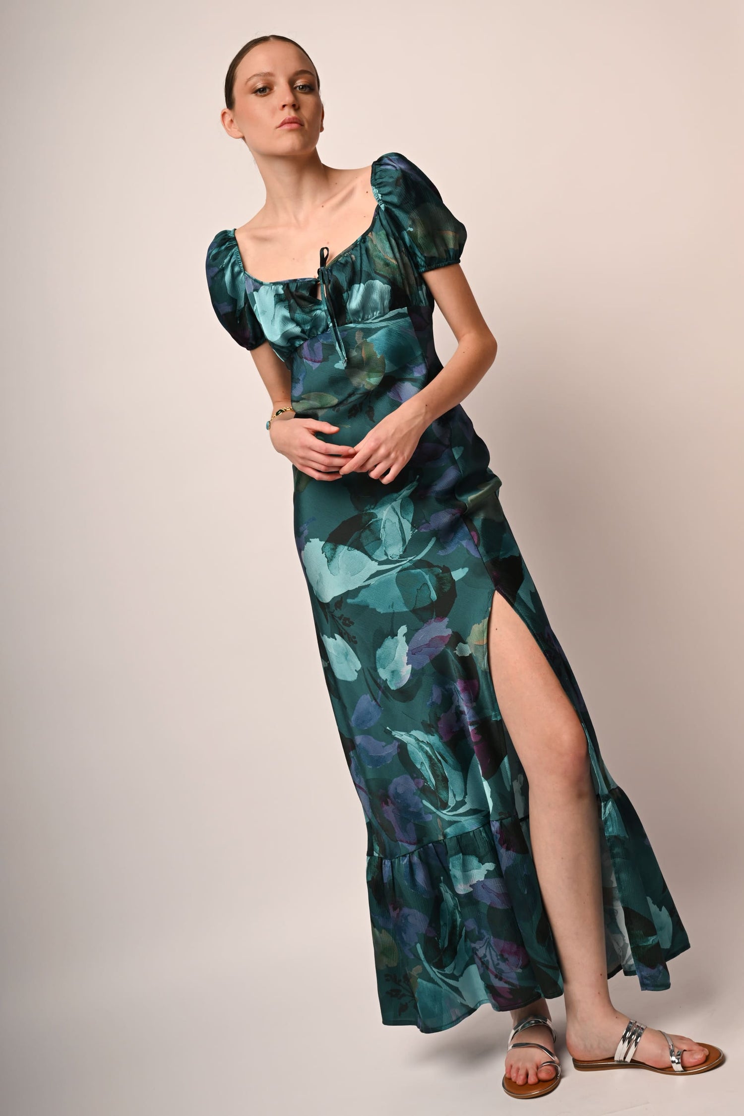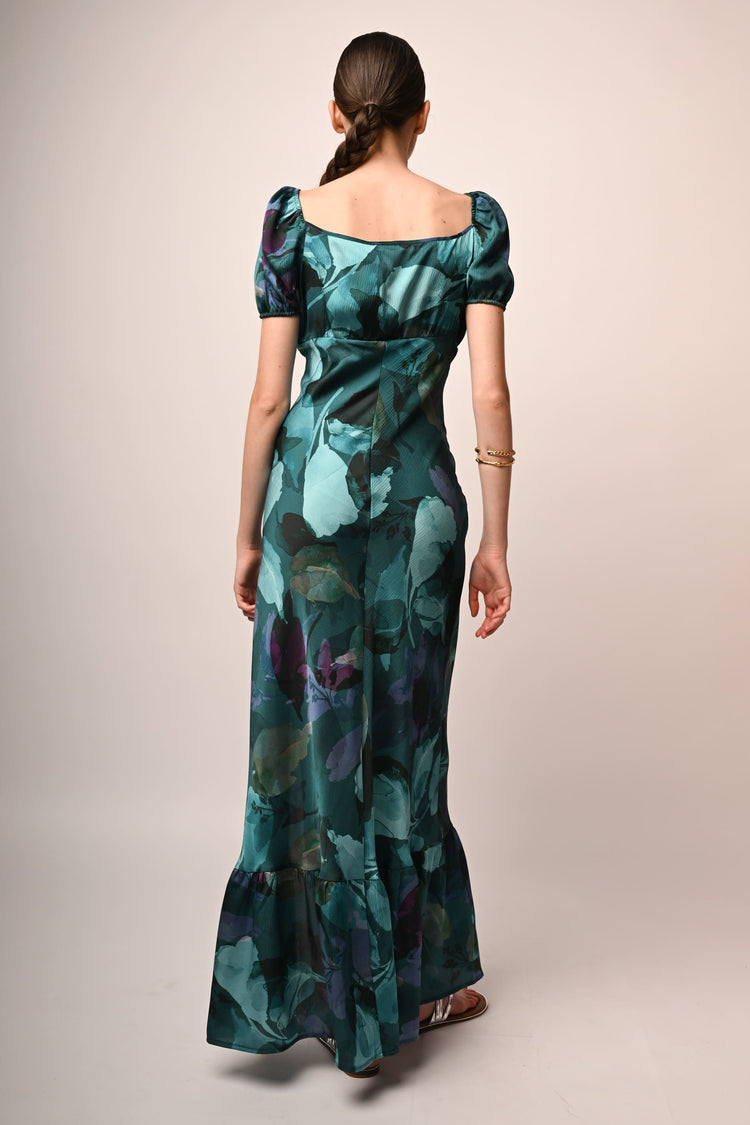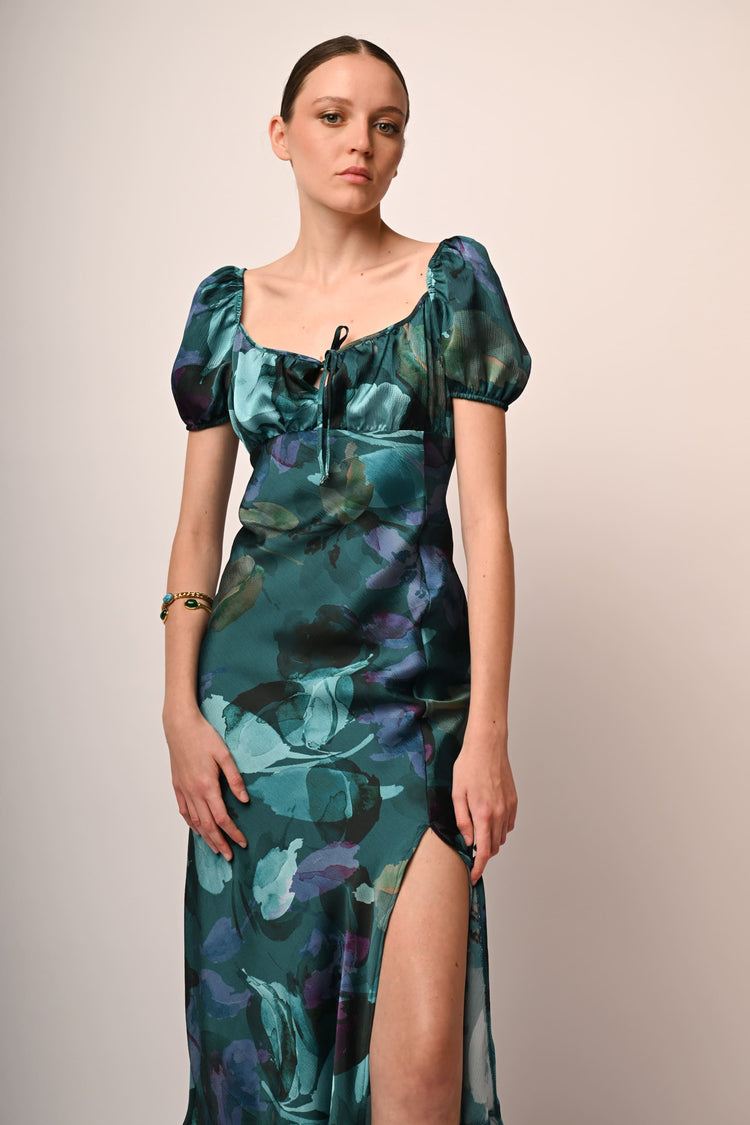 Abito lungo in tessuto stretch a stampa floreale astratta nei toni del verde con scollo a cuore, goccia e fiocchetto da annodare al centro del petto, maniche corte a palloncino, spacco frontale e balza al fondo.