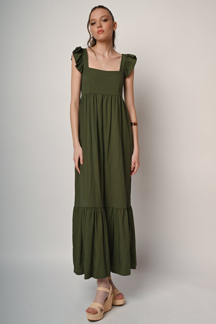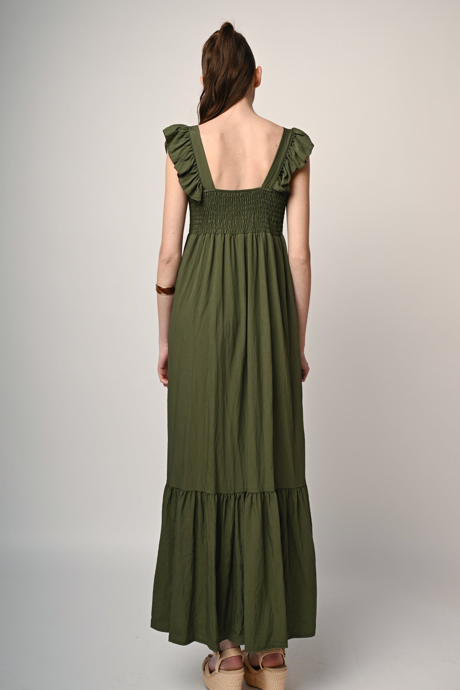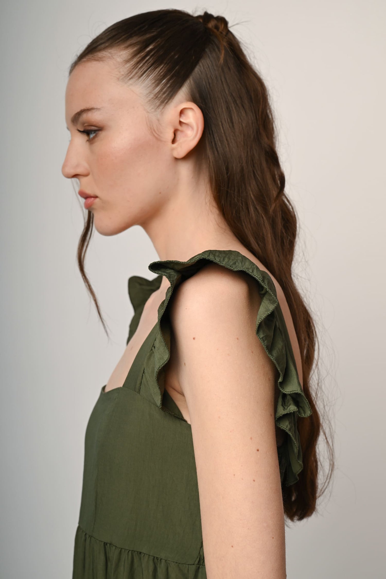 Abito lungo misto viscosa verde oliva con scollo quadrato, spalline sottili impreziosite da volants, corpetto sul retro elasticizzato a punto smock e balza al fondo.