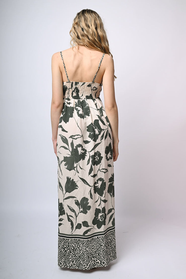 Abito lungo in tessuto misto viscosa effetto stropicciato con stampa macro floreale verde militare su fondo beige, spalline sottili, ampio scollo a V incrociato, taglio a impero elasticizzato sul retro e sotto-seno e gonna svasata.