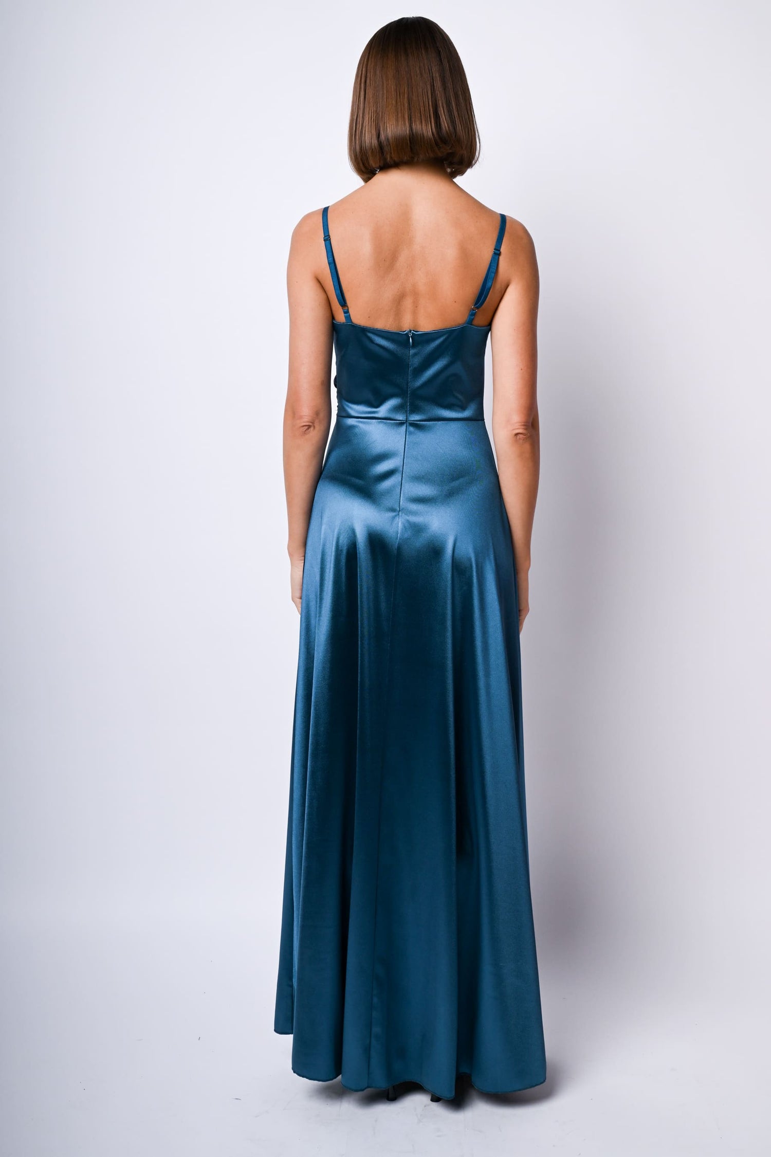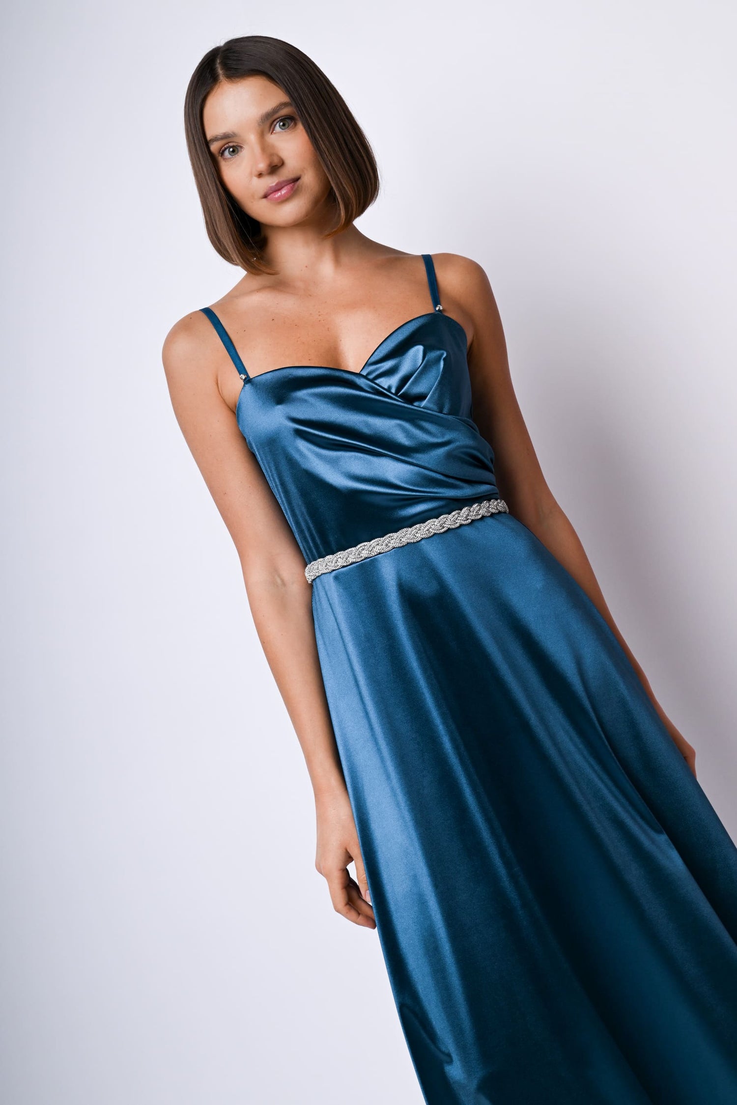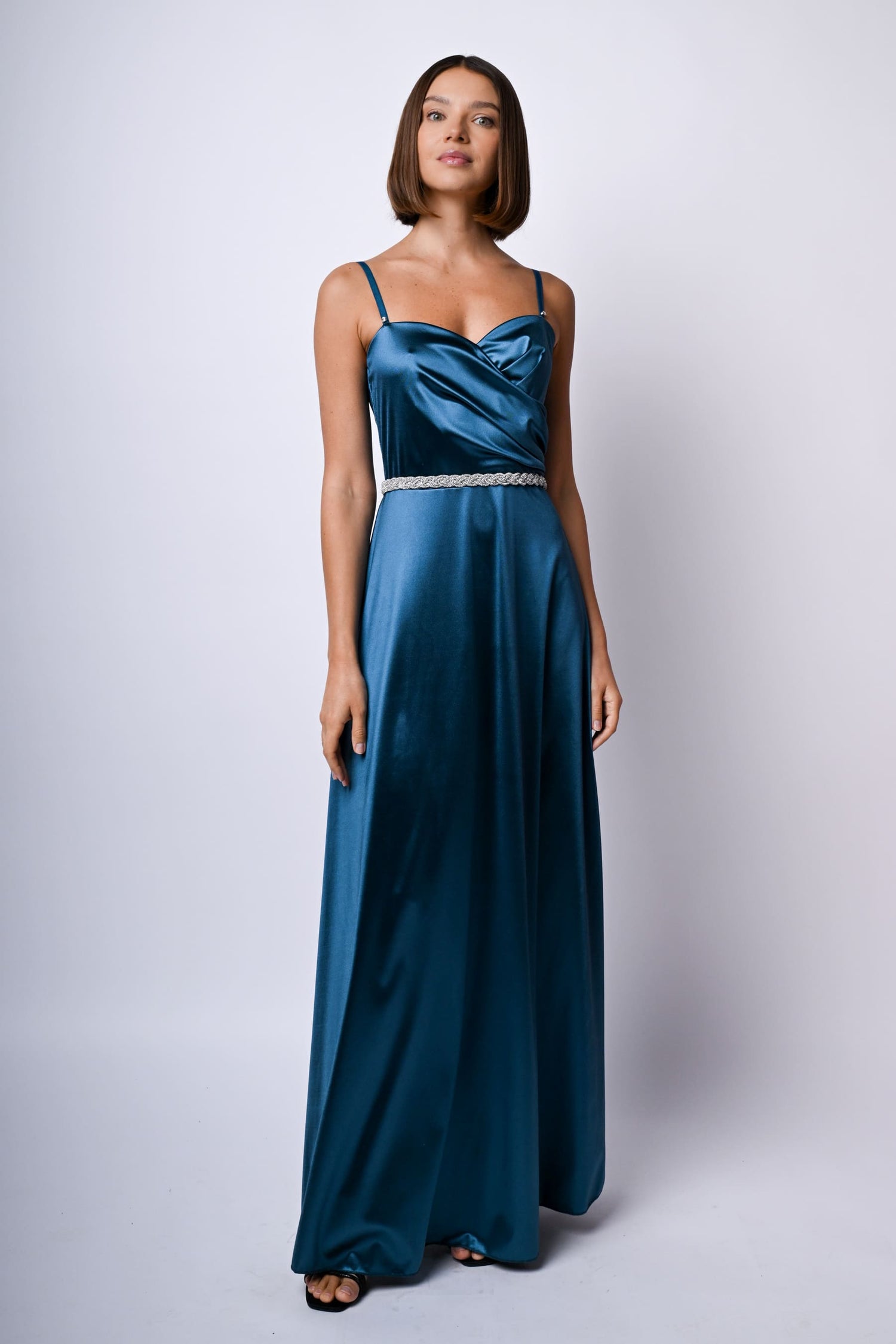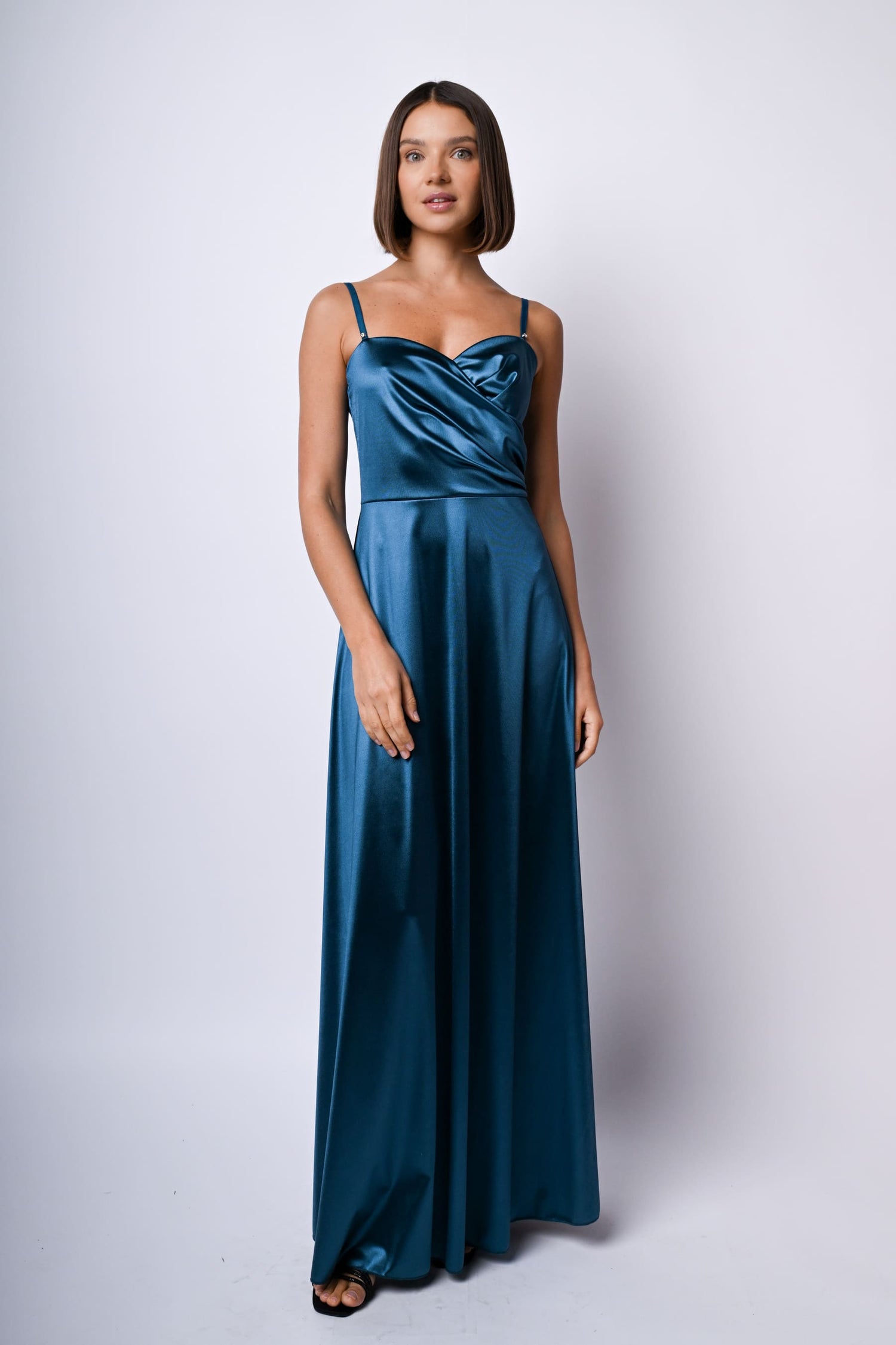 Abito lungo in raso stretch blu con spalline sottili regolabili, scollo a cuore, corpino sovrapposto e drappeggiato, chiusura con zip al centro dietro e gonna svasata a pieghe.