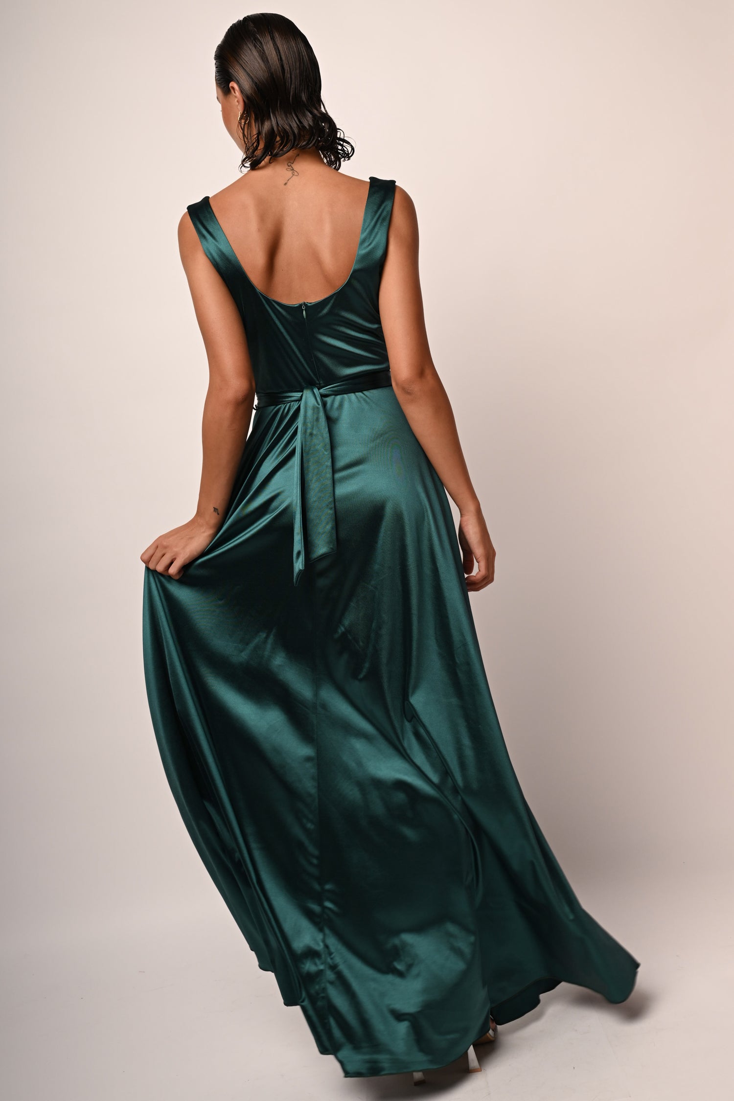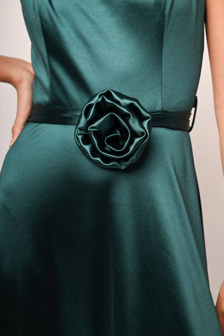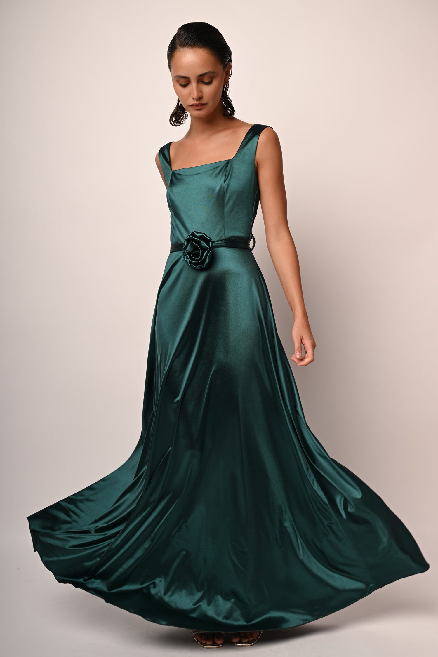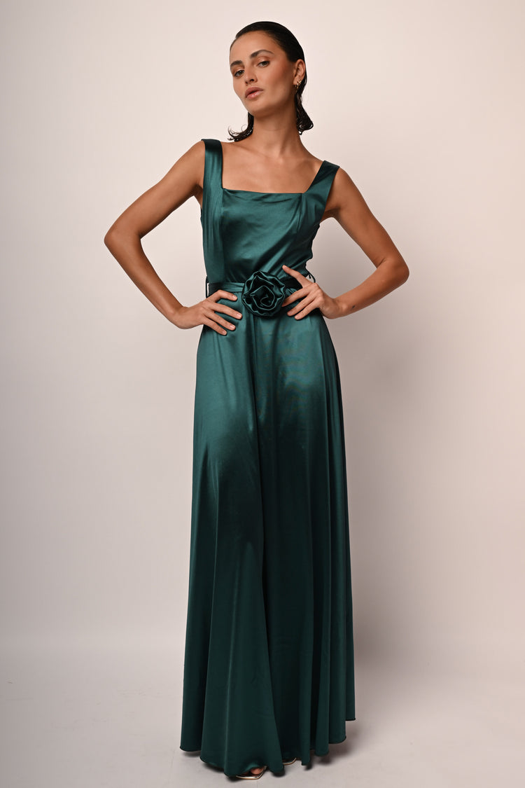 Abito lungo in raso stretch verde bottiglia con scollo quadrato, spalline sottili, chiusura con zip al centro dietro, cintura coordinata da annodare alla vita con rosa decorativa in tessuto tono su tono e gonna svasata.