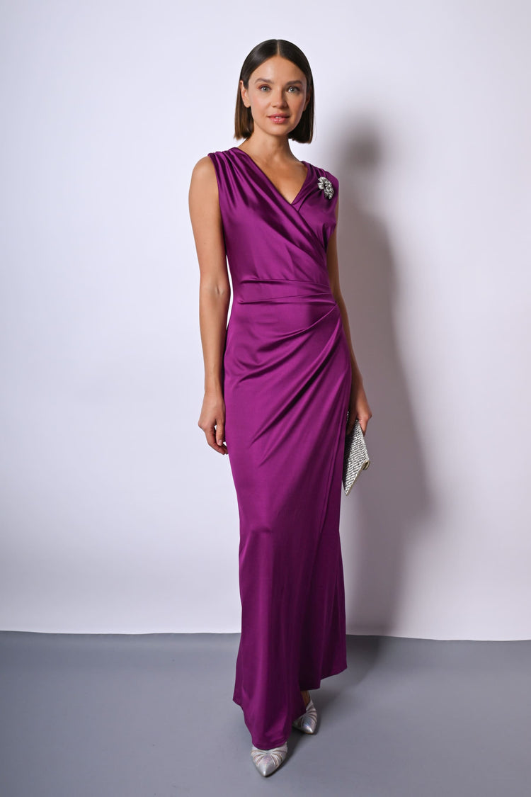 Abito lungo in raso stretch fucsia con scollo a V, taglio stile portafoglio drappeggiato sul fianco e spacco frontale.