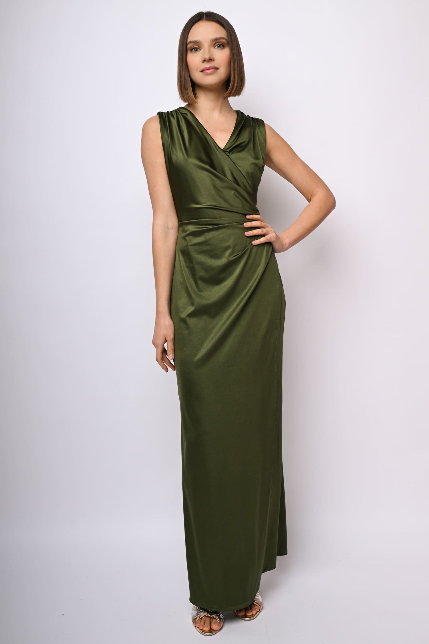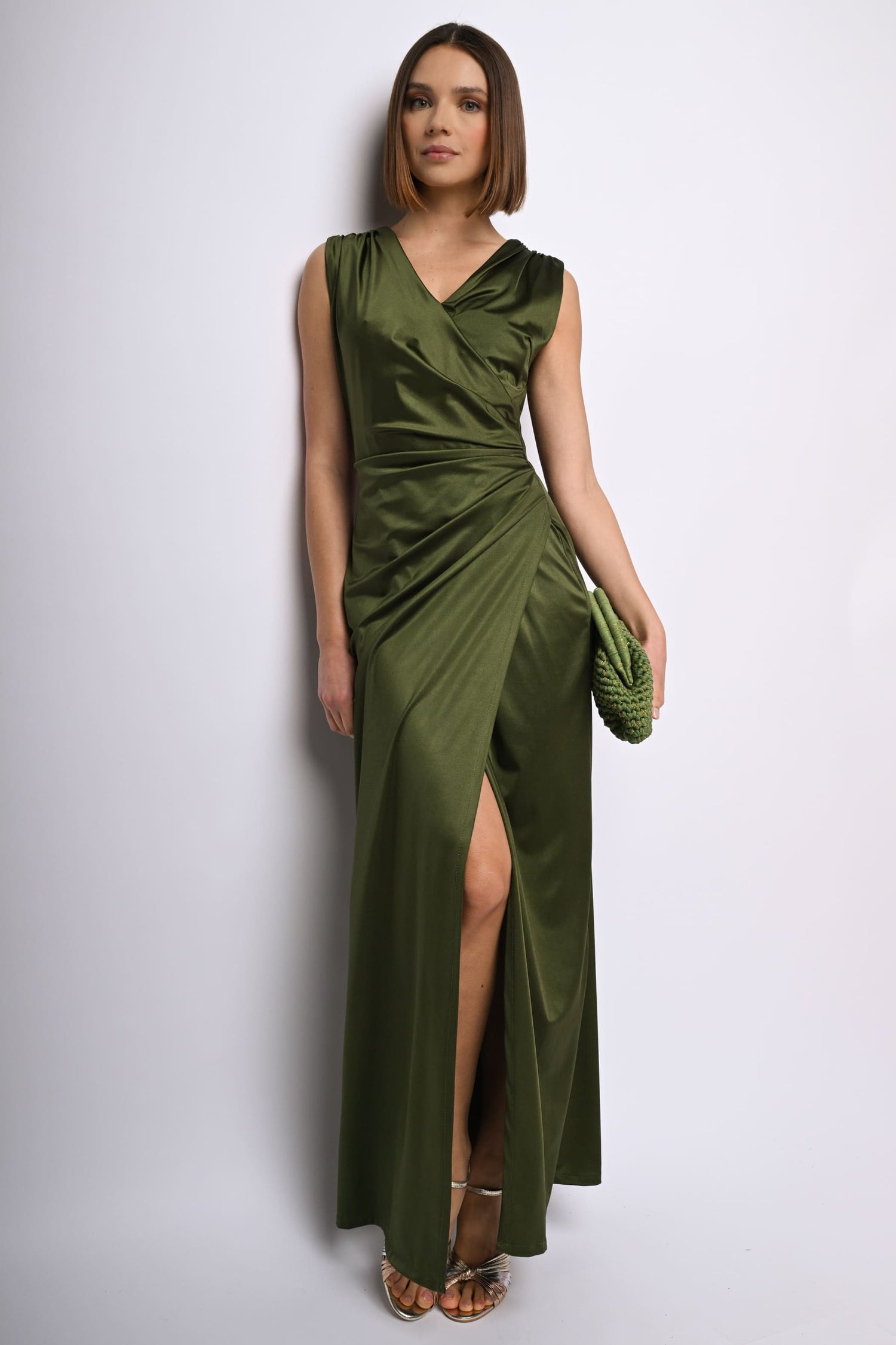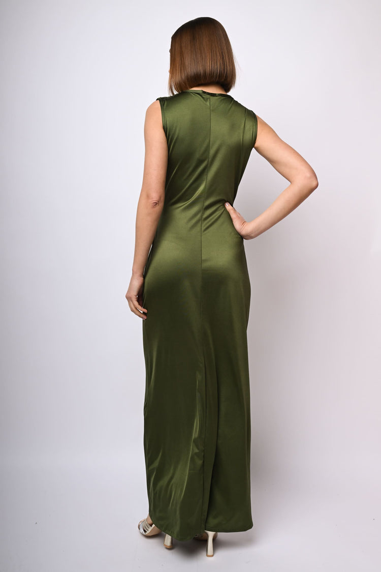 Abito lungo in raso stretch verde oliva con scollo a V, taglio stile portafoglio drappeggiato sul fianco e spacco frontale.