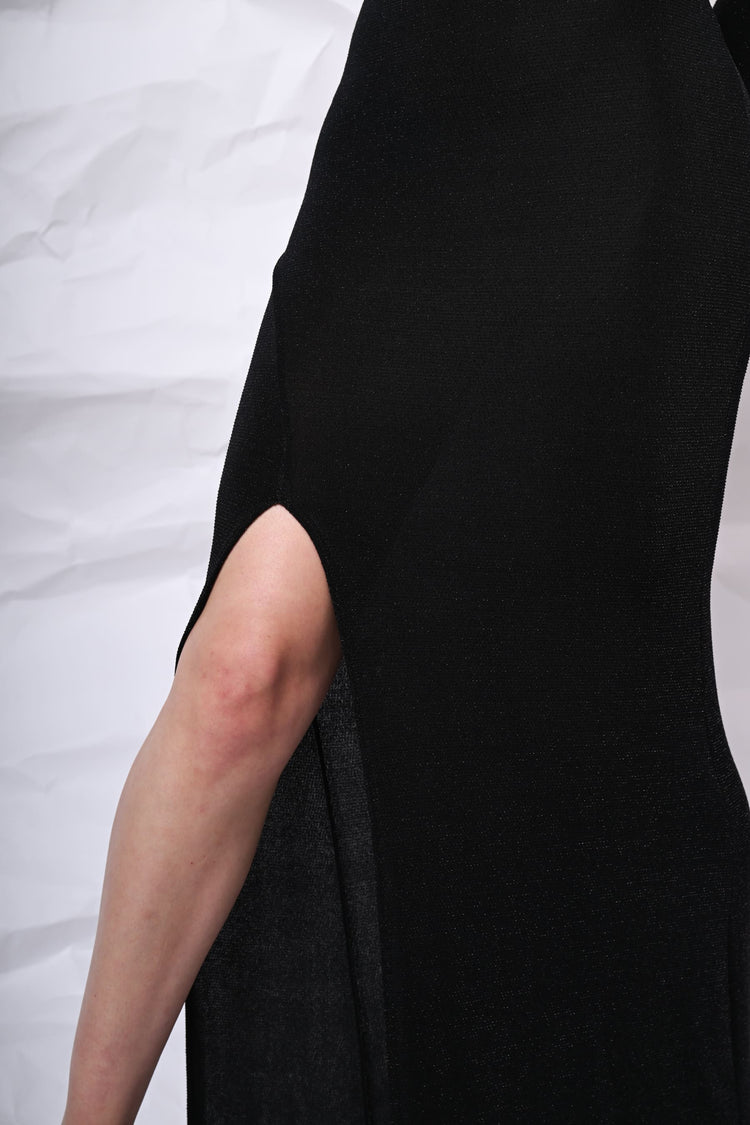 Abito lungo monospalla in jersey lurex nero con cut-out laterale, spacco frontale e silhouette aderente.