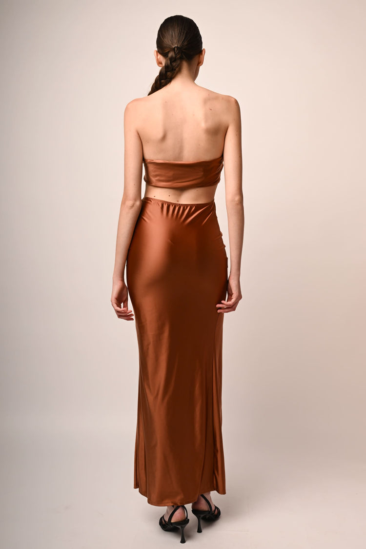 Abito lungo in raso stretch marrone chiaro contraddistinto da top a fascia strutturata con taglio a V centrale, cut-out alla vita effetto due pezzi sul retro, silhouette aderente e spacco frontale.