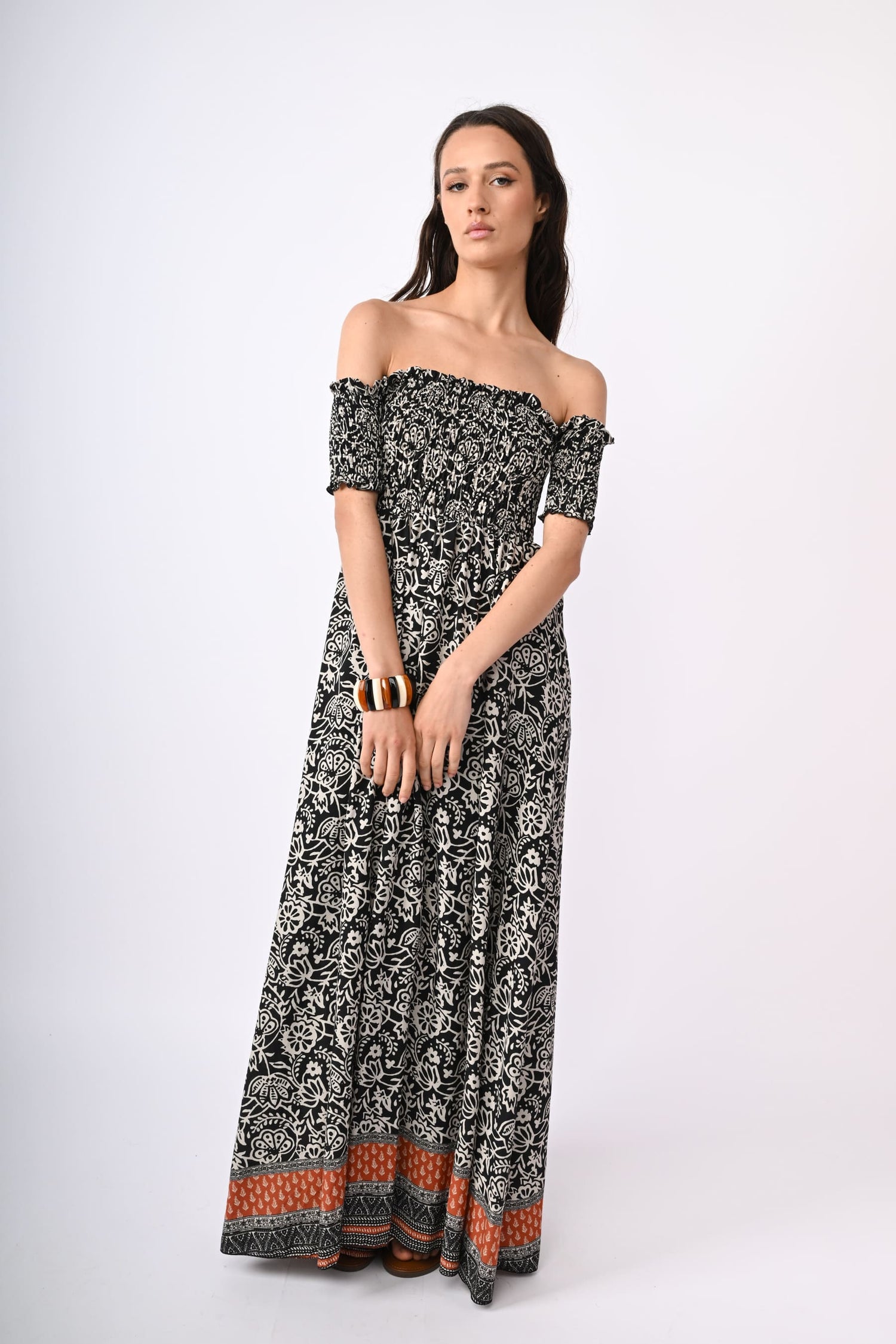 Abito lungo in viscosa a stampa etnica bianca e multicolor su fondo nero con spalle scoperte, corpetto e maniche corte elasticizzati a punto smock.