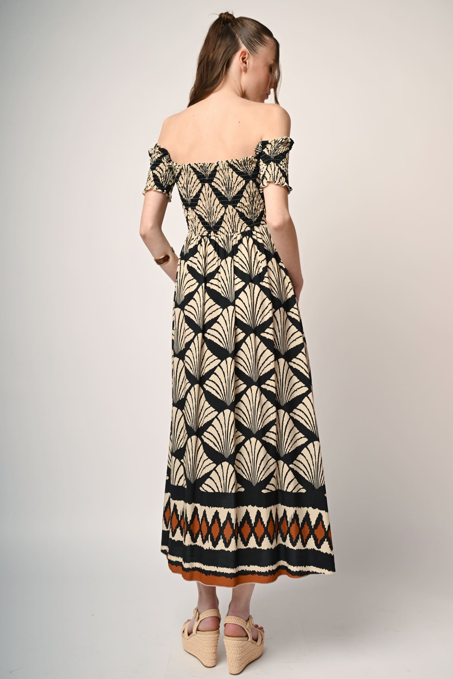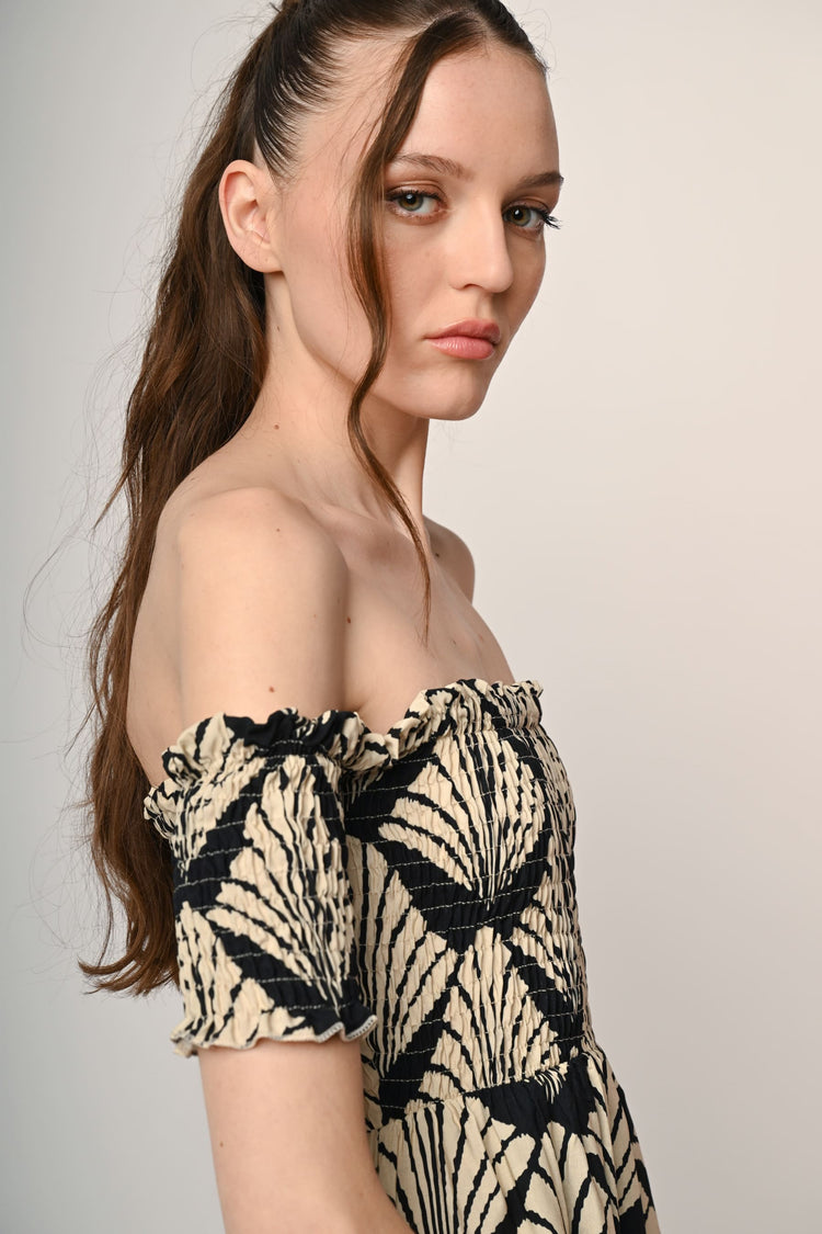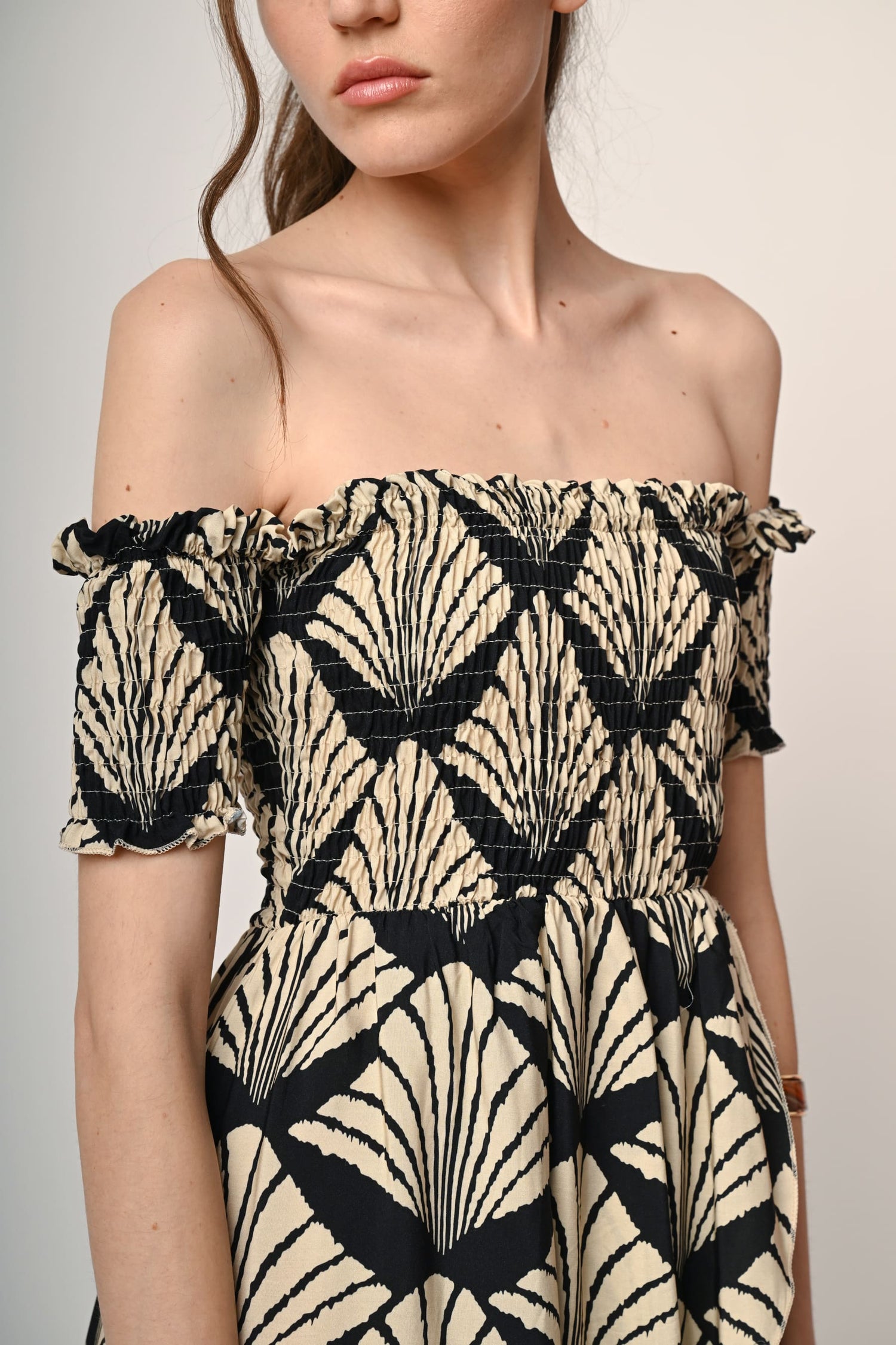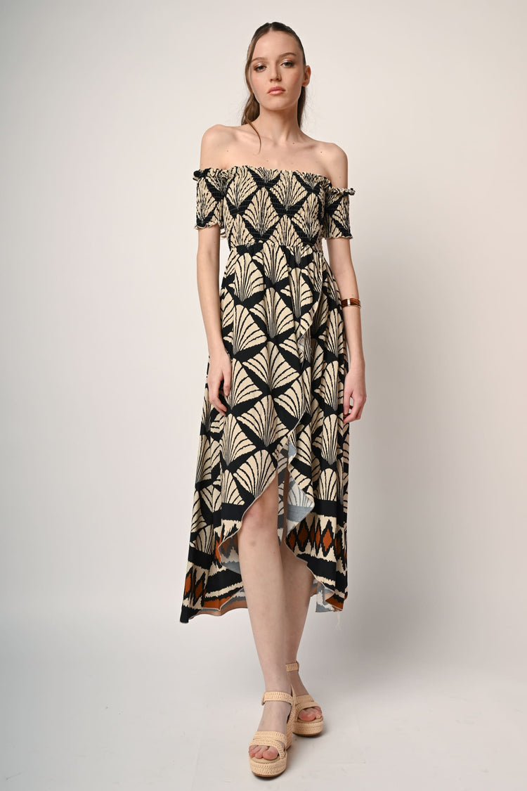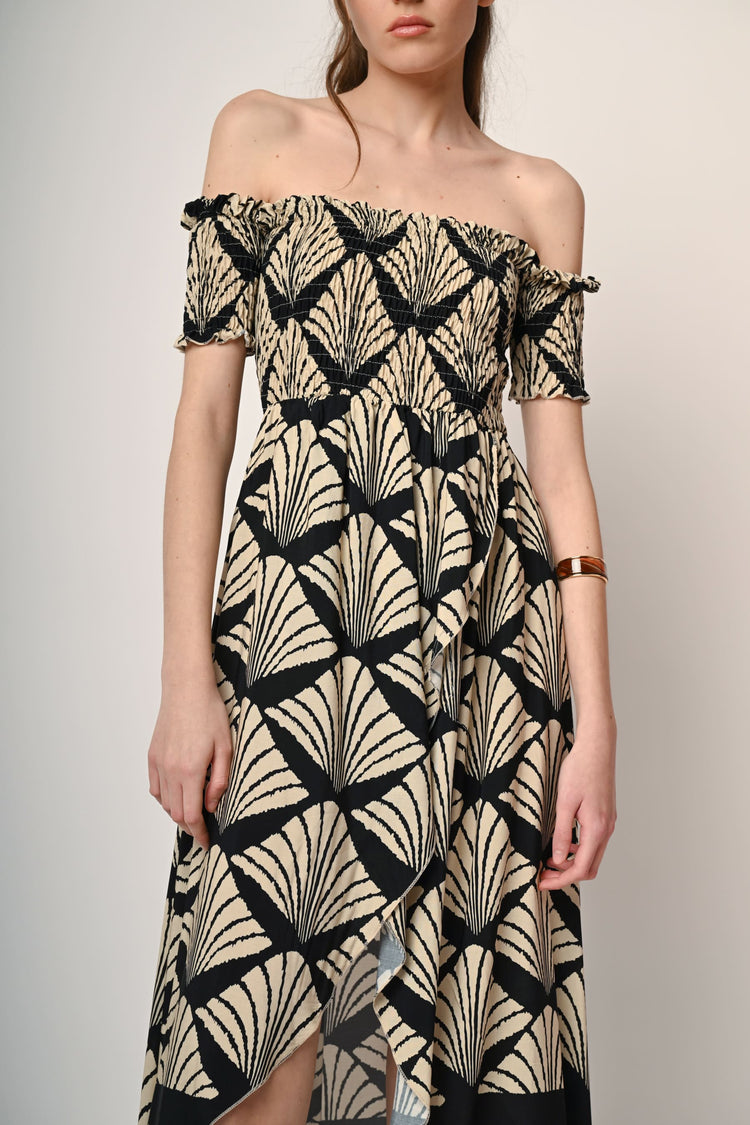 Abito midi in viscosa a stampa etnica nei toni del nero e beige con spalle scoperte, corpetto a punto smock, maniche corte, gonna con taglio sovrapposto e orlo più corto sul davanti.