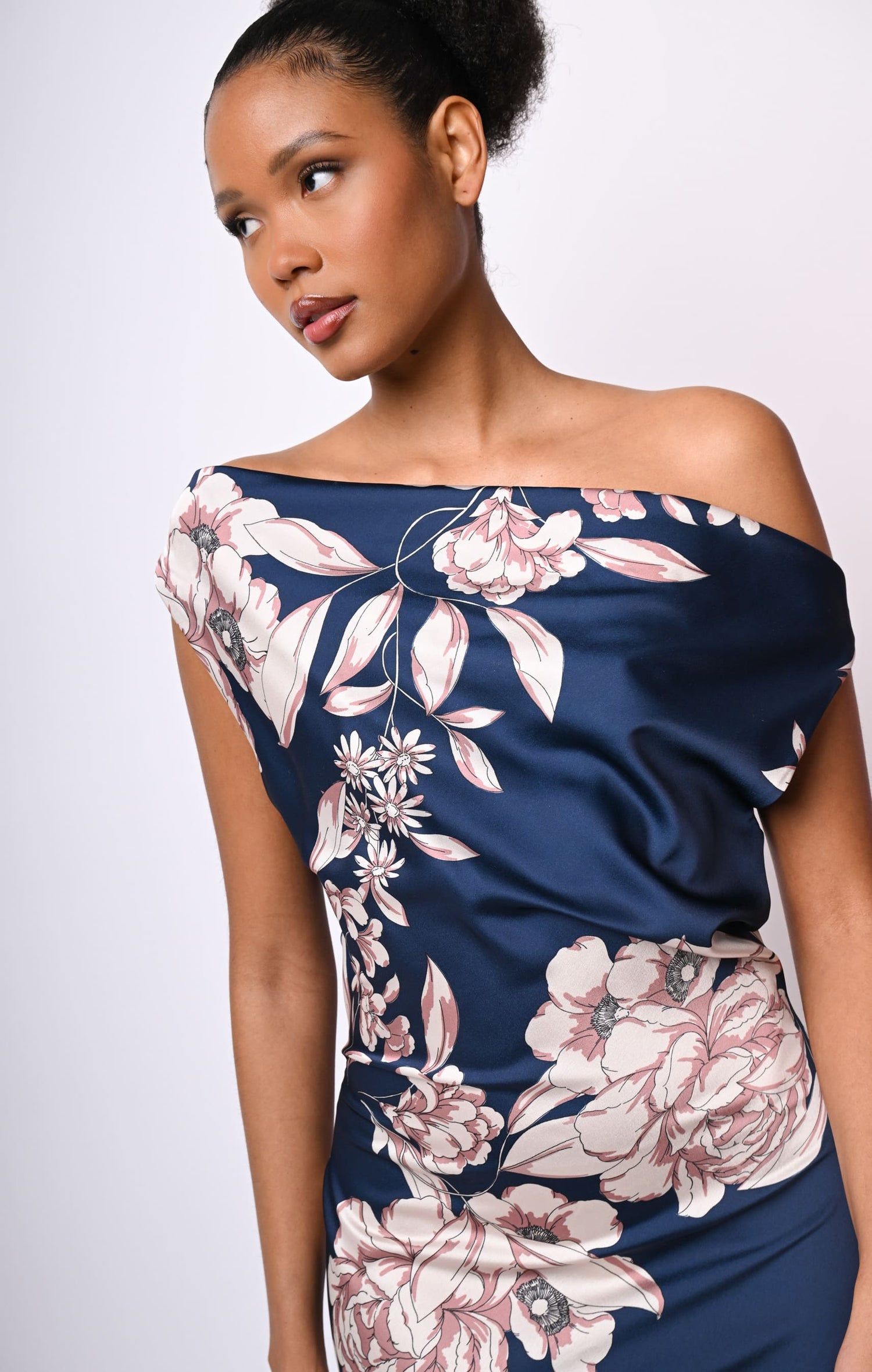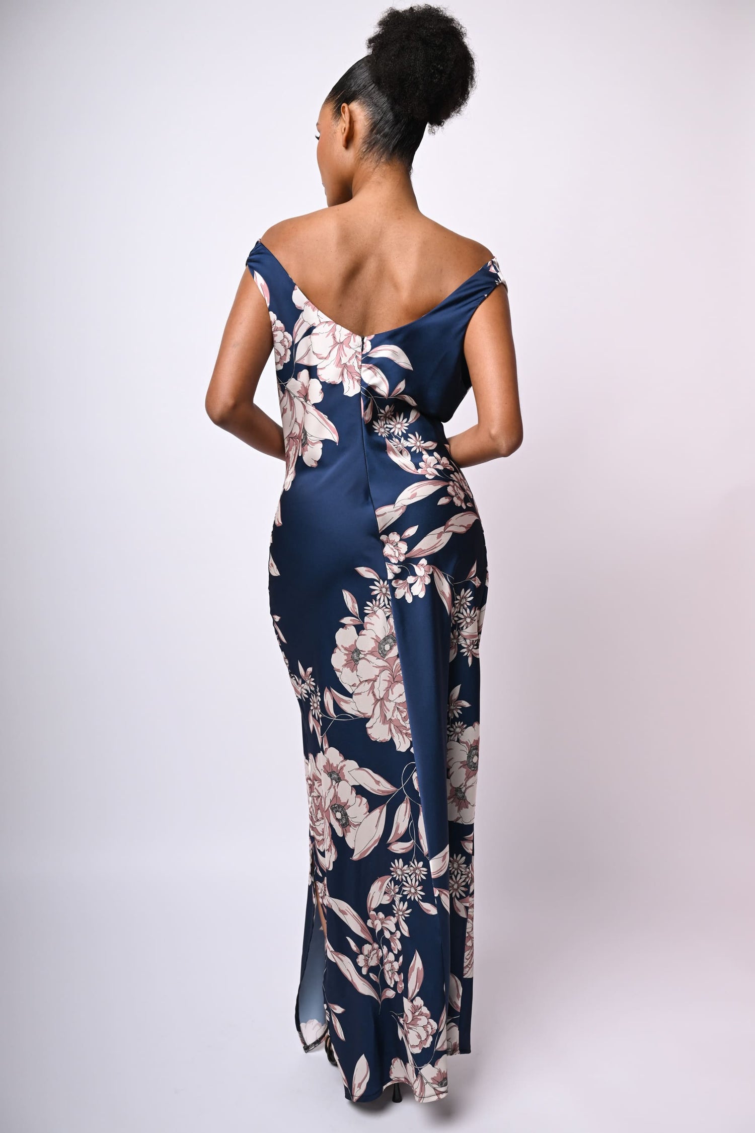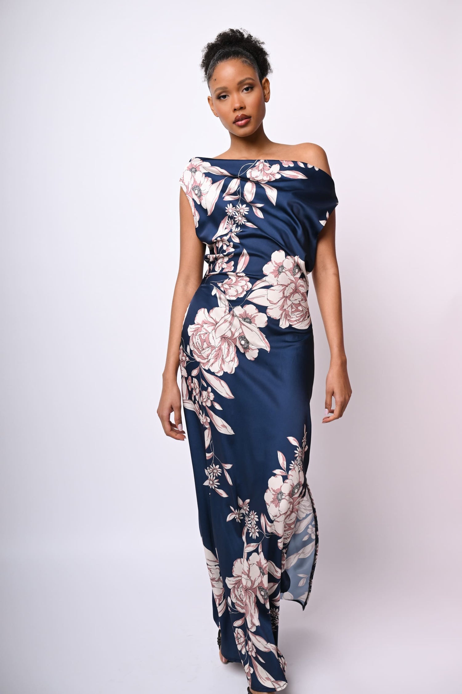 Abito lungo in raso a stampa floreale nei toni del rosa su fondo blu con ampi scollo drappeggiato sul davanti, chiusura con zip al centro dietro e spacco laterale.