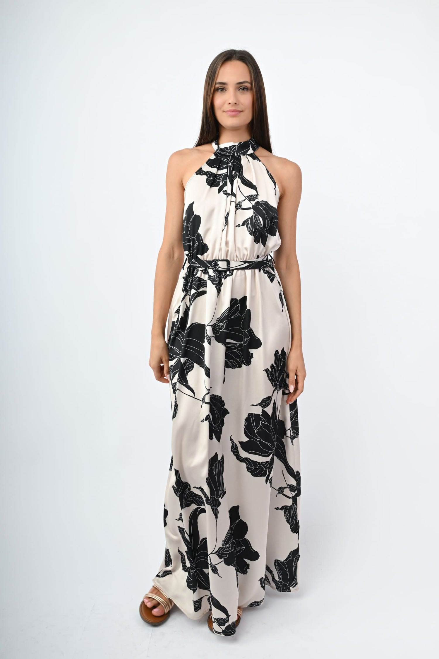 Abito lungo in raso a stampa grafica floreale nera su fondo bianco con taglio allamericana, colletto tondo rialzato, scollo a goccia con bottoni di chiusura sul retro, vita elasticizzata e cintura coordinata con fibbia rettangolare ricoperta in tessuto.