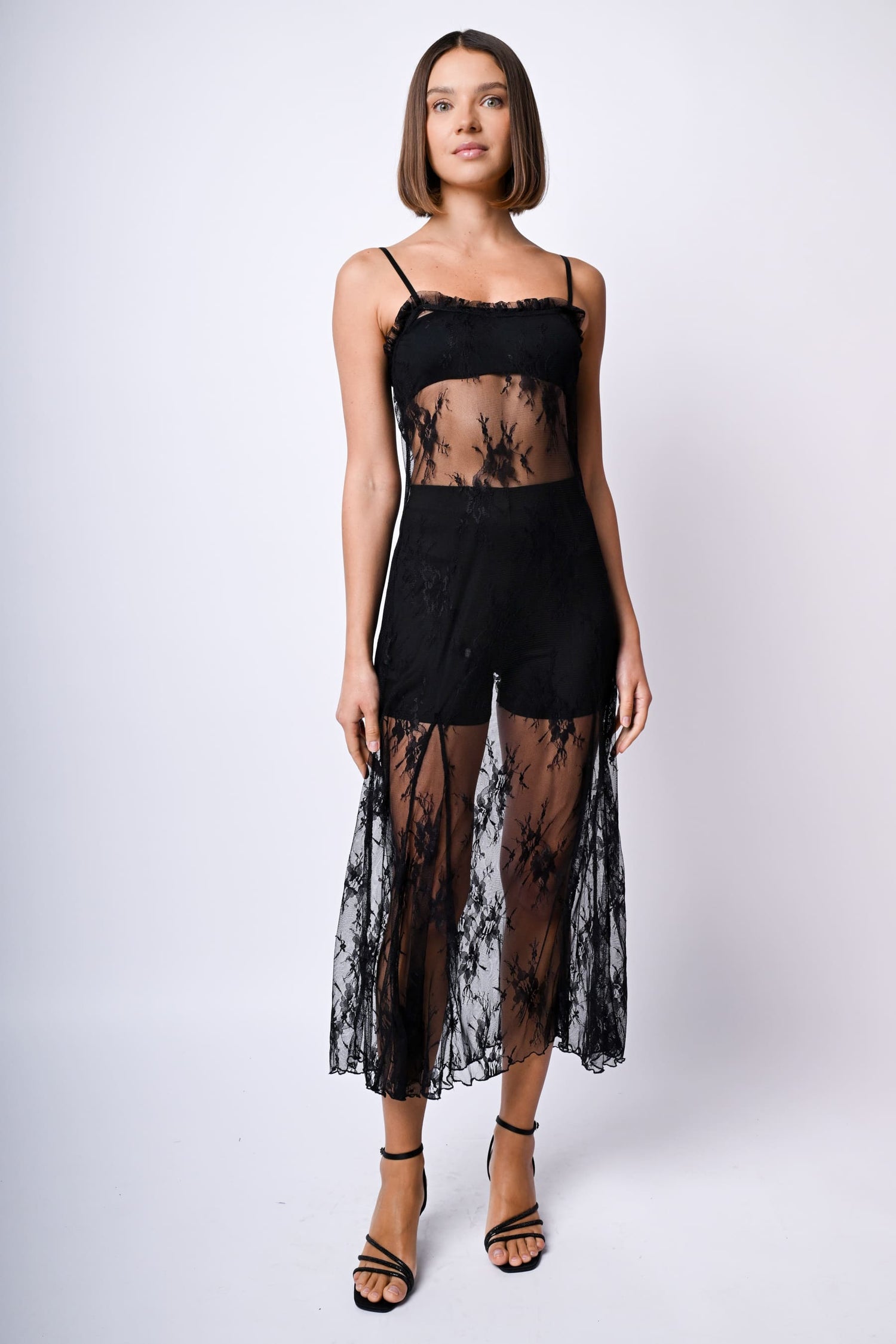 Abito lungo in pizzo trasparente nero con spalline sottili regolabili, scollo dritto con rouches e taglio svasato.