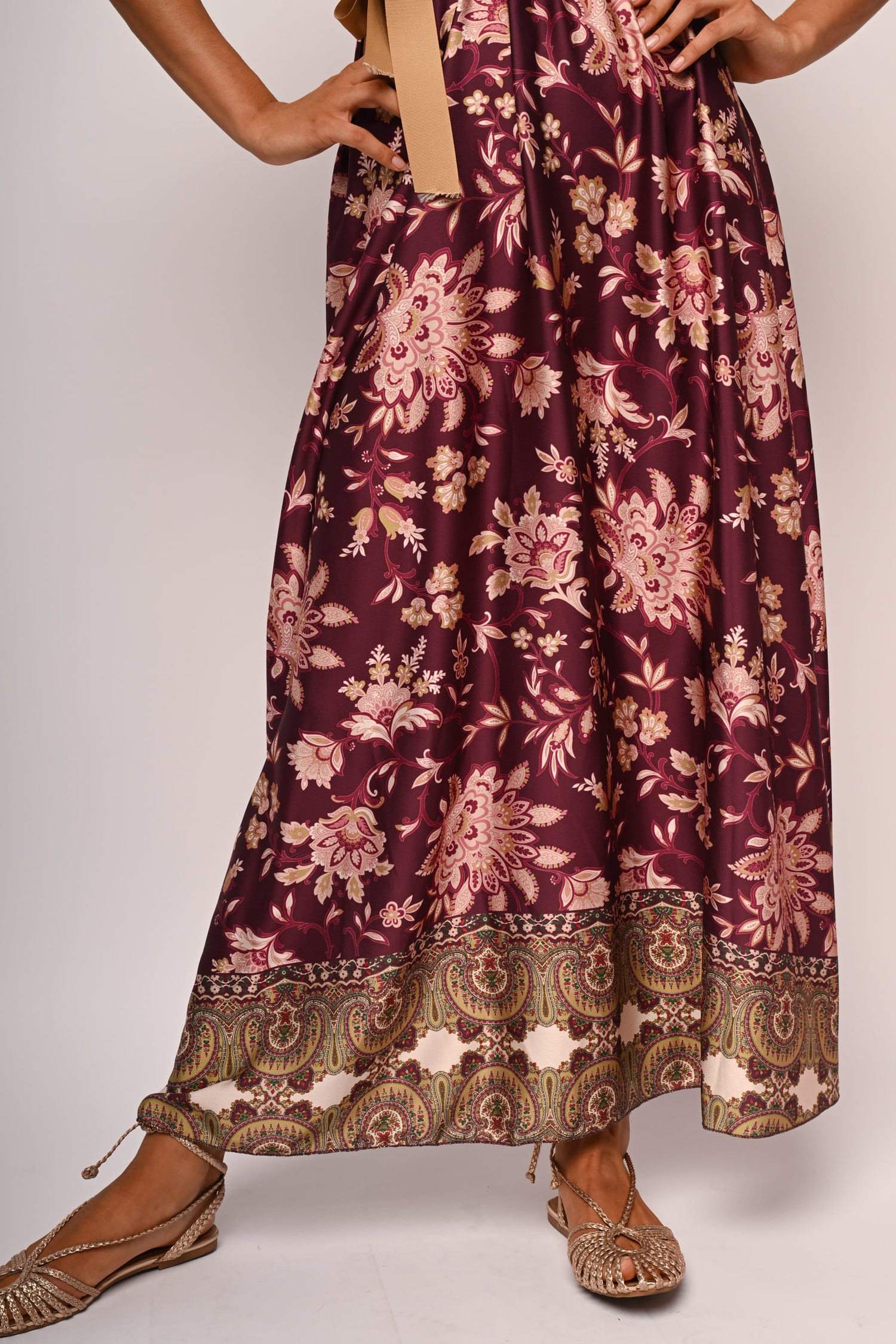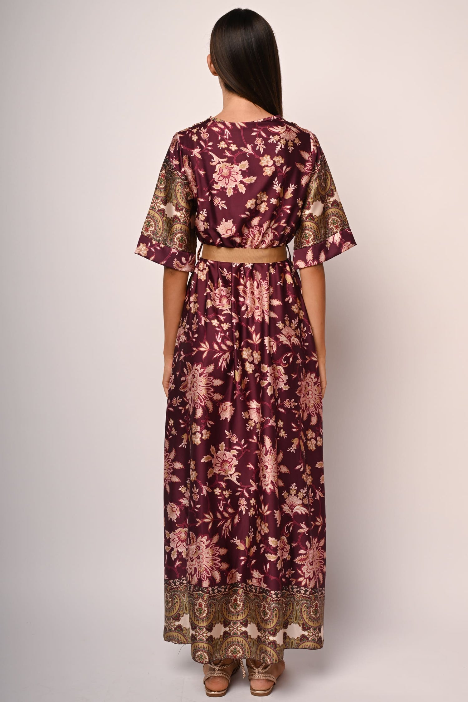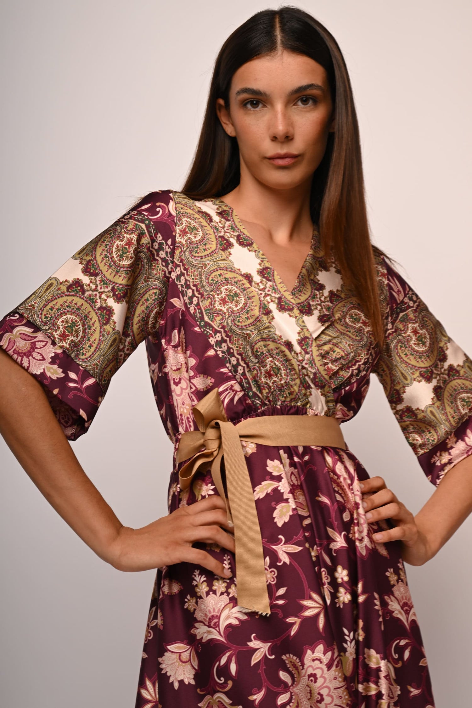 Abito lungo in raso a stampa etnico-floreale multicolor con scollo a V sovrapposto, maniche corte a kimono con risvolto e vita elasticizzata con cintura in tessuto marrone da annodare.