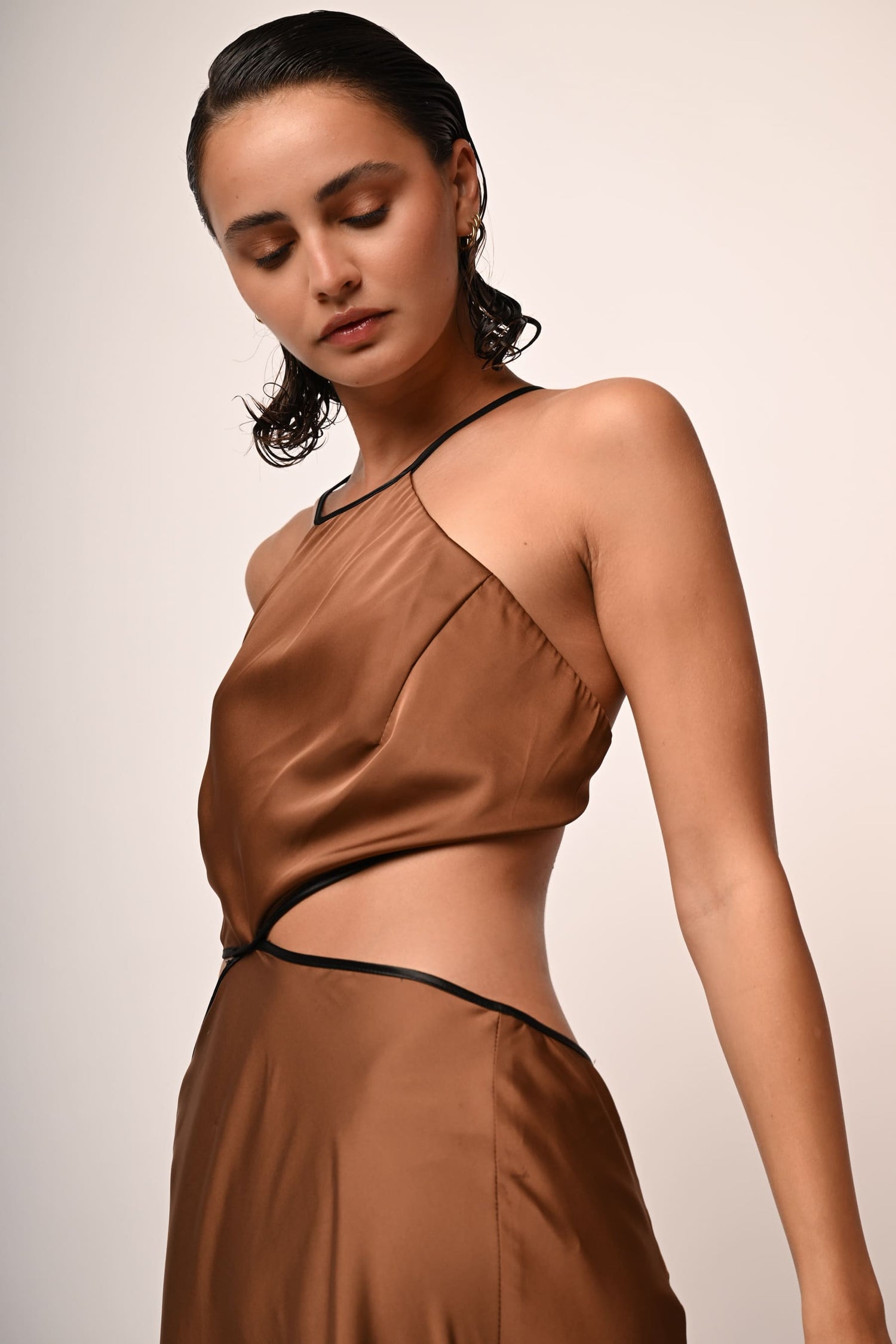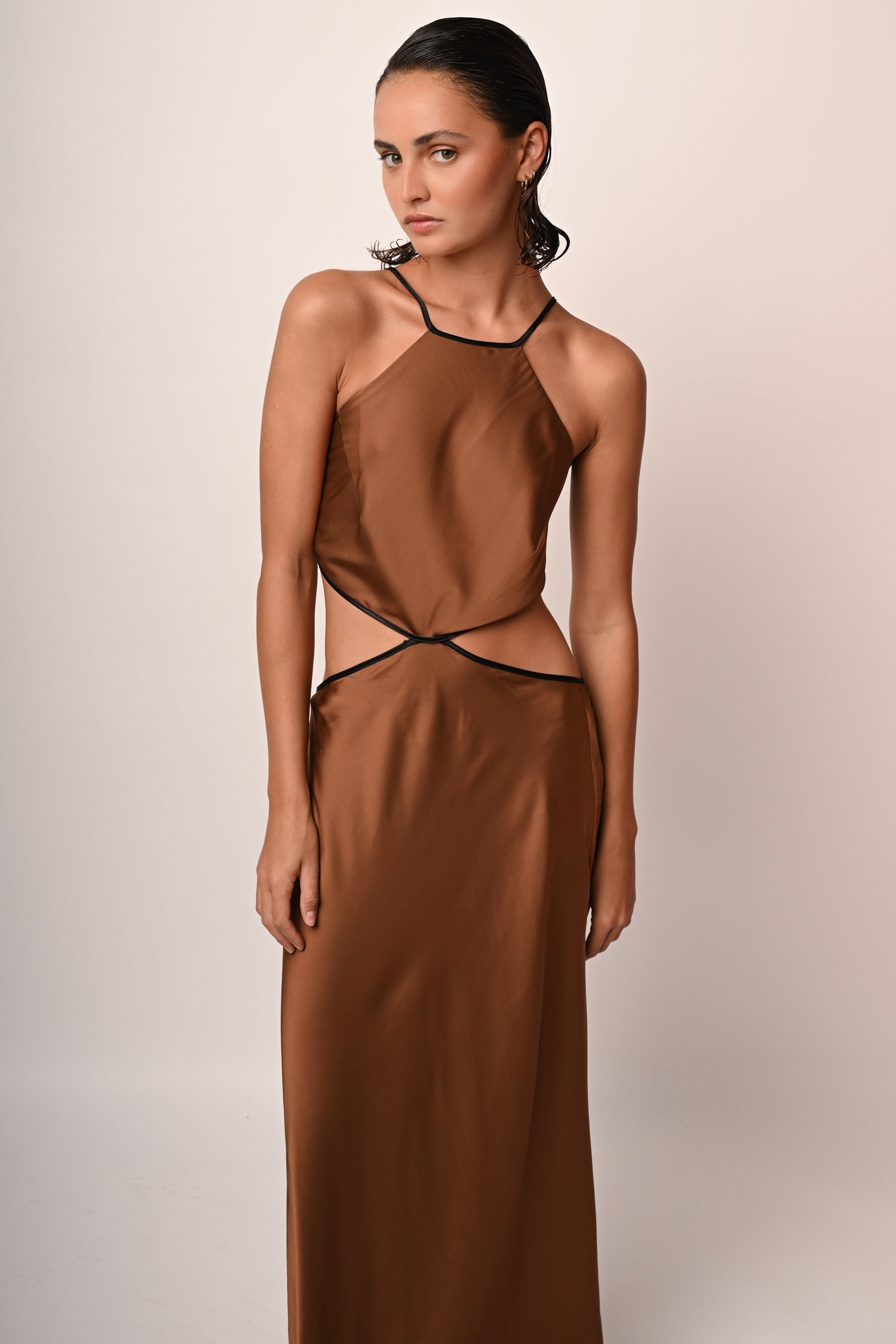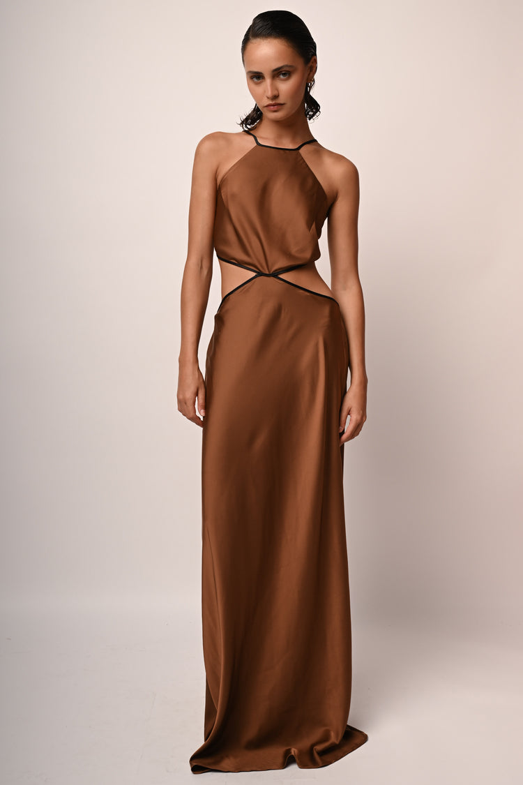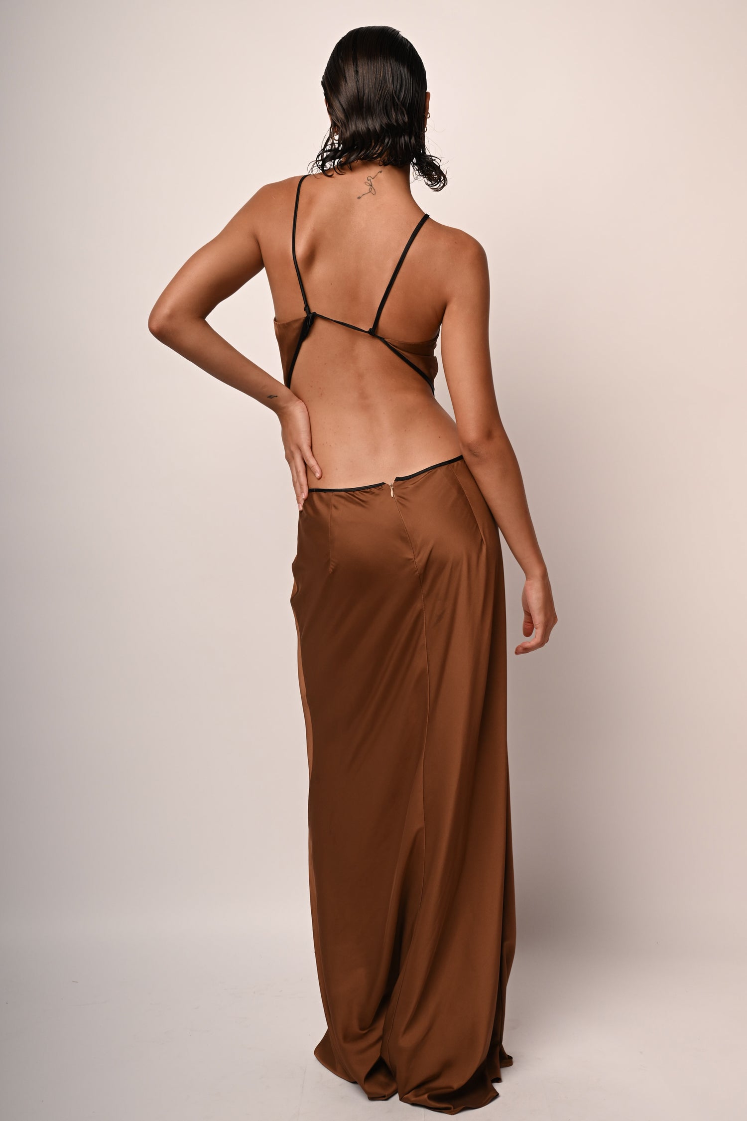 Abito lungo in raso stretch nuance caffè con spalline sottili da annodare sul retro, scollo dritto, cut-outs ai fianchi, schiena scoperta e chiusura con zip al centro dietro.