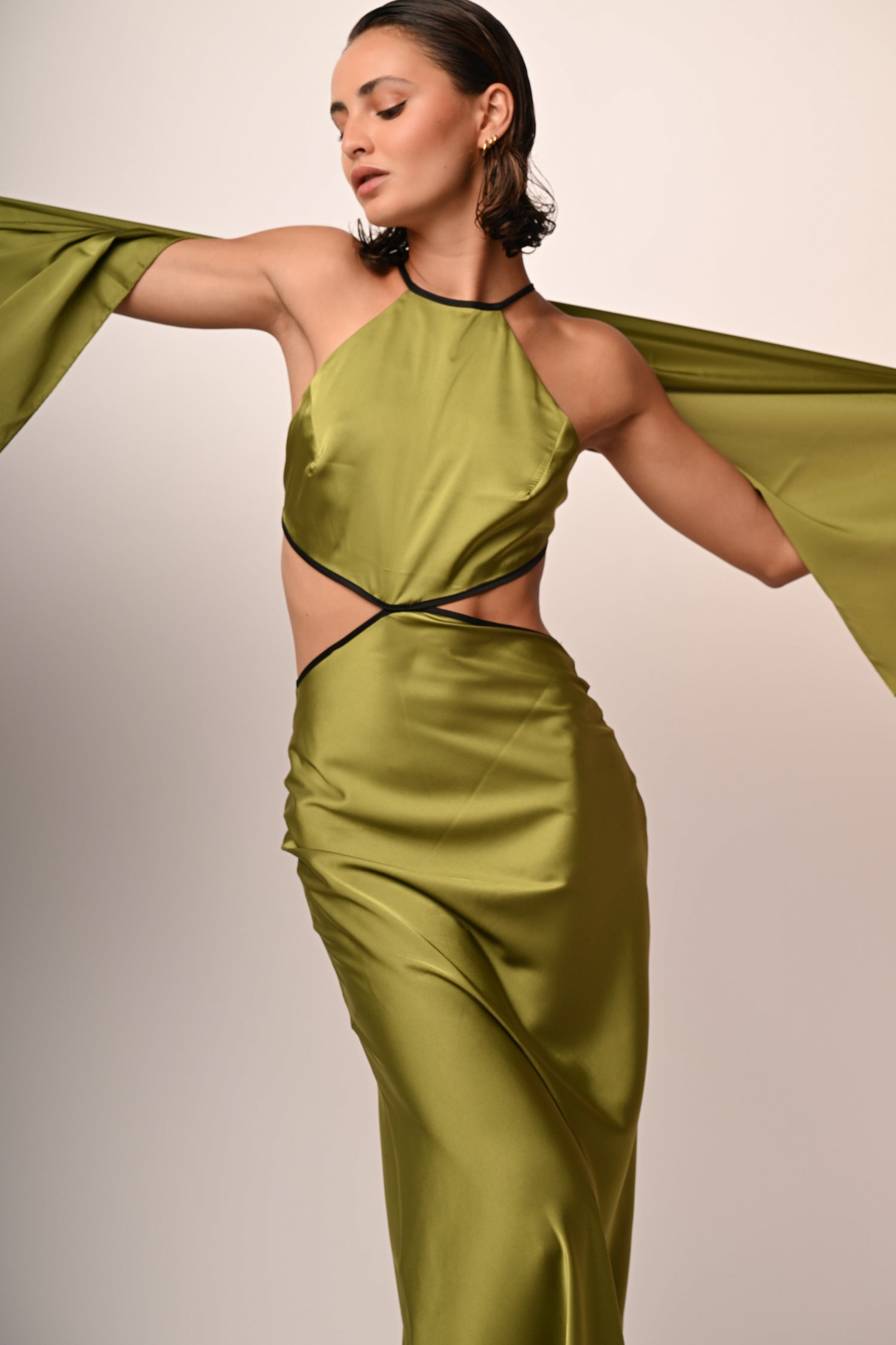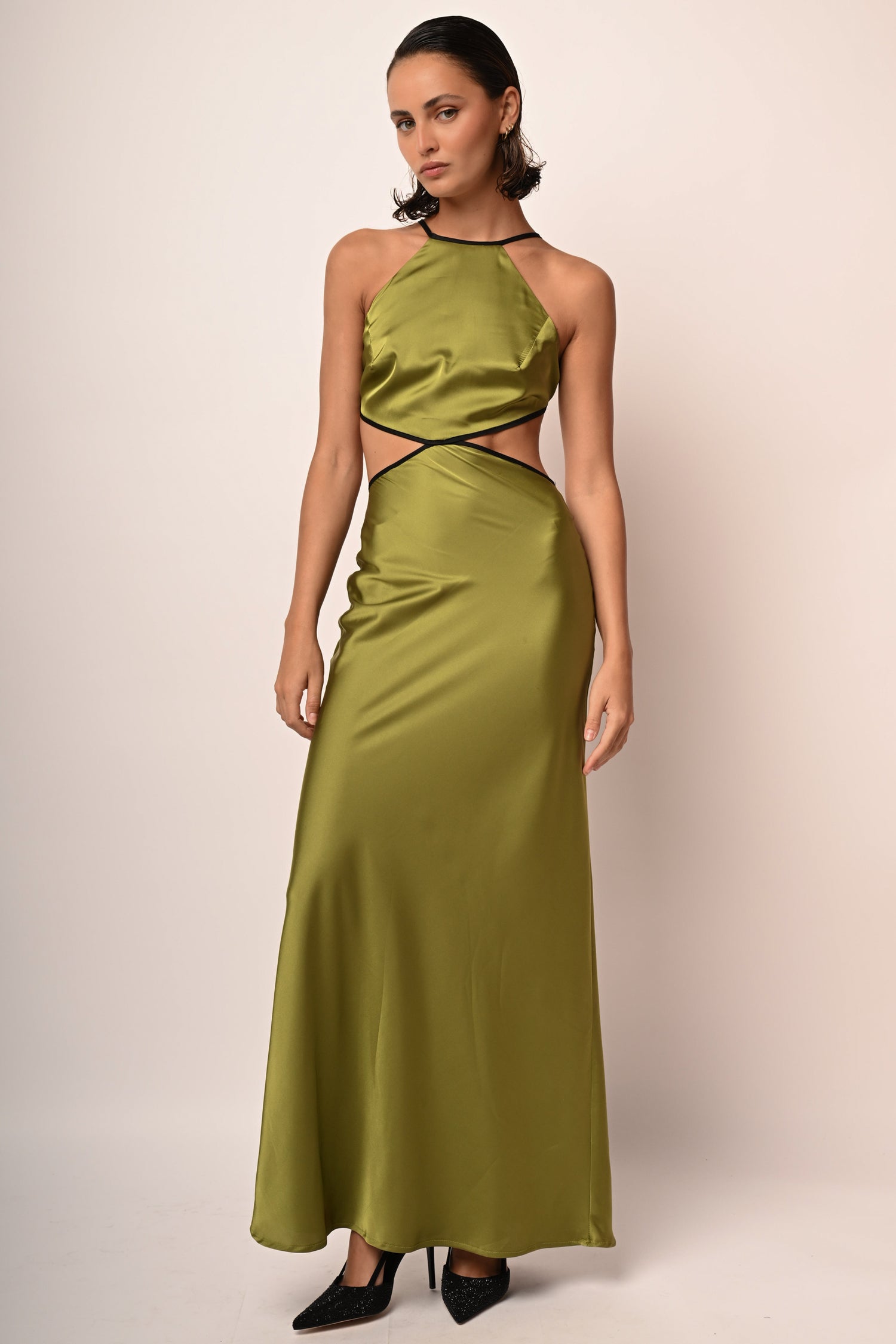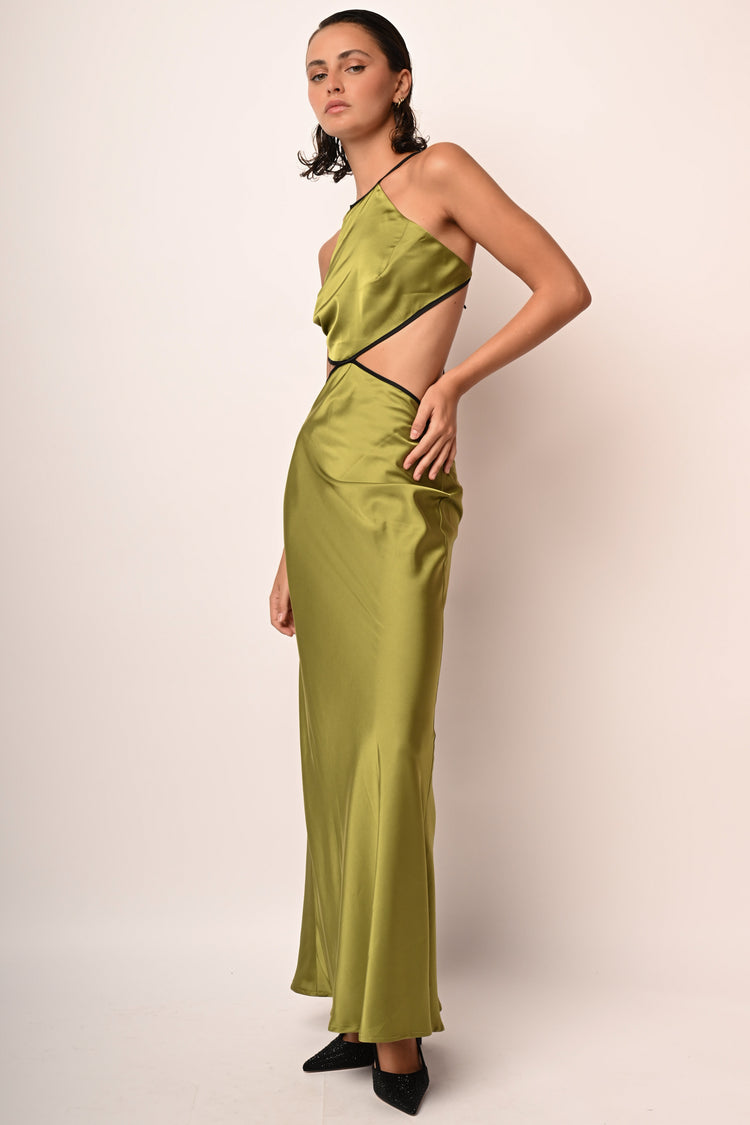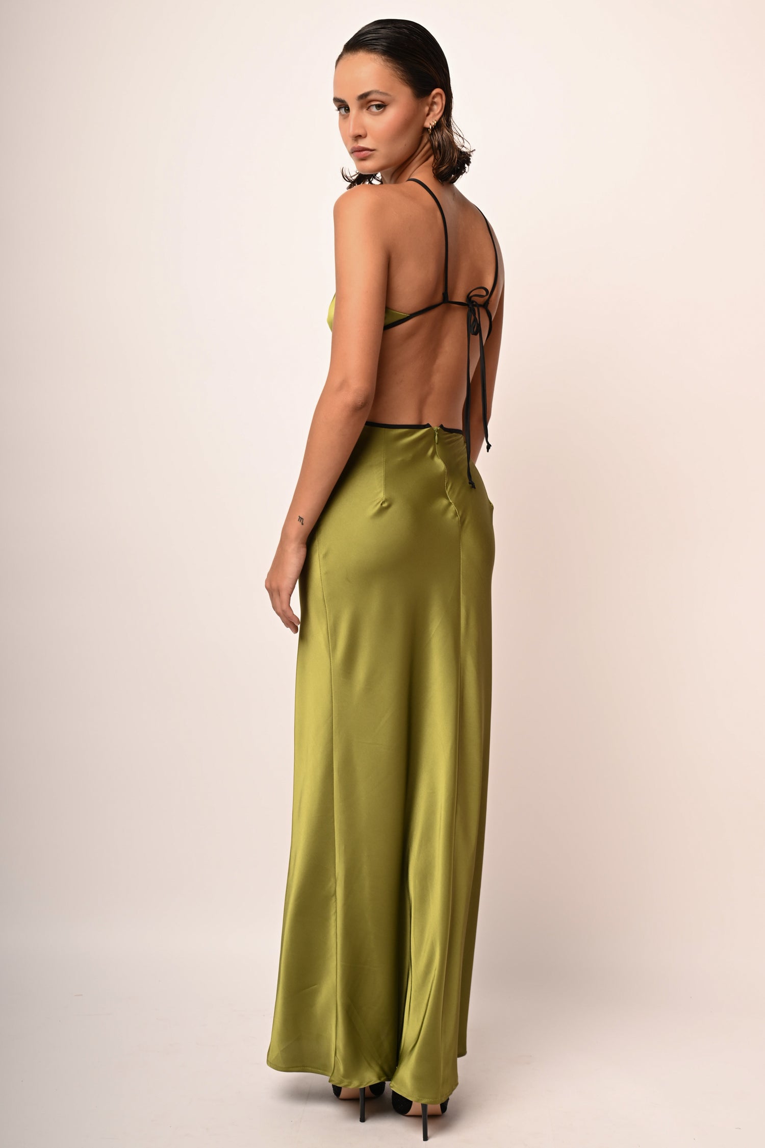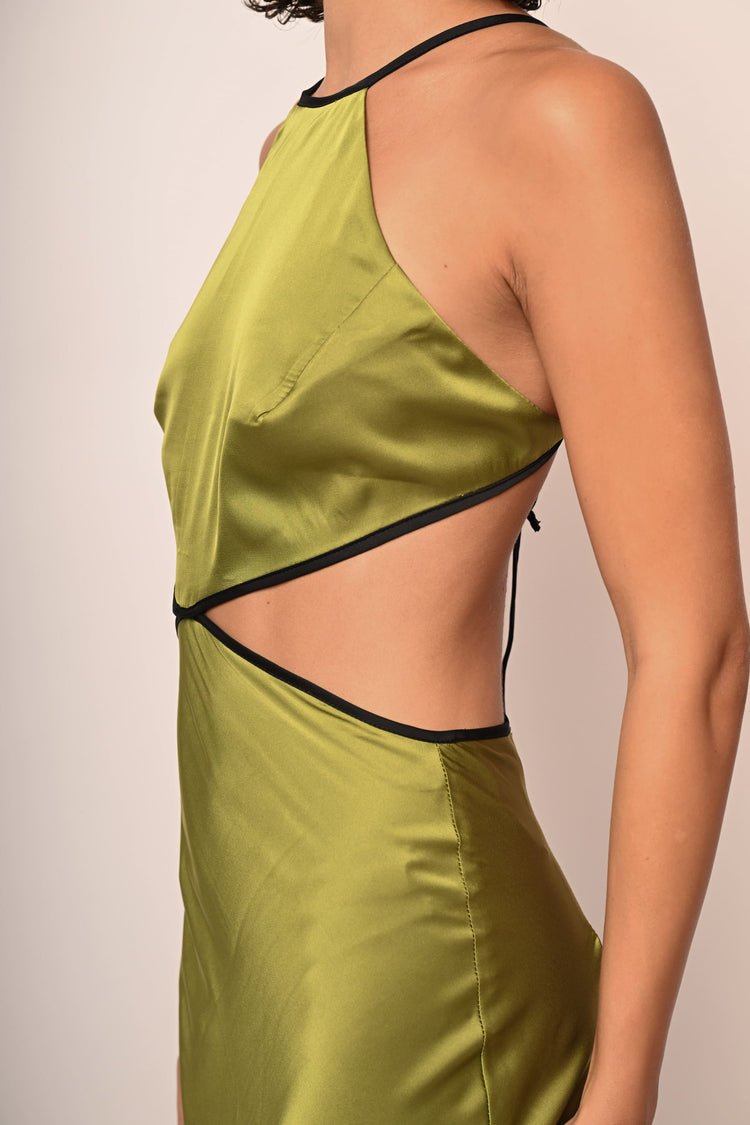 Abito lungo in raso stretch verde lime con spalline sottili da annodare sul retro, scollo dritto, cut-outs ai fianchi, schiena scoperta e chiusura con zip al centro dietro.