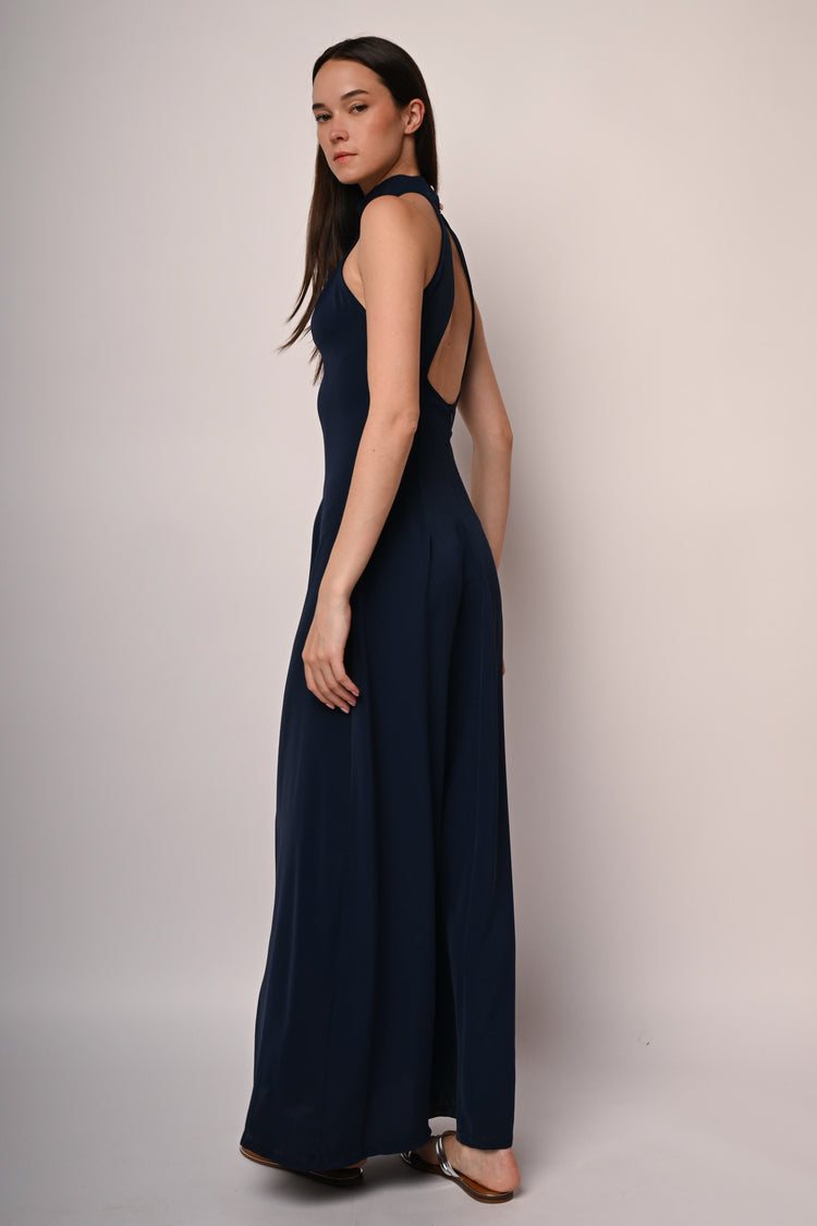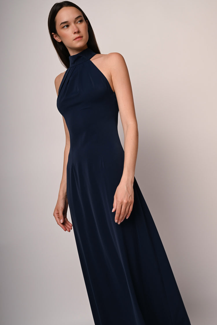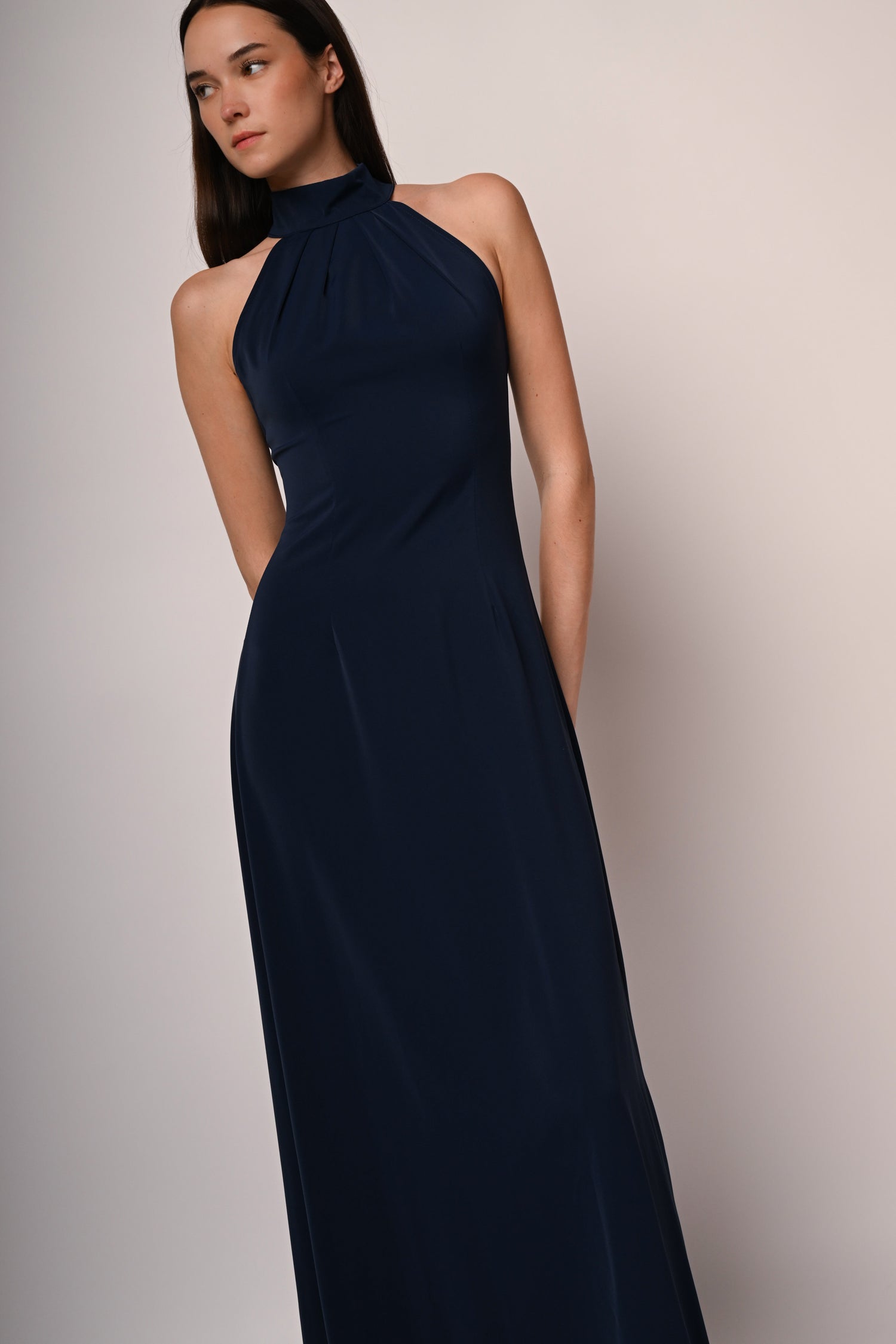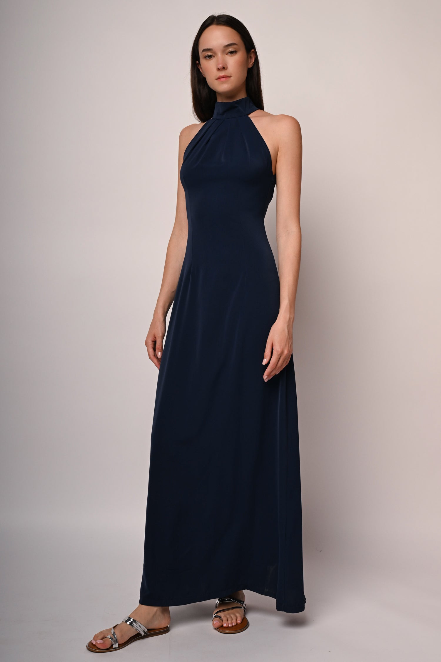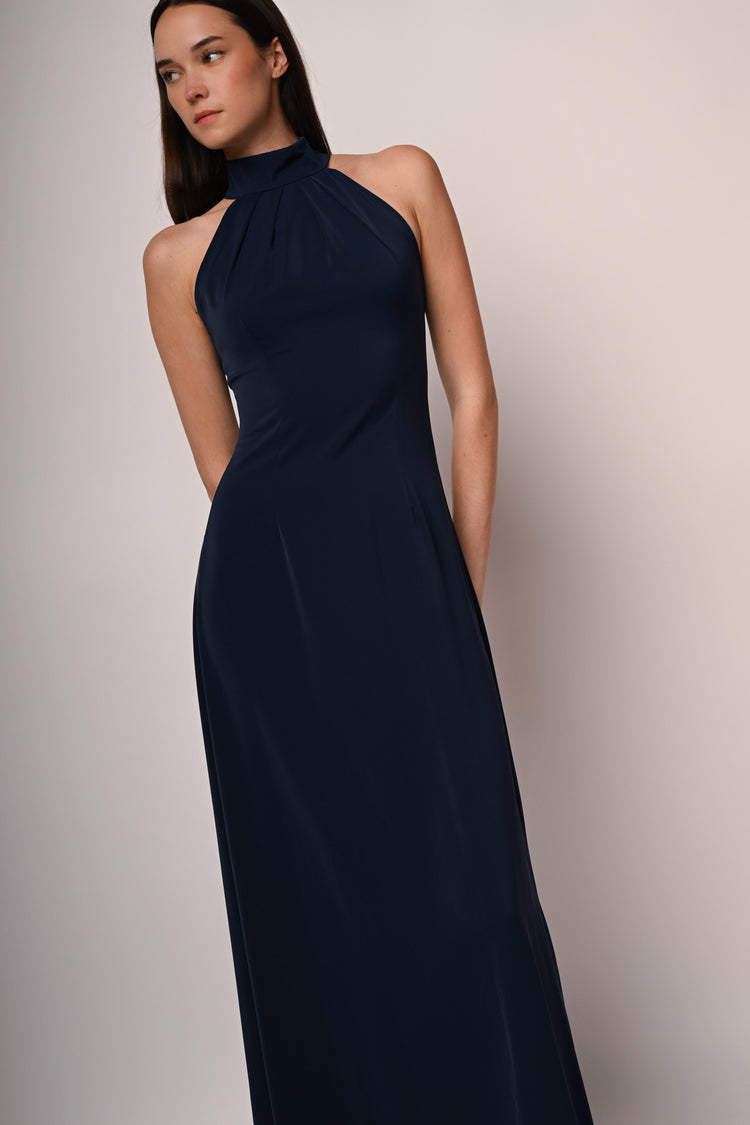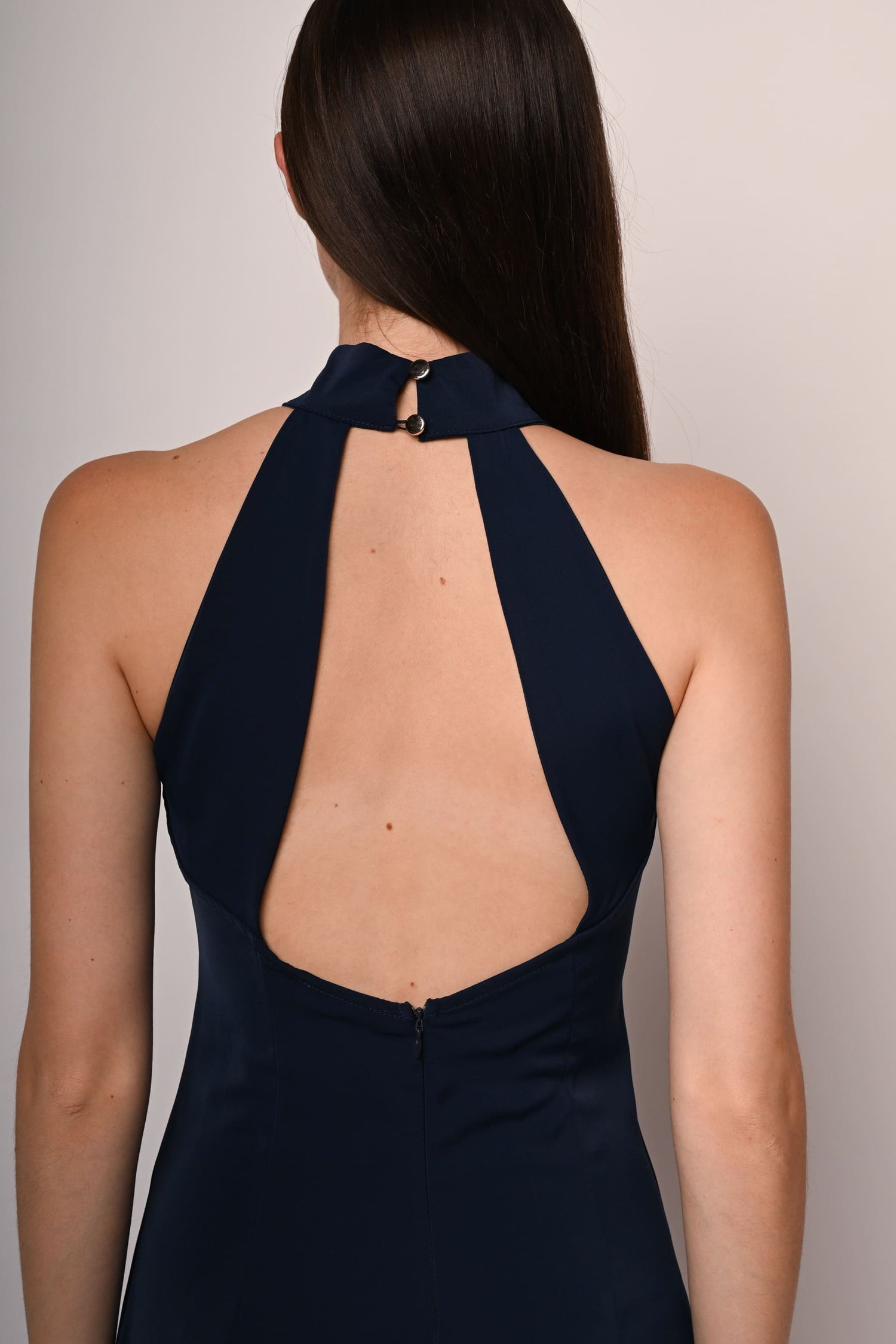 Abito lungo in tessuto blu scuro con taglio allamericana, pieghe a raggiera lungo lo scollo, ampio cut-out, bottoni e zip di chiusura sul retro e gonna svasata.