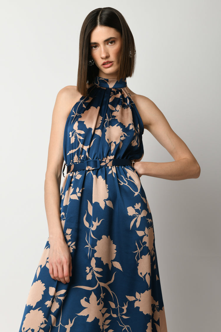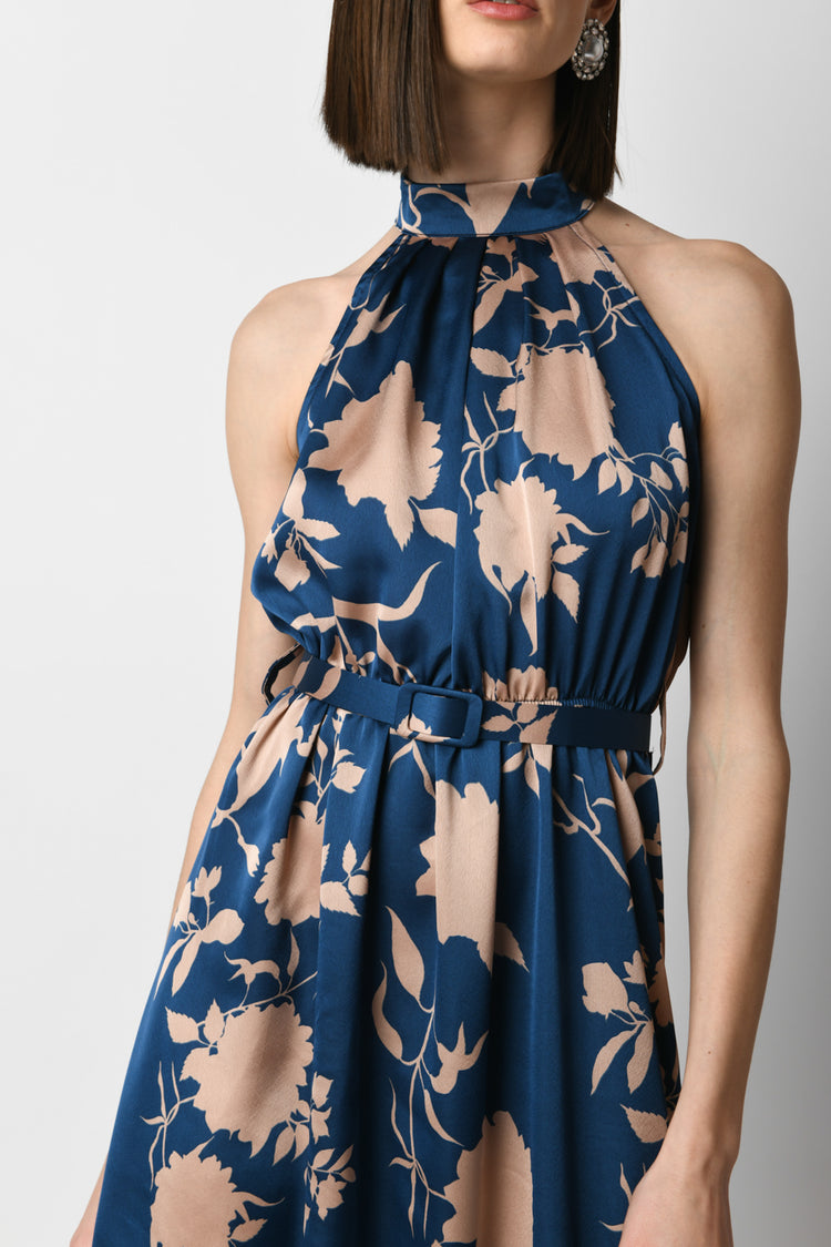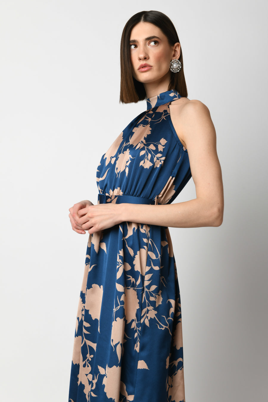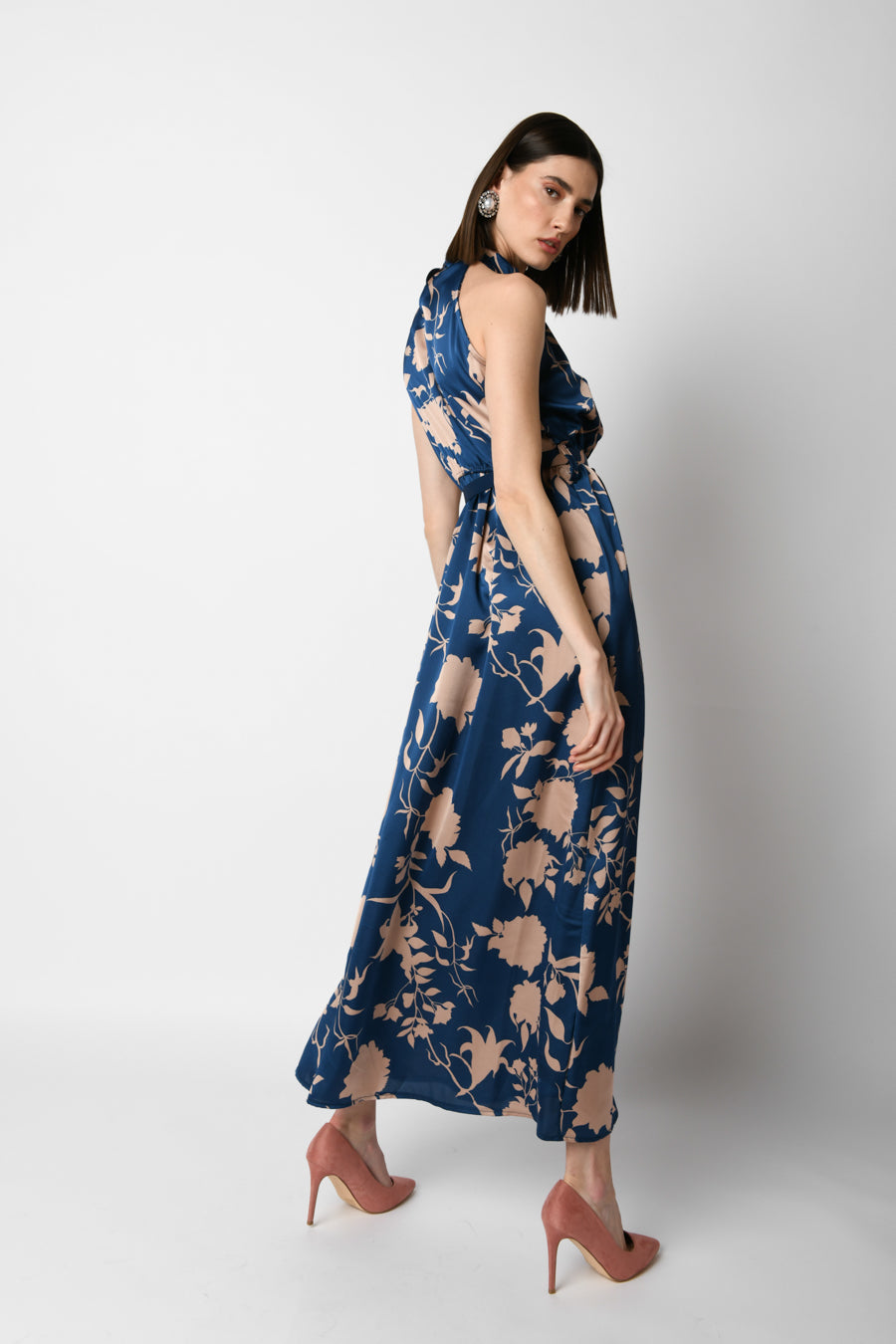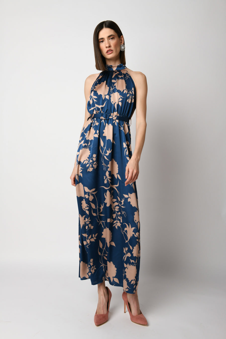 Abito lungo in raso a stampa floreale rosa nude su fondo blu con scollo allamericana, colletto alto, chiusura a goccia sul retro, vita elasticizzata + cintura coordinata con fibbia rettangolare.
