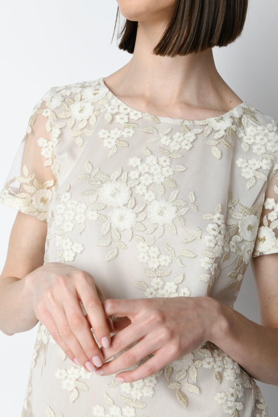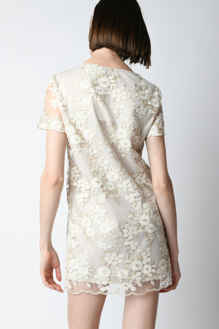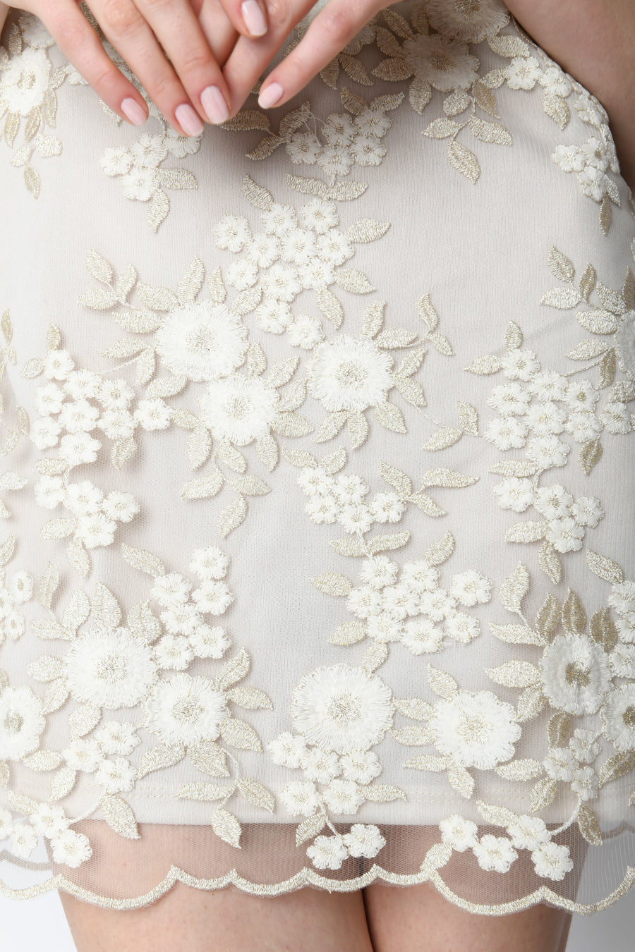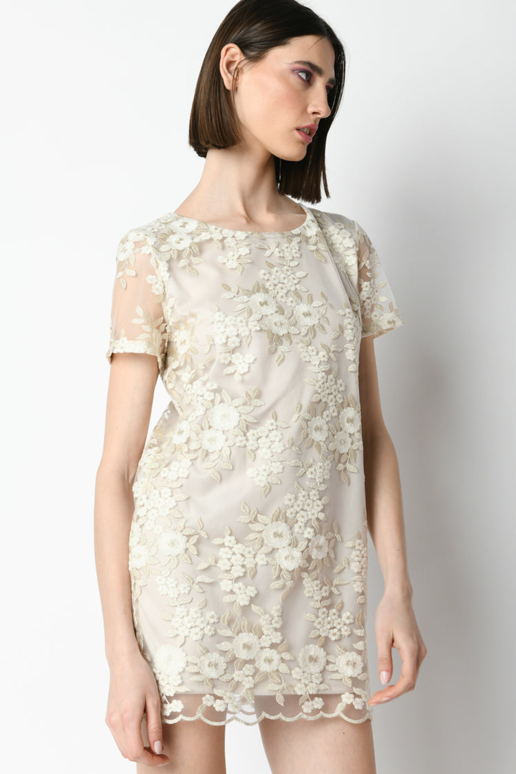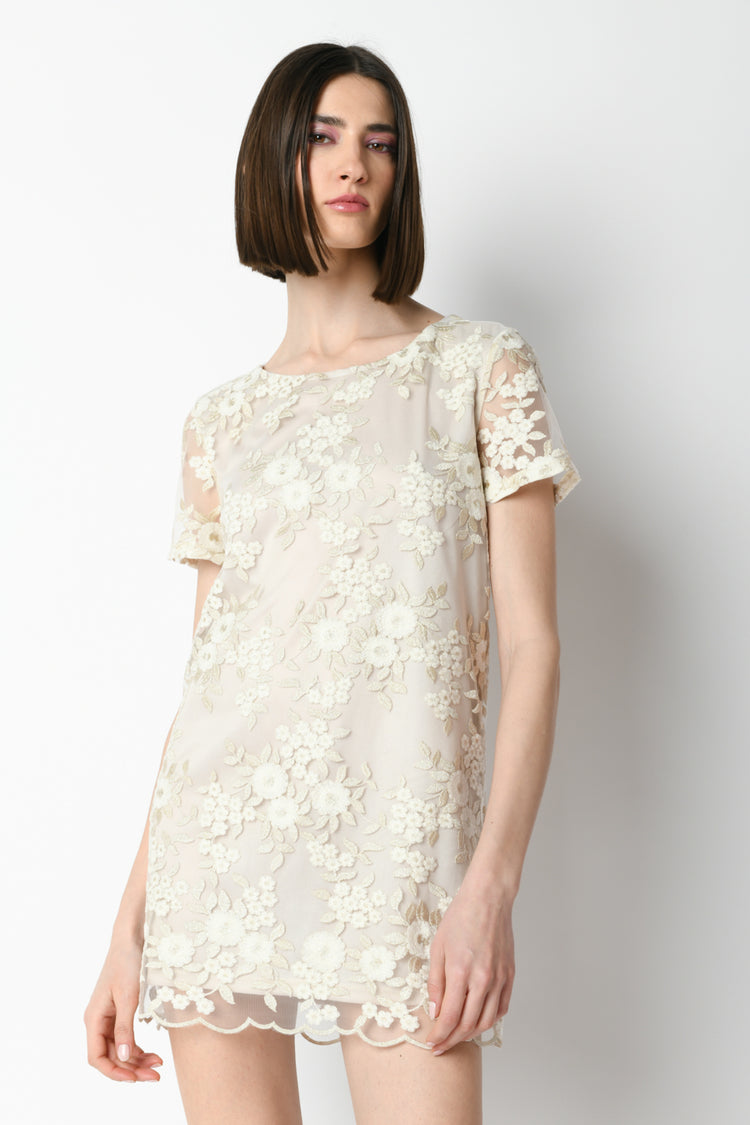 Mini abito in tulle trasparente foderato misto nylon bianco con ricami floreali tono su tono, scollo tondo, taglio dritto e orlo ondulato.