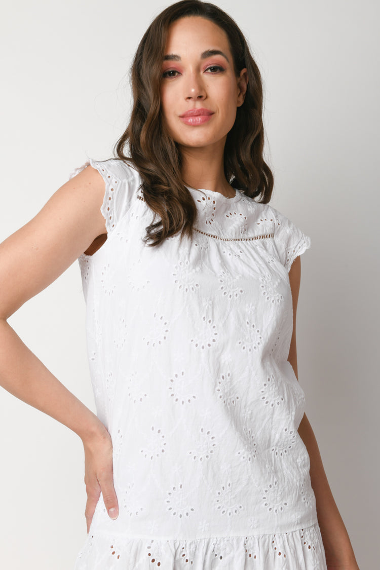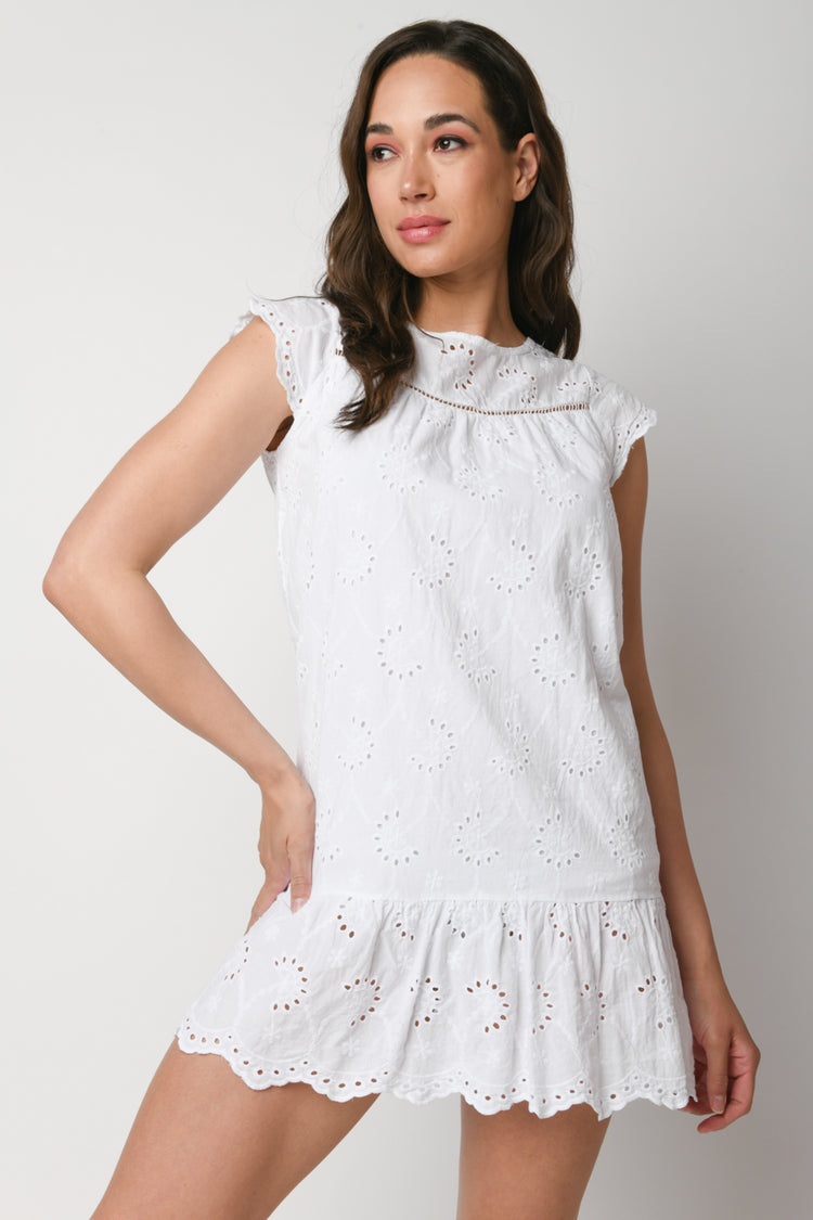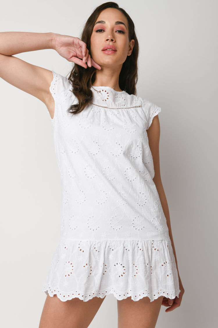 Mini abito in pizzo di cotone sangallo bianco con scollo tondo, maniche ad aletta, taglio dritto e balza al fondo.