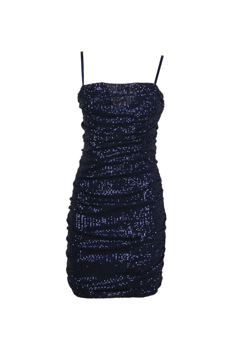 Mini abito in tulle blu impreziosito da paillettes all over con spalline sottili regolabili, scollo dritto e silhouette aderente e arricciata.