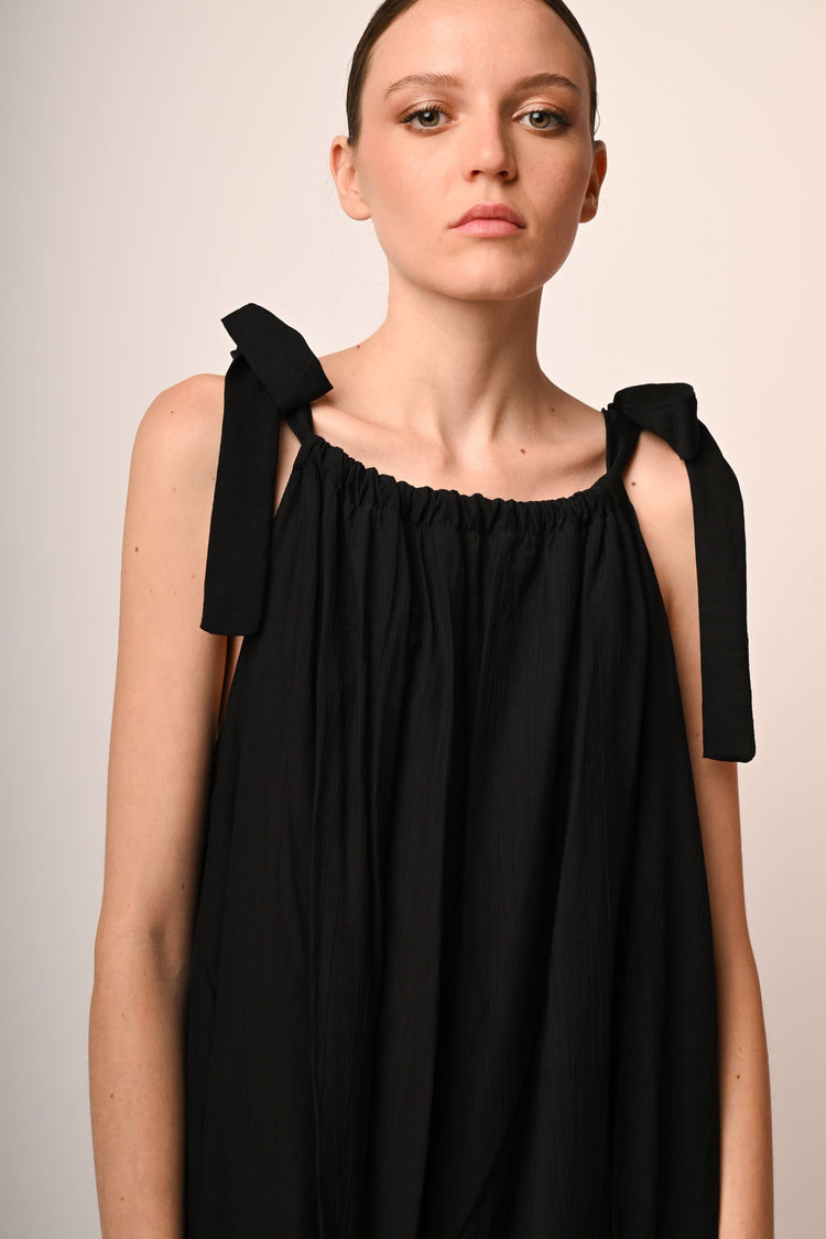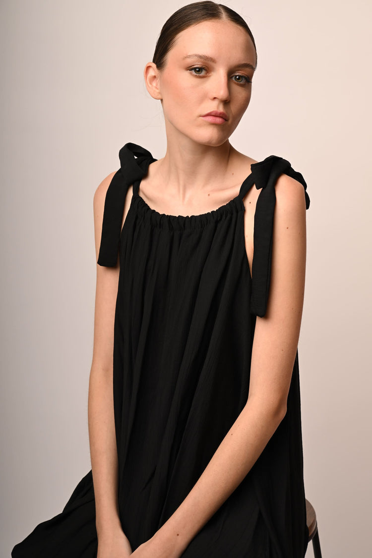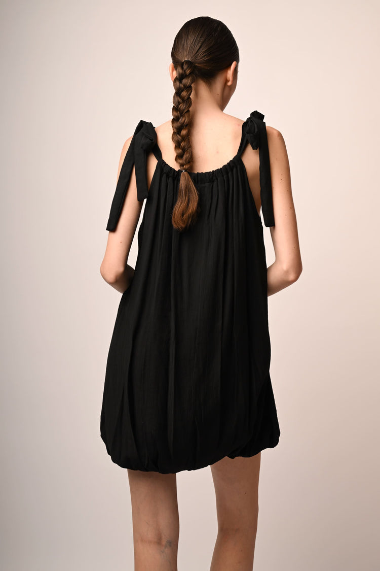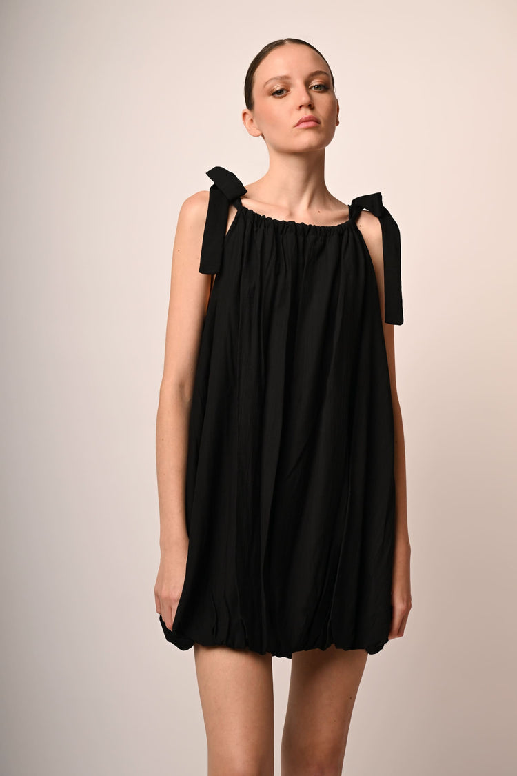 Mini abito a palloncino misto viscosa nero con scollo arrotondato, spalline sottili da annodare a fiocco e silhouette morbida e drappeggiata.