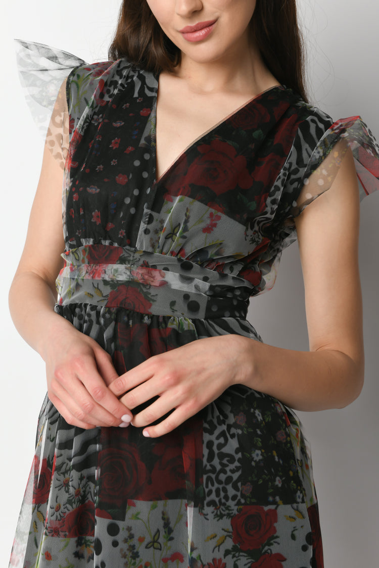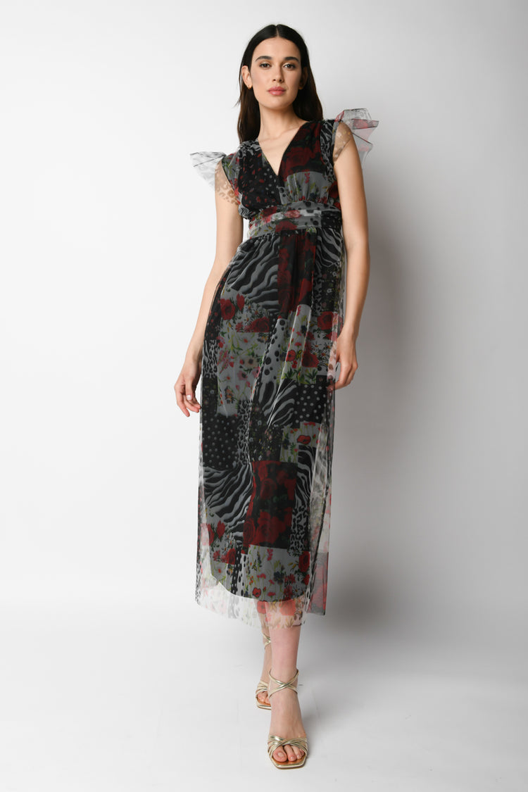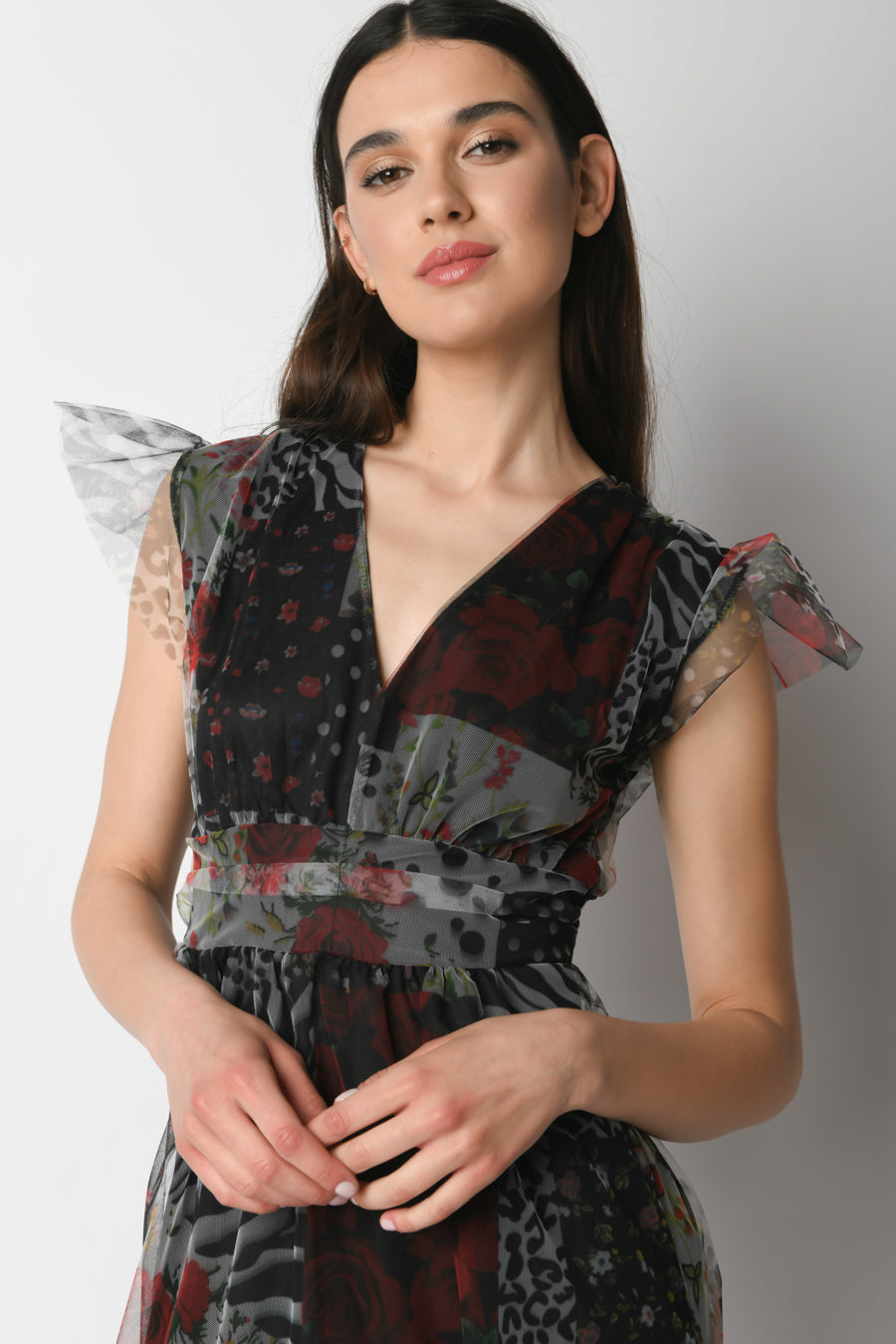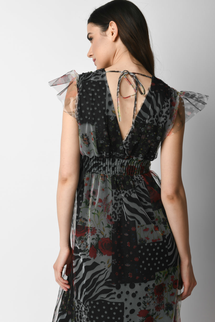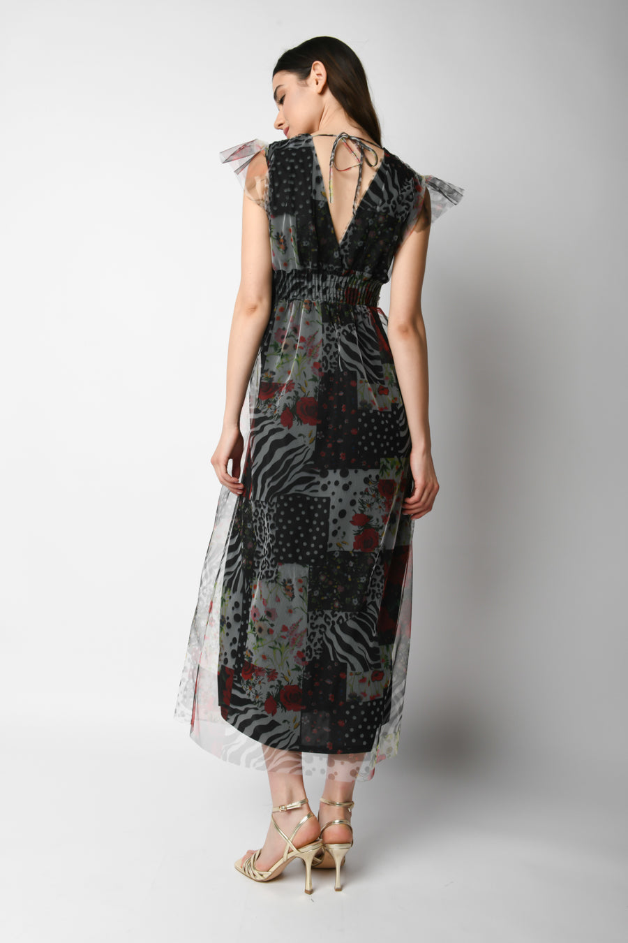 Abito lungo in tulle foderato a stampa patchwork multicolor con scollo a V, maniche ad aletta, nastrini sottili da annodare sul retro dello scollo, vita elasticizzata a punto smock sul retro e gonna dritta.