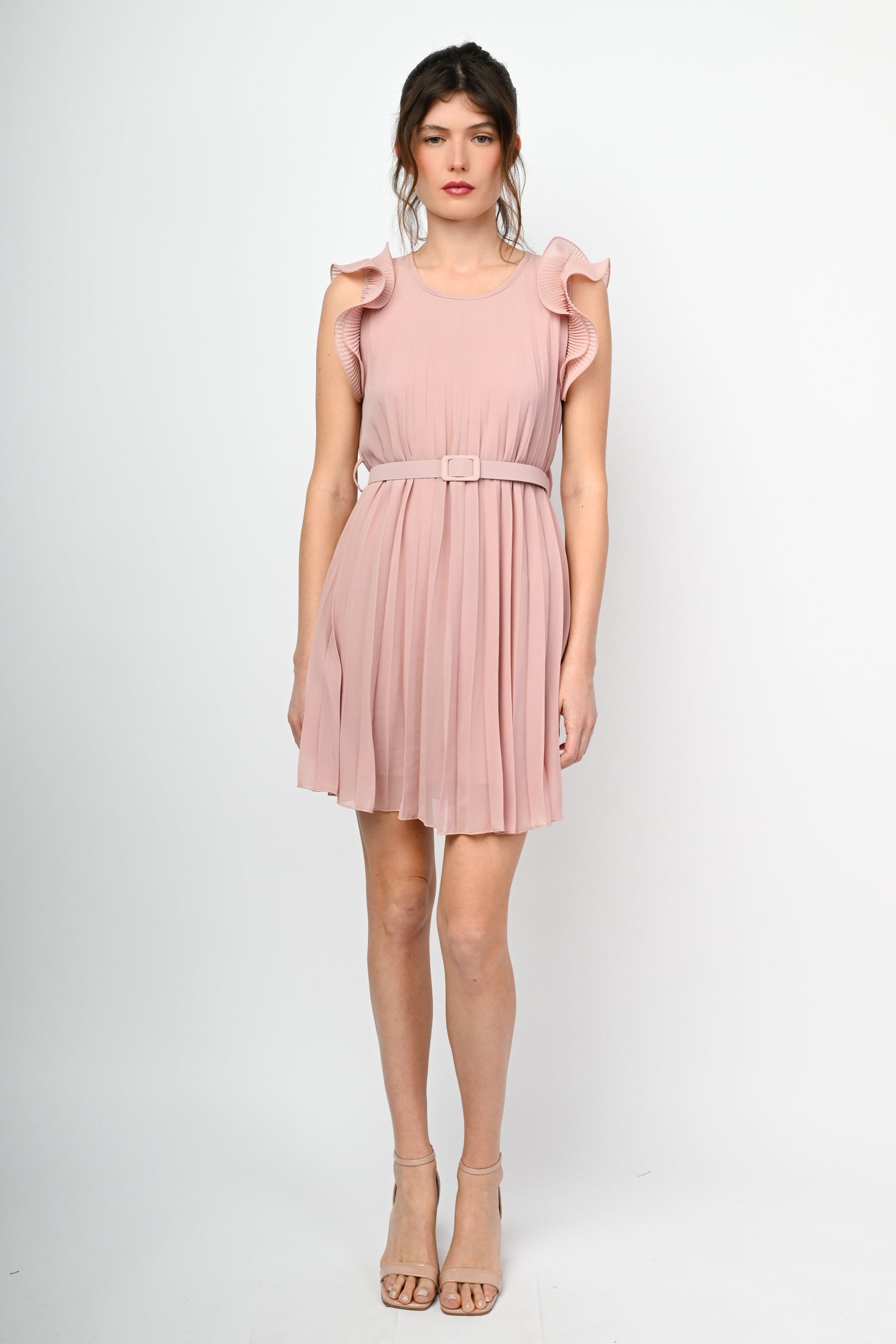 Mini abito in tessuto plissettato rosa con scollo tondo, maniche a volants 3D in tessuto plissé, cintura coordinata alla vita con fibbia rettangolare tono su tono, taglio svasato e chiusura a goccia con bottone sul retro.