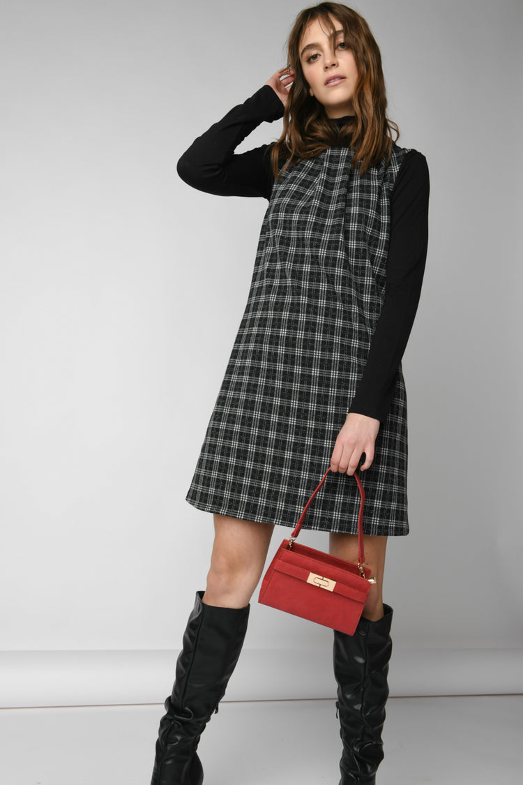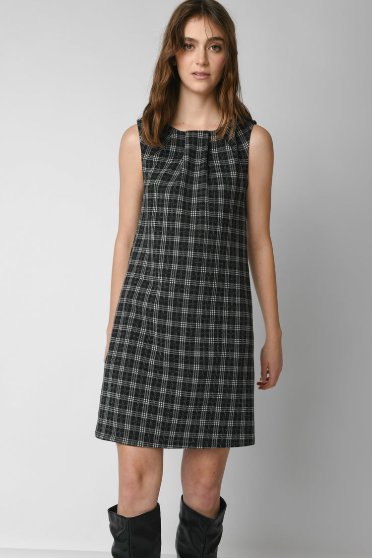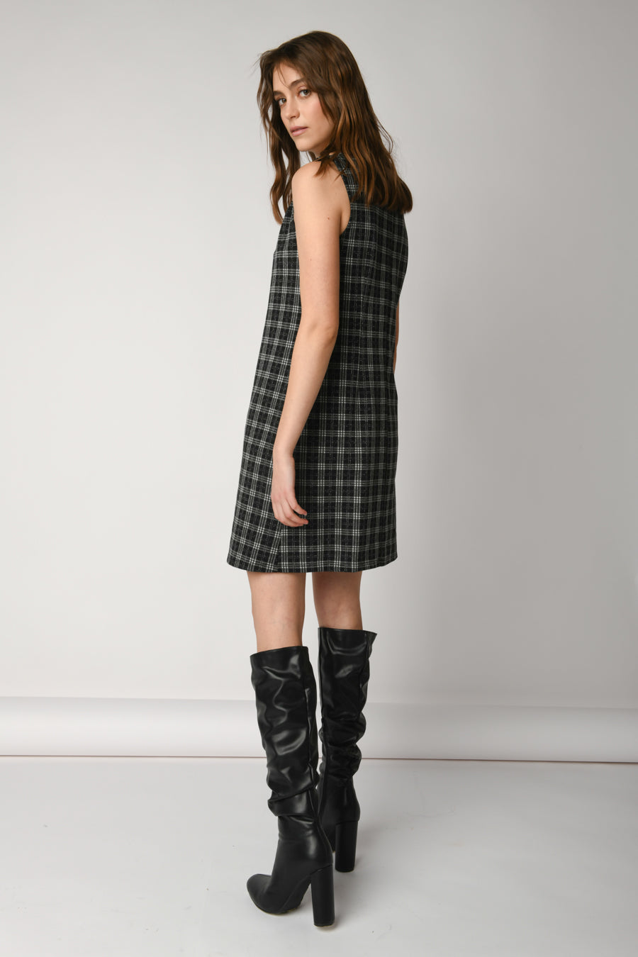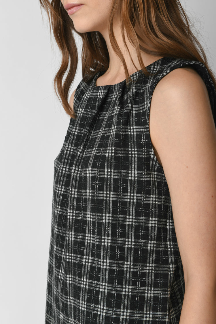 Abito in jacquard lurex misto cotone con motivo check su fondo nero, scollo tondo con pieghe frontali e taglio leggermente svasato.