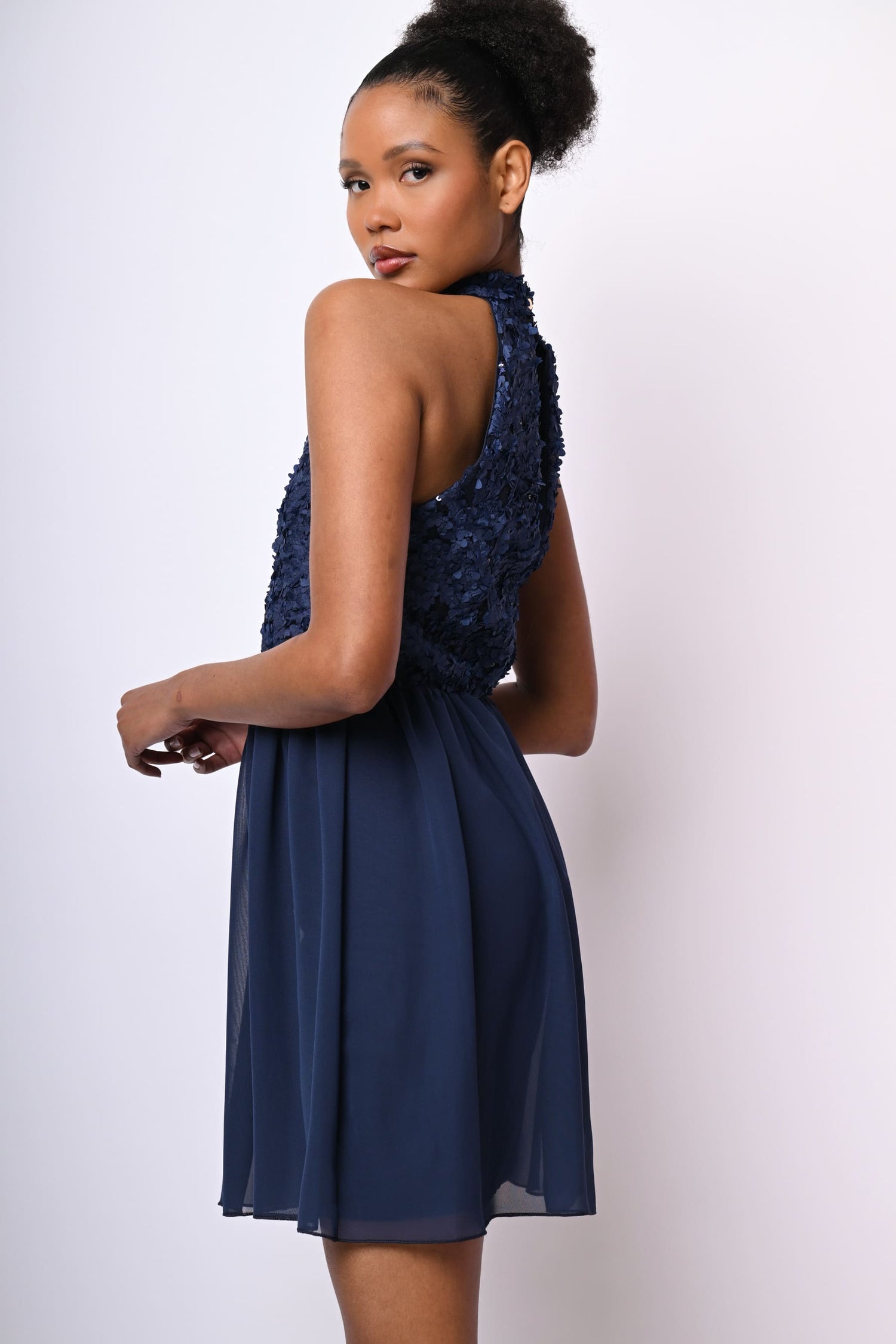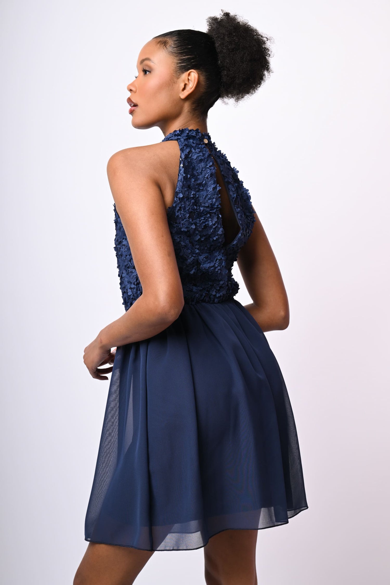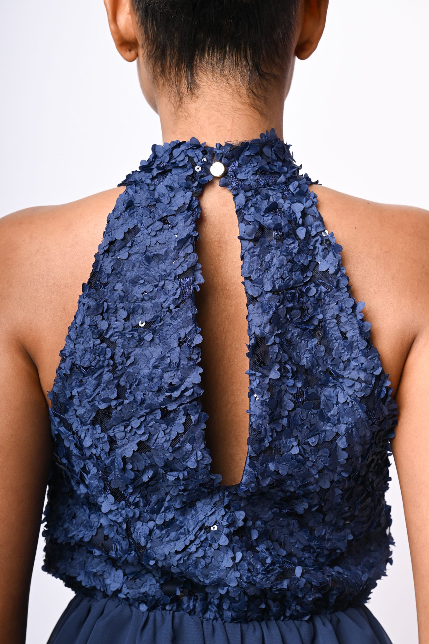 Mini abito in tulle blu con taglio allamericana, corpetto impreziosito da fiori 3D e paillettes, scollo a goccia sul retro chiuso da bottone, vita elasticizzata e gonna svasata e foderata.